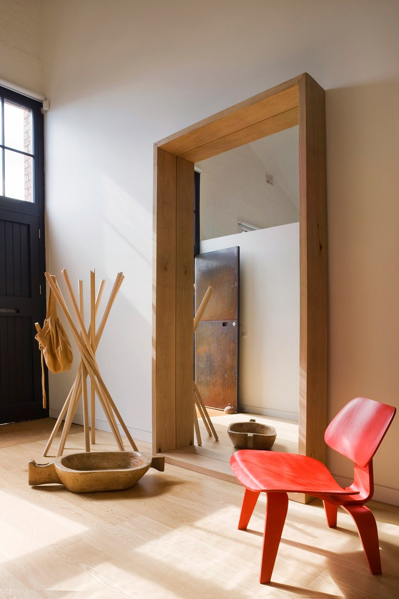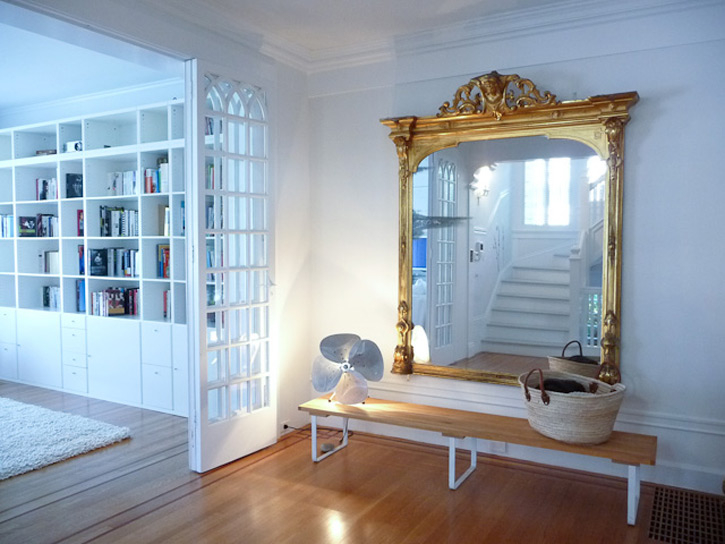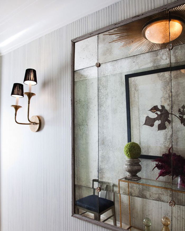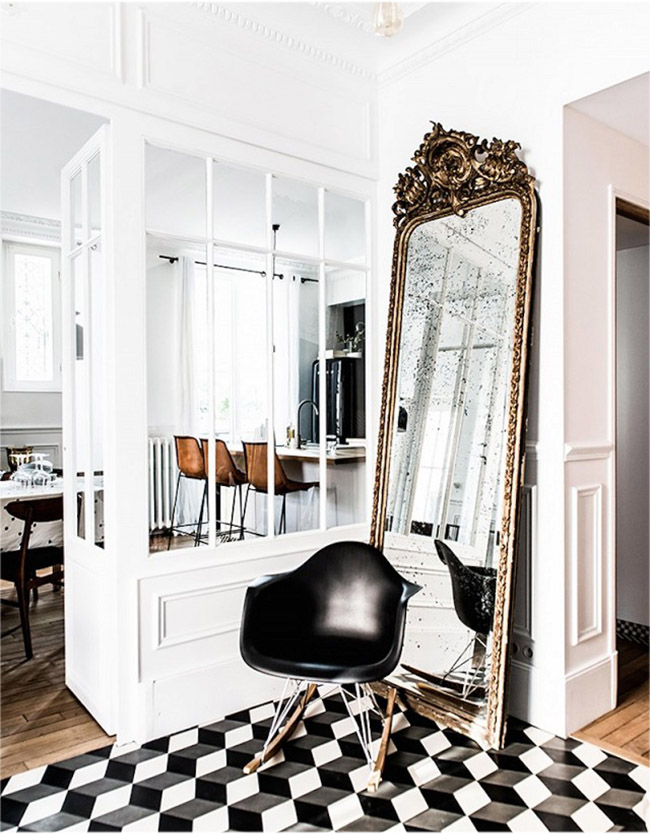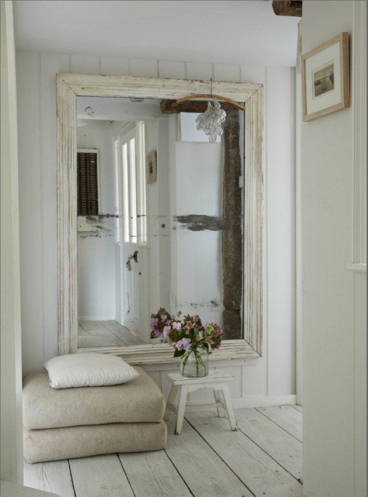 Ótima combinação - moldura branca ou baguete forjada. Substituir o espelho baguete pode ser feito em treliça com uma mesa de madeira.
