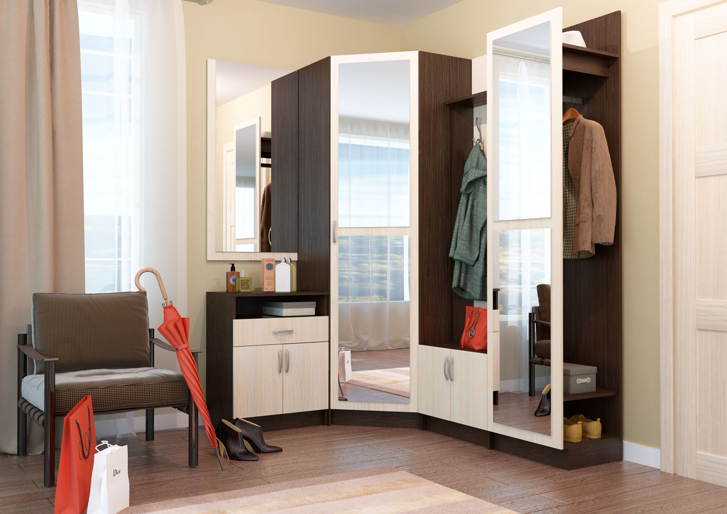 - Esquina. Este tipo de mobiliário vai se encaixar perfeitamente em uma sala quadrada com ângulos corretos. Eles podem ser armazenados e escovas para sapatos e outerwear (casacos e jaquetas).