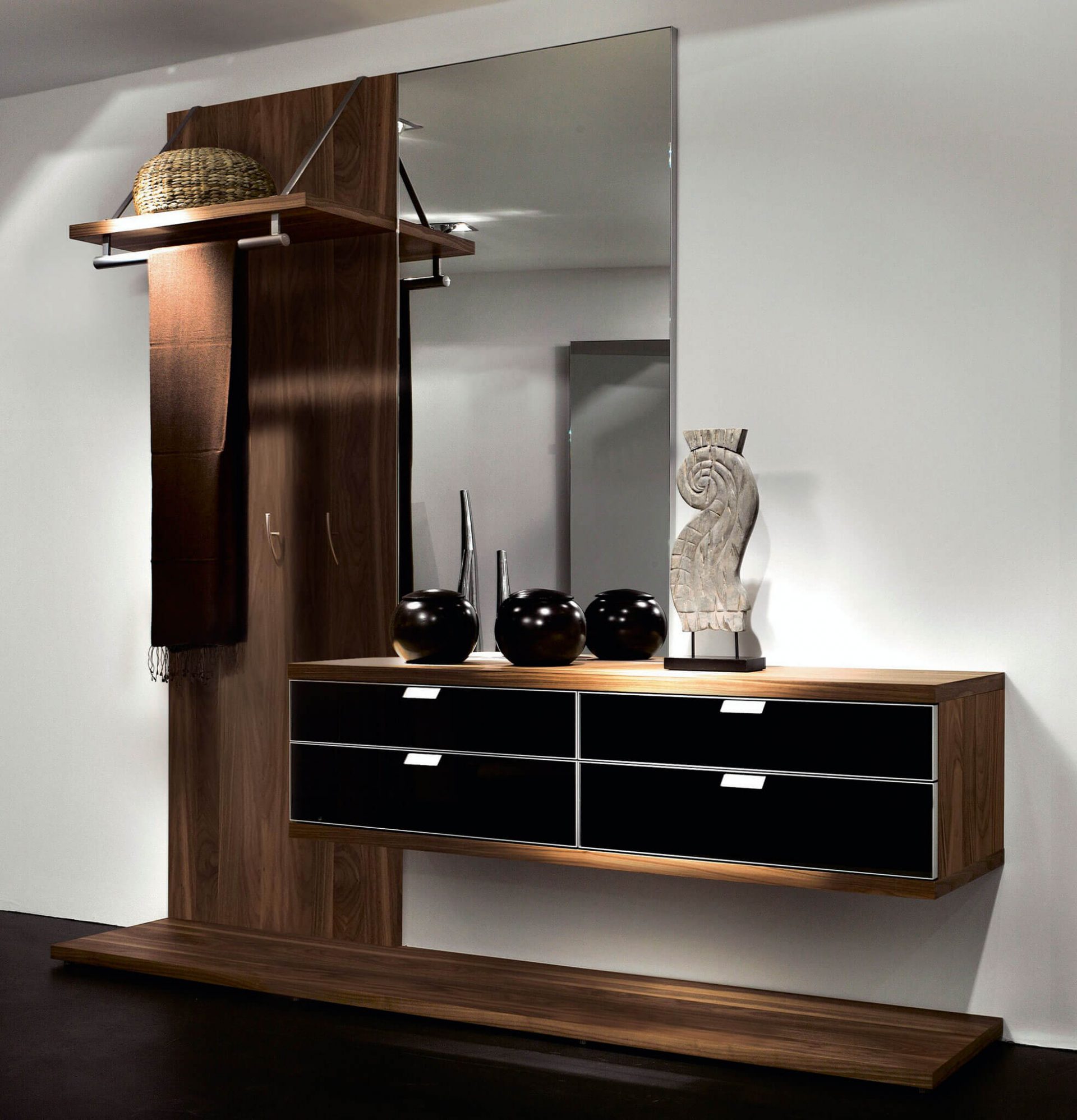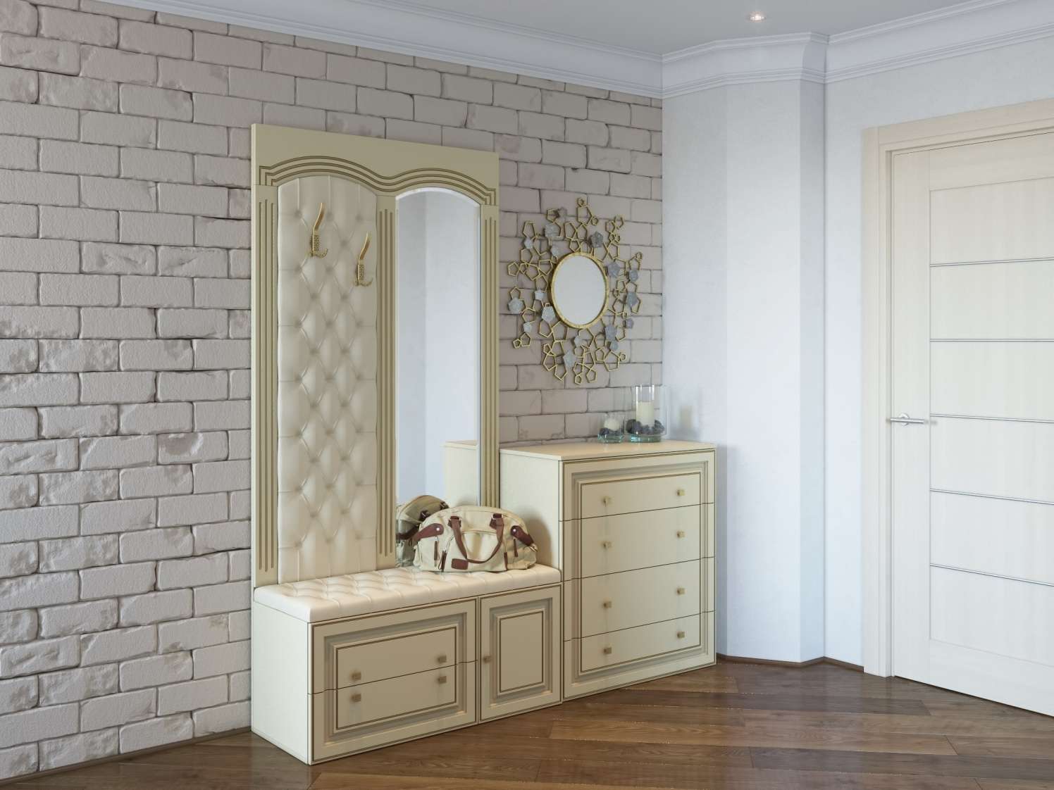 Muitas prateleiras convenientes - um critério importante ao escolher móveis no corredor. Uma das opções convenientes é um espelho com um espelho. Os mais caros são feitos na Itália, mais barato - na Rússia. A cômoda é adequada para um hall de entrada no estilo de:
