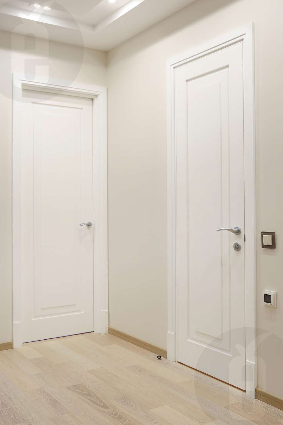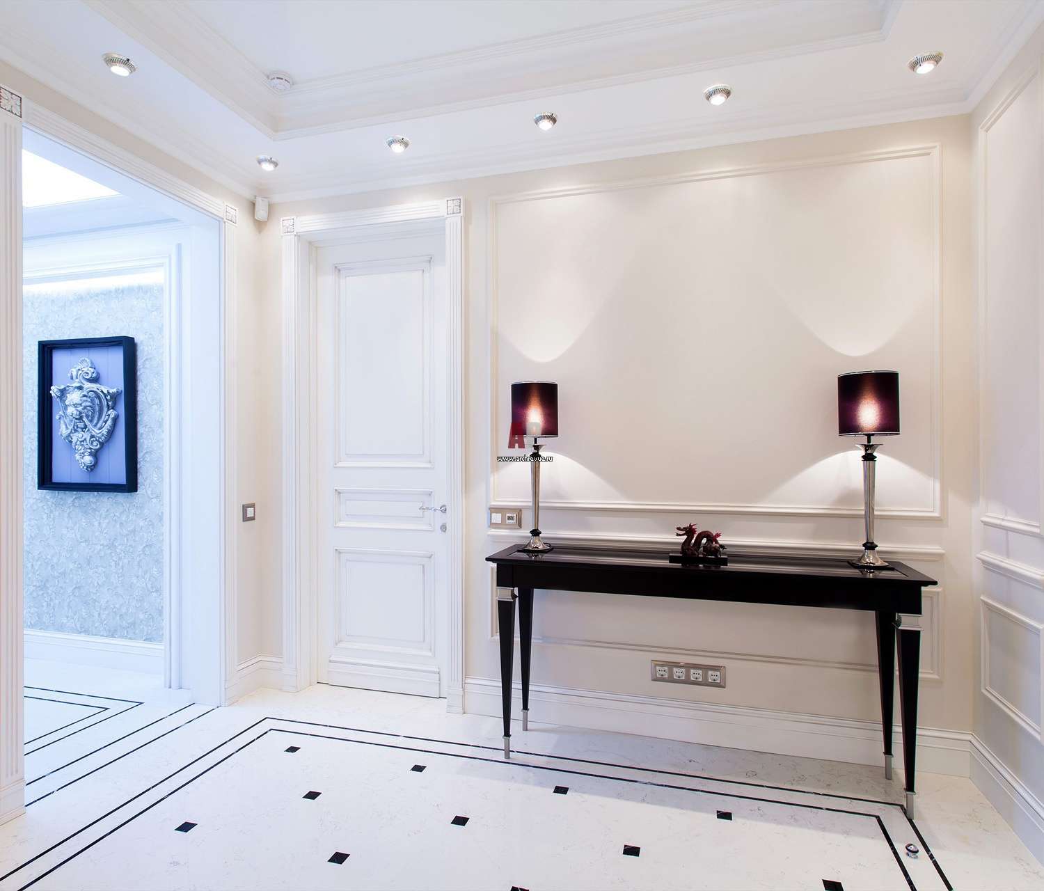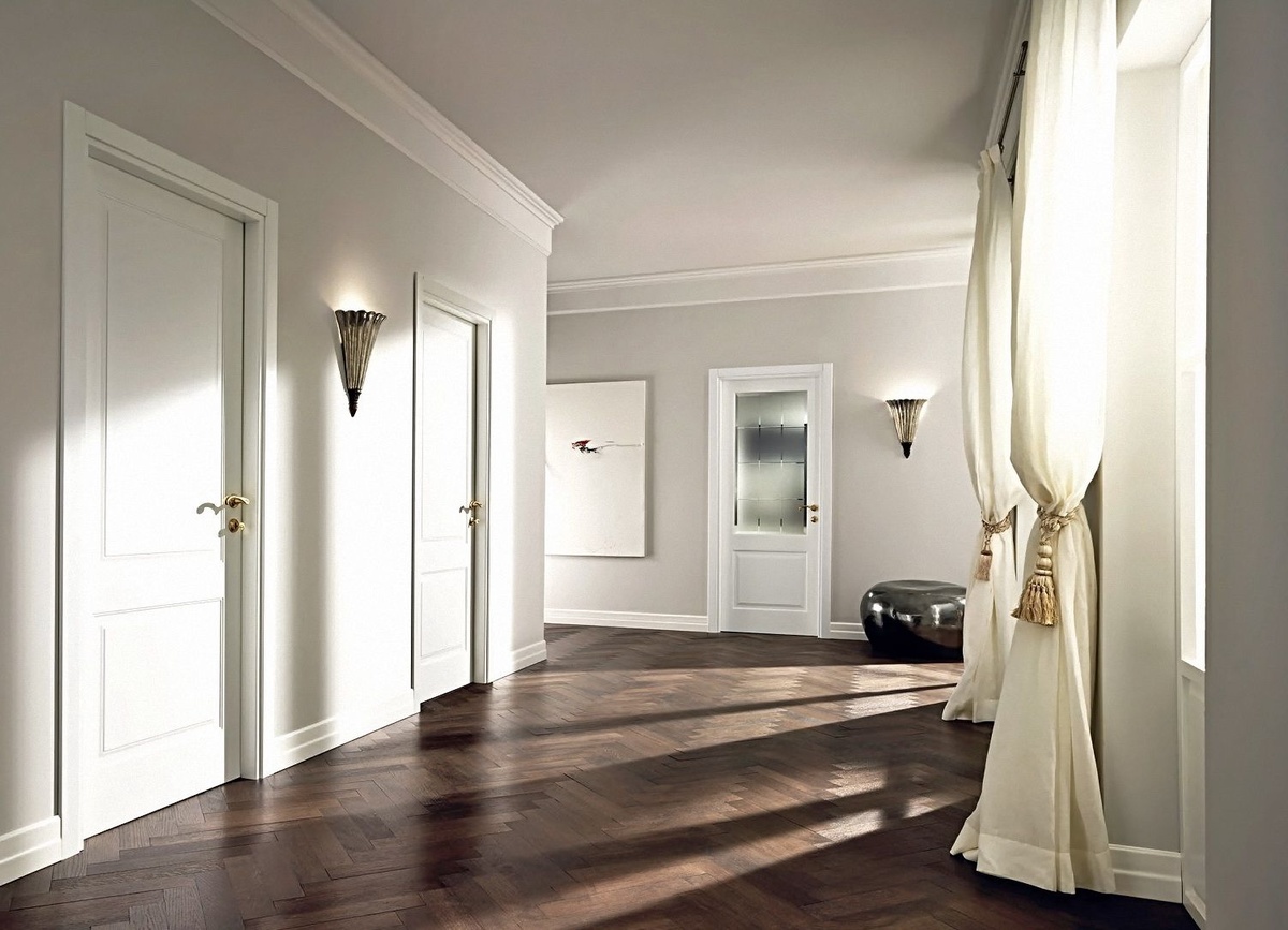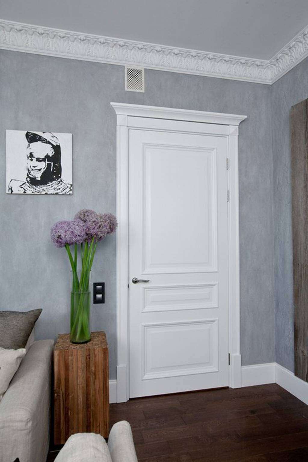baseboards สีขาวประตูและเพดานเรียบเพิ่มความสง่างามให้กับการตกแต่งภายในใด ๆ ก็ดูมีราคาแพง