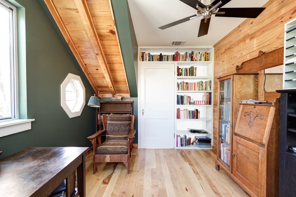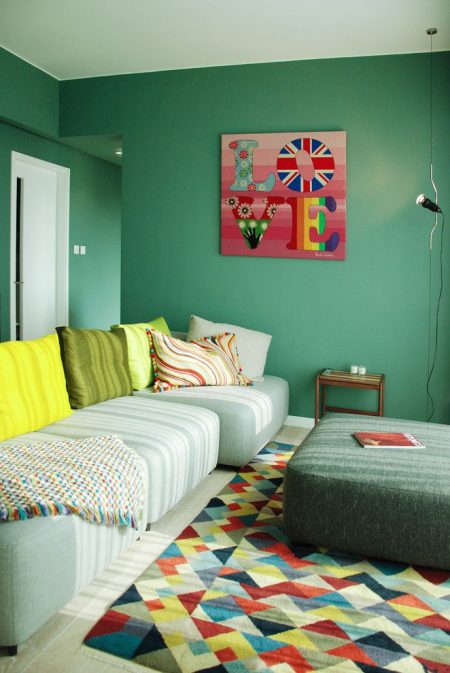 นอกจากนี้ยังมีลักษณะที่น่าประทับใจเมื่อพื้นประตูกรอบหน้าต่างและเฟอร์นิเจอร์เป็นสีขาวและผนังมีสีเขียวม่วงและน้ำเงิน