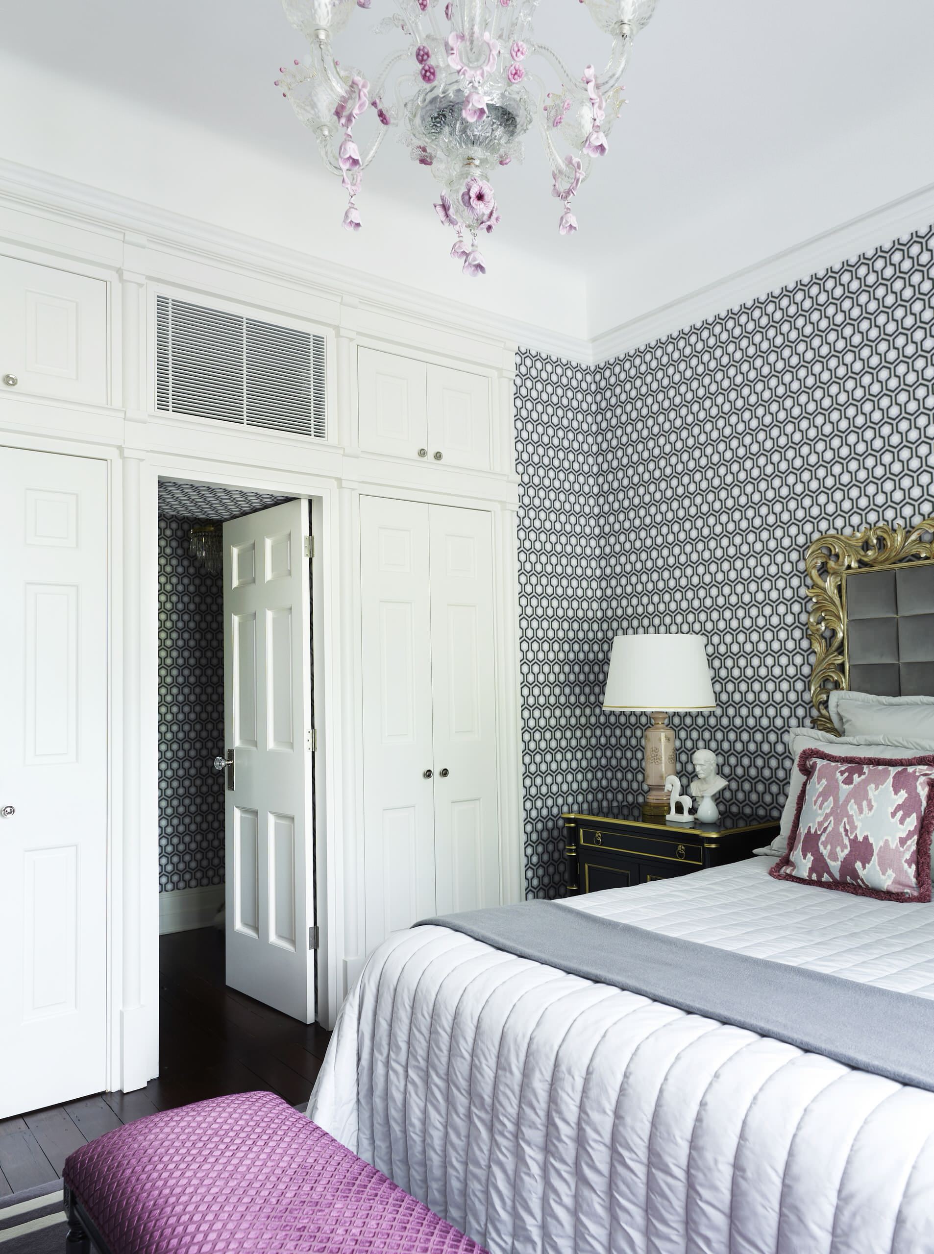 ผนังสีม่วงเข้มดูหรูหราด้วยประตูสีขาวมันเบาขึ้นเล็กน้อยสะดวกสบายขึ้น