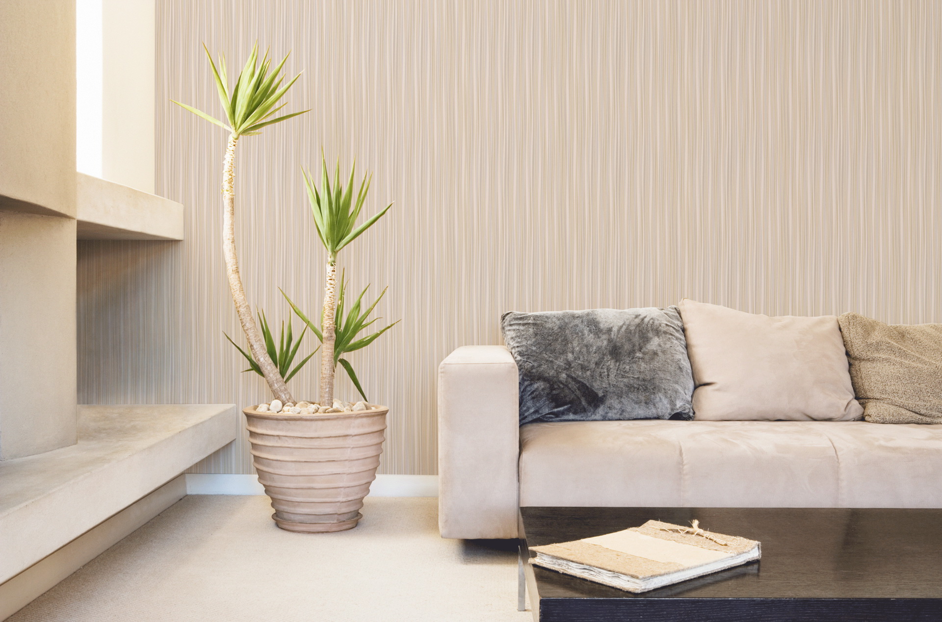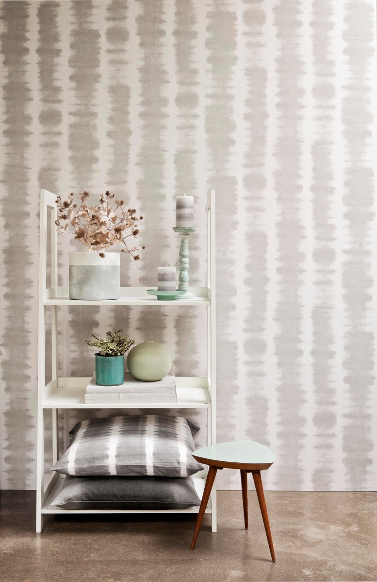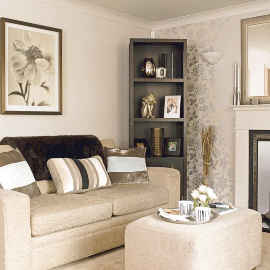 วอลล์เปเปอร์สีเทาสีเบจจะดูเหมาะสมเมื่อตกแต่งห้องนั่งเล่นหรือห้องนอน
