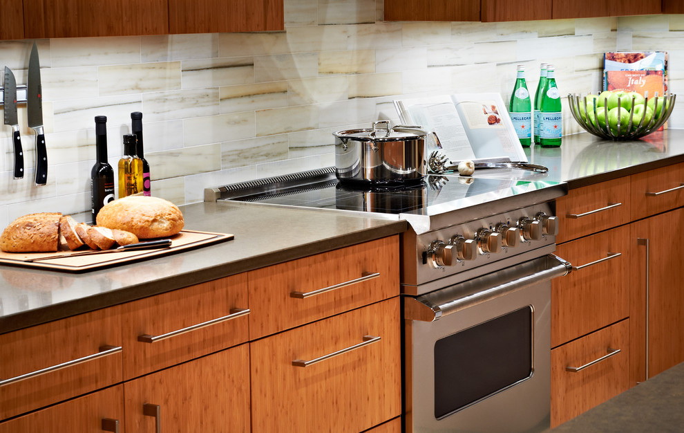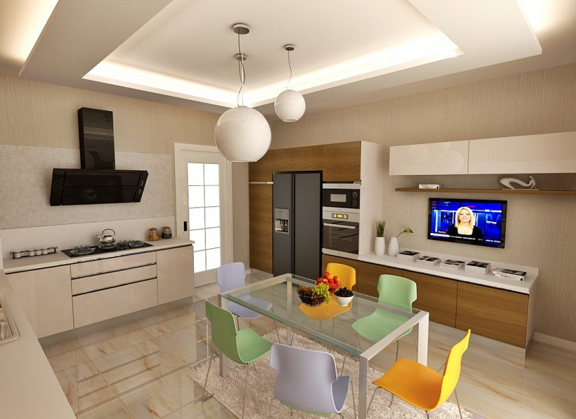 ทางเลือกของระดับพื้นขึ้นอยู่กับความชอบของเจ้าของเท่านั้นมันสามารถเป็นได้ทั้งมืดและสว่าง ควรเลือกจานสีโดยรวมสำหรับห้องครัวในระดับที่สมบูรณ์ยิ่งขึ้นเพื่อให้โทนเสียงมีความสมดุลมากขึ้น