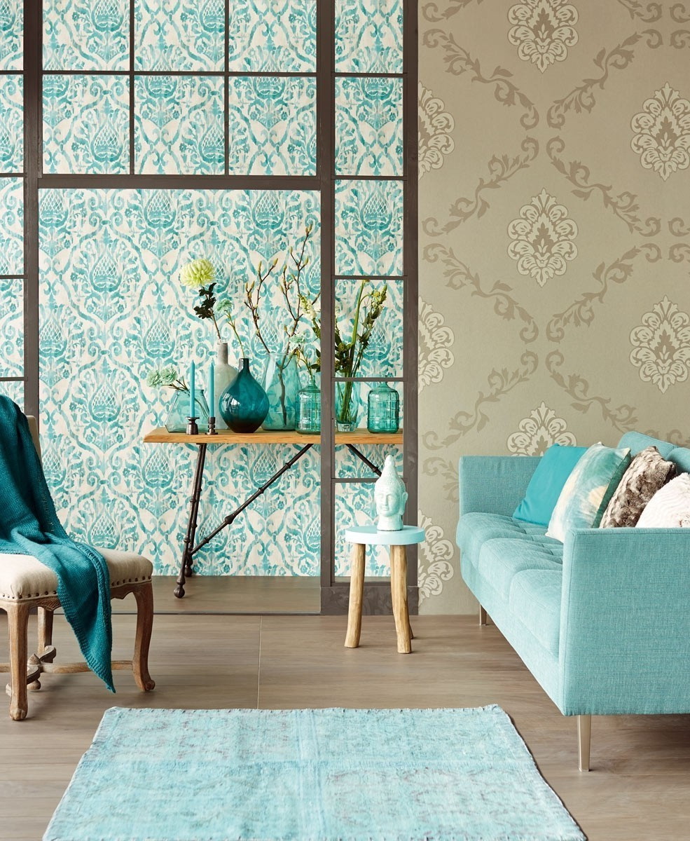รูปทรงเรขาคณิตขนาดเล็กเช่นสี่เหลี่ยมวงกลมและรูปสี่เหลี่ยมขนมเปียกปูนยังช่วยในการซ่อนข้อบกพร่องของพื้นผิว ใช้วอลล์เปเปอร์สีเบจสีทองด้วยรูปแบบดังกล่าวจะแนะนำในทางเดินหรือห้องน้ำ เครื่องประดับนี้ไม่ลดพื้นที่