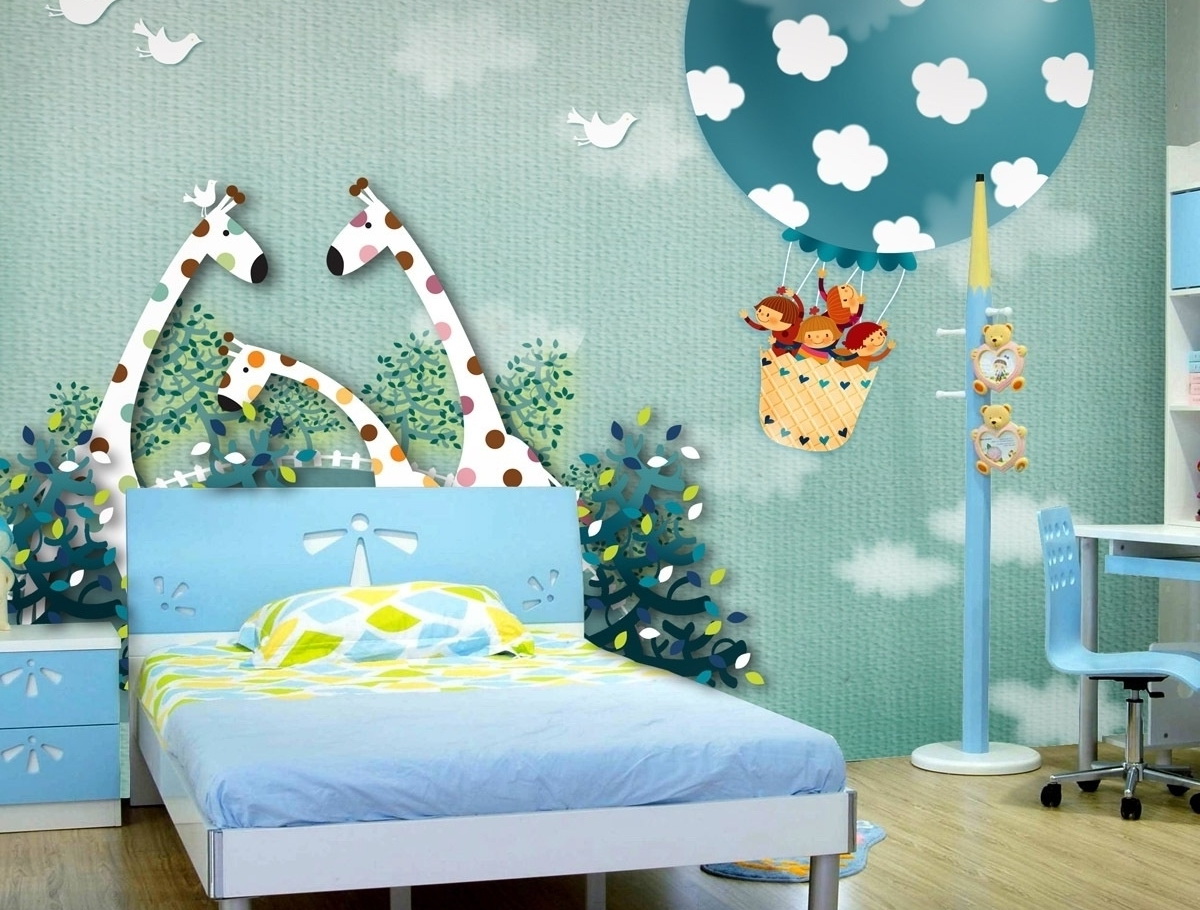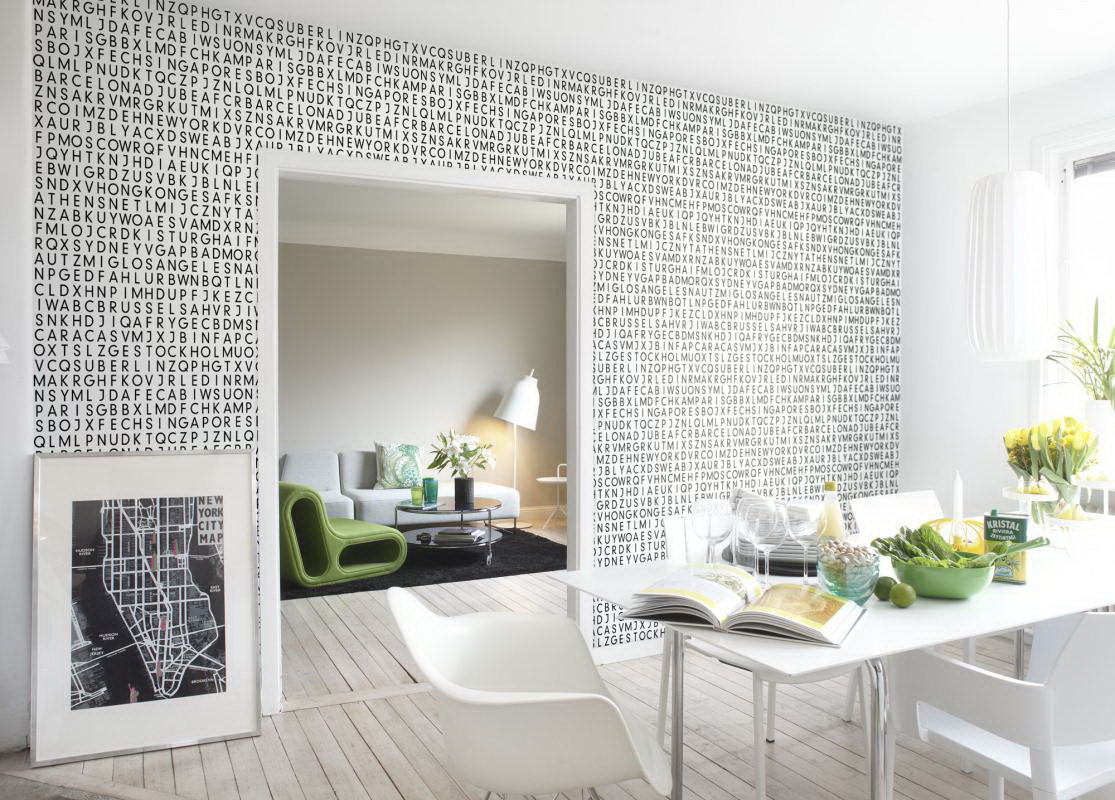 ผนังฟรีจากเฟอร์นิเจอร์ตกแต่งด้วยวอลล์เปเปอร์ที่มีการพิมพ์ที่สดใสและส่วนที่เหลือของผนังที่ทำจากสีทึบ วิธีการวางนี้สามารถใช้ได้ทั่วทั้งห้องหรือแยกเป็นส่วน ๆ