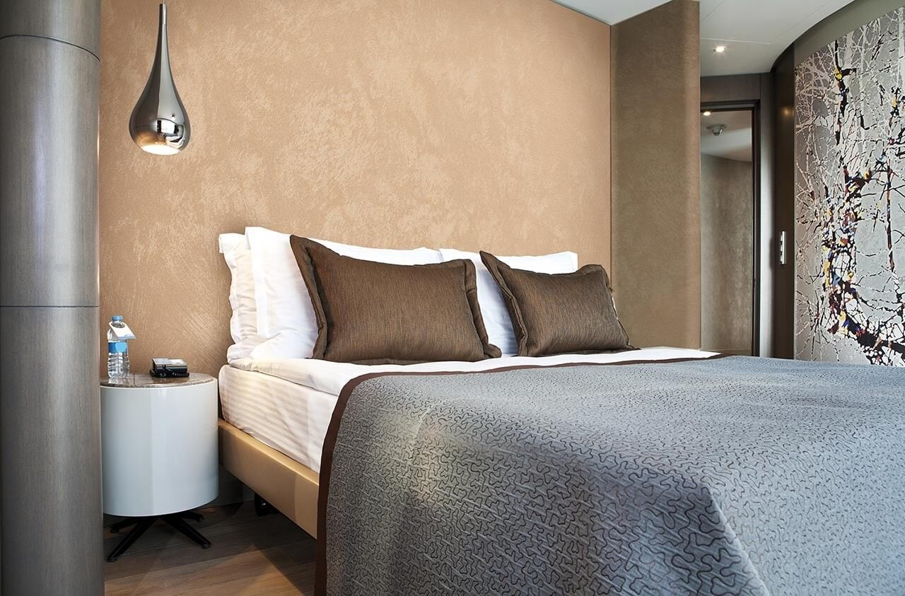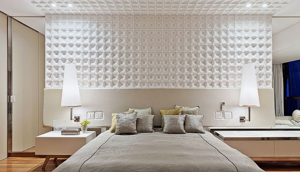 พลาสเตอร์ "ผ้าไหม" - ราชินีของห้องนอน มันสร้างบรรยากาศที่เป็นเอกลักษณ์ของความนุ่มนวลและความสว่าง เลียนแบบผ้าไหม มักใช้โดยนักออกแบบเพื่อสร้าง "อากาศ" ของพื้นที่
