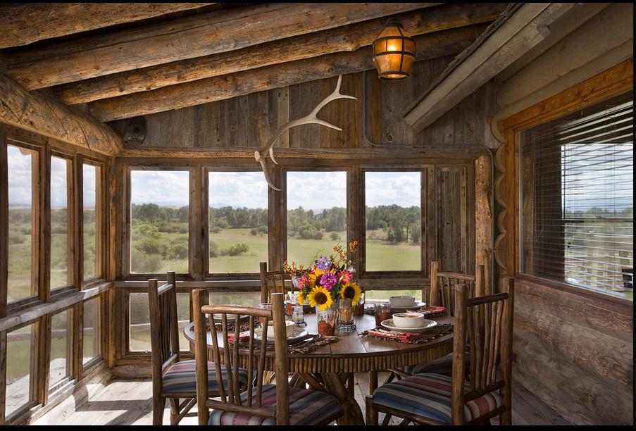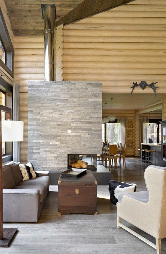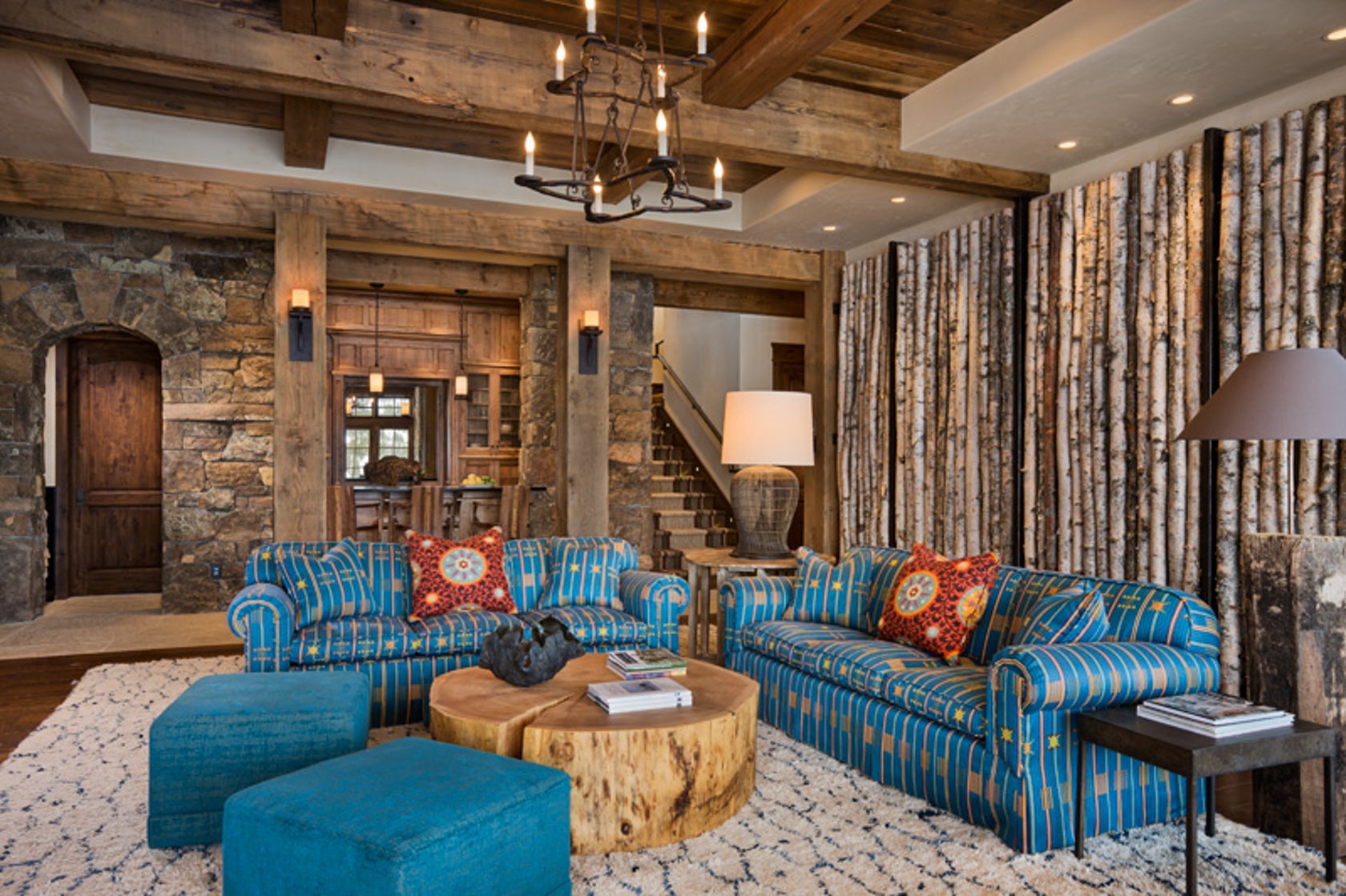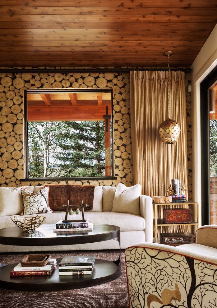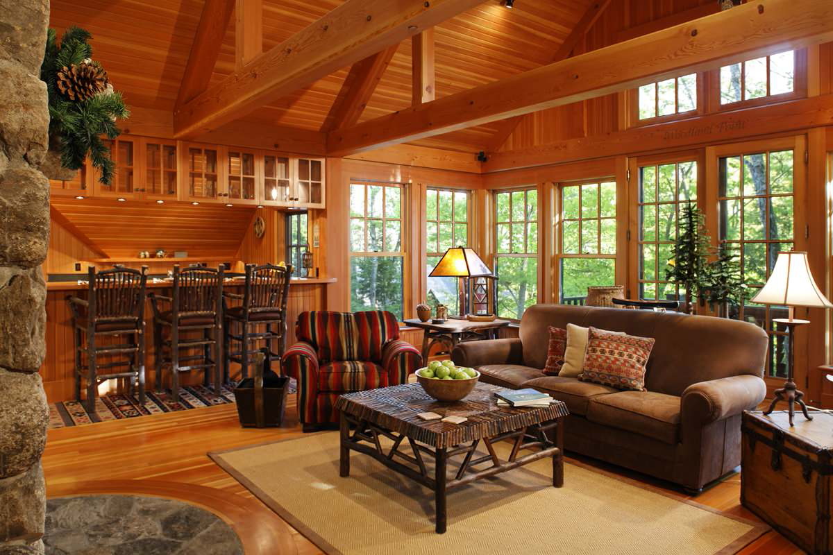 ไม้จะถูกนำมารวมกันในการตกแต่งภายในด้วยวัสดุธรรมชาติอื่น ๆ รวมถึงหิน มักใช้สำหรับอิฐภายนอกใช้สำหรับตกแต่งผนังภายในห้อง การรวมกันของไม้และอิฐเป็นคุณลักษณะลักษณะของสไตล์ ห้องหอ.