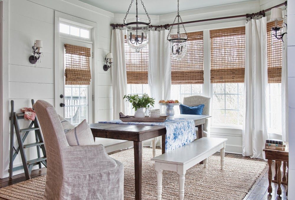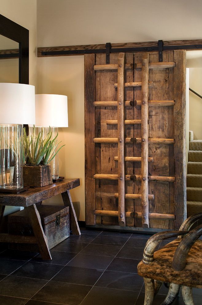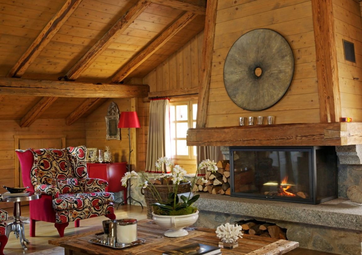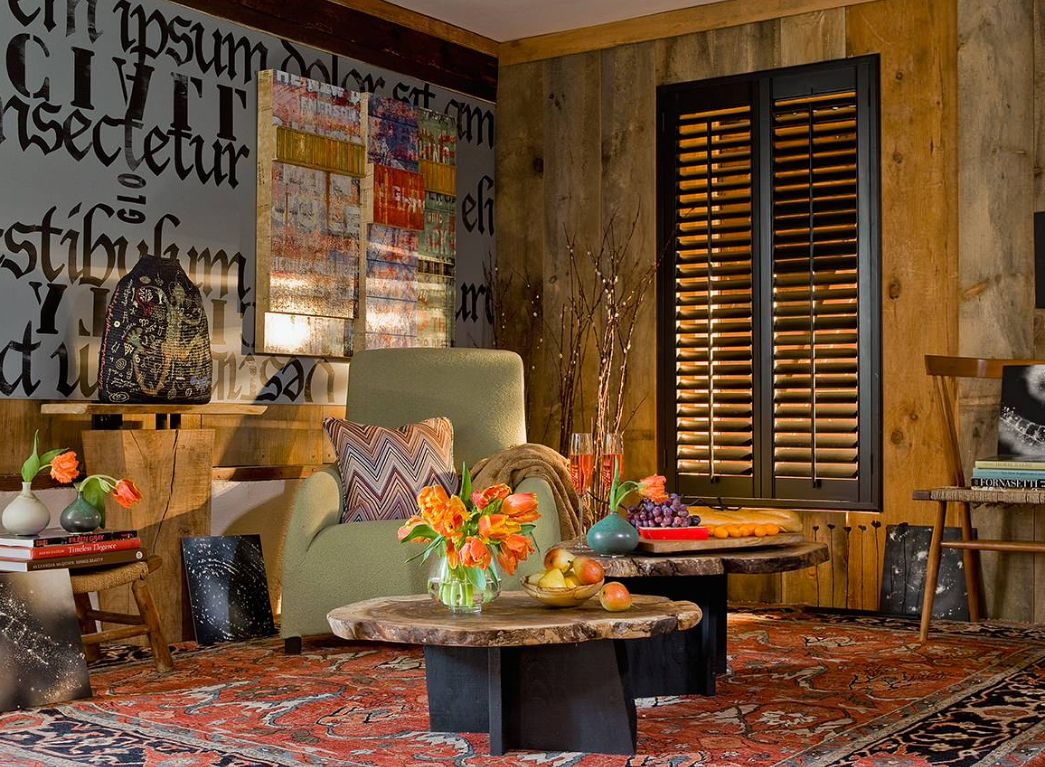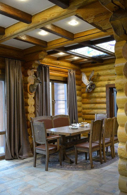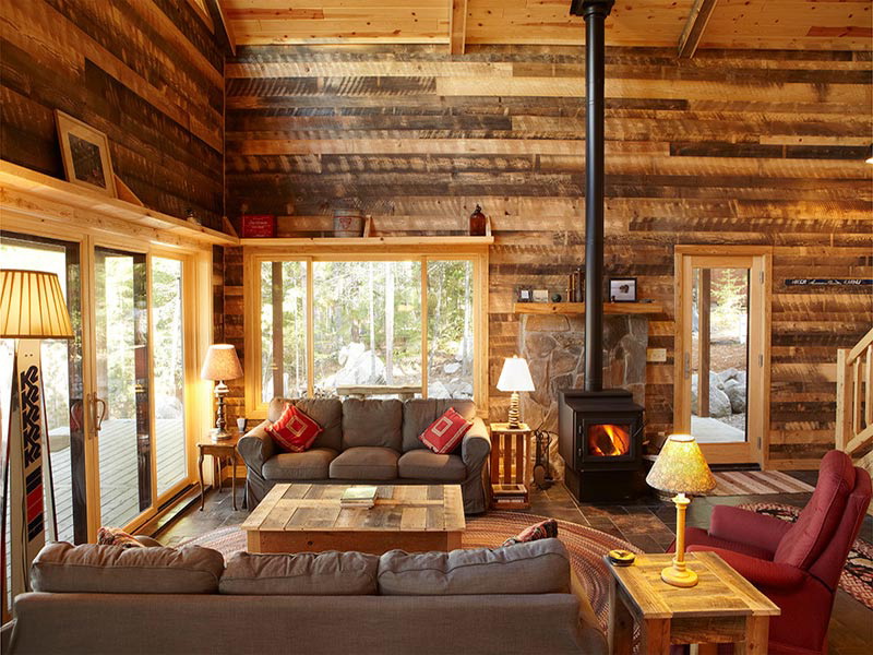 ไม้จะถูกนำมารวมกันในการตกแต่งภายในด้วยวัสดุธรรมชาติอื่น ๆ รวมถึงหิน มักใช้สำหรับอิฐภายนอกใช้สำหรับตกแต่งผนังภายในห้อง การรวมกันของไม้และอิฐเป็นคุณลักษณะลักษณะของสไตล์ ห้องหอ.