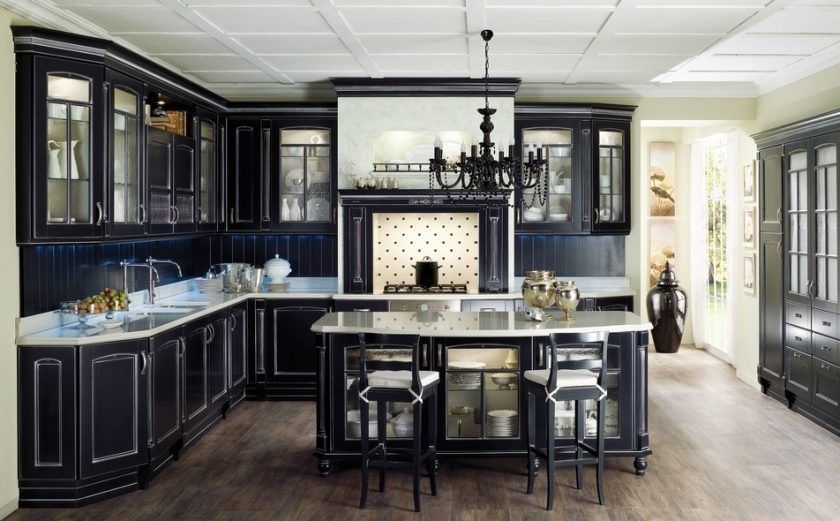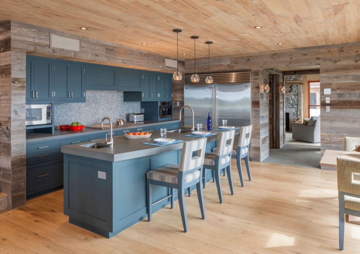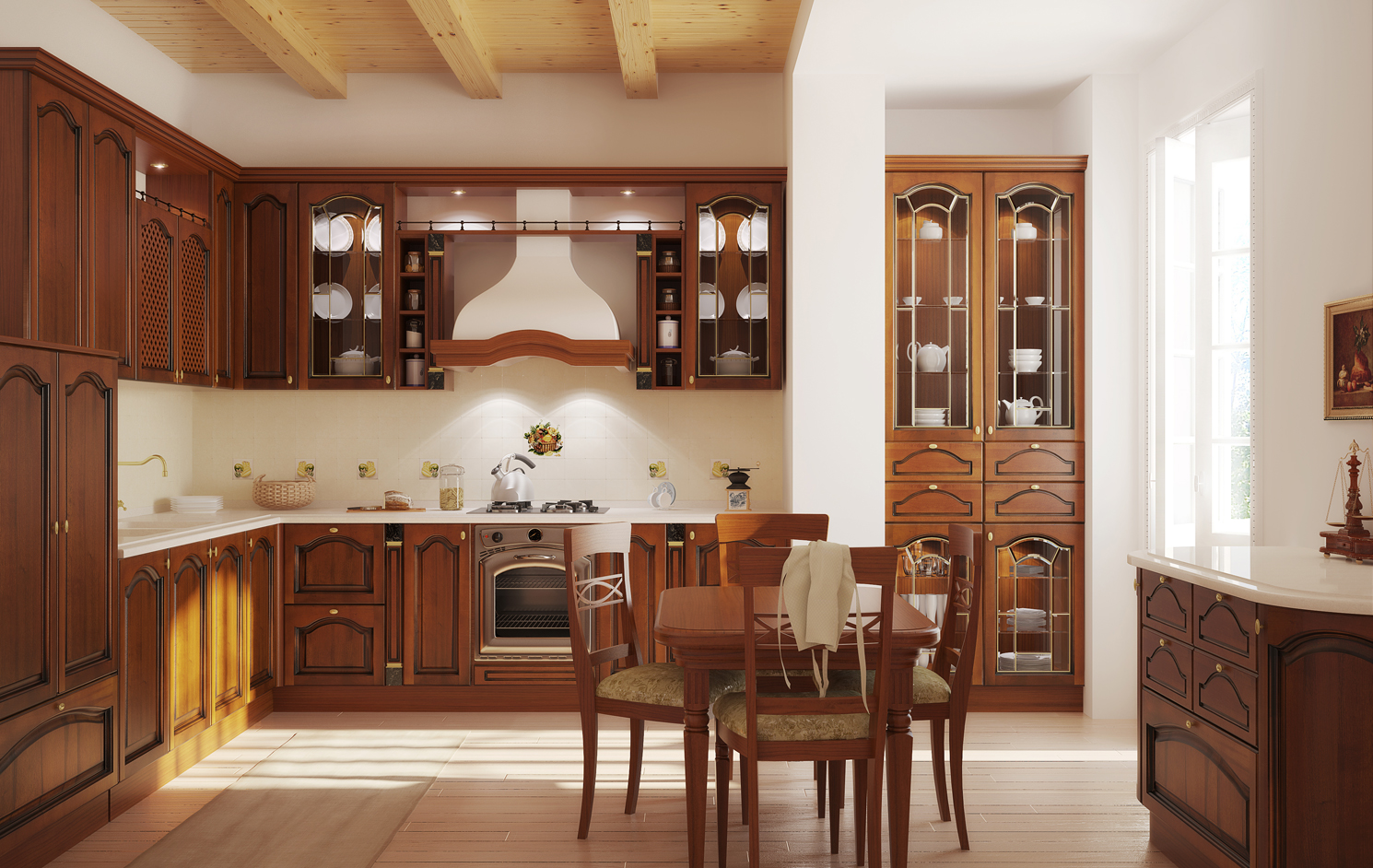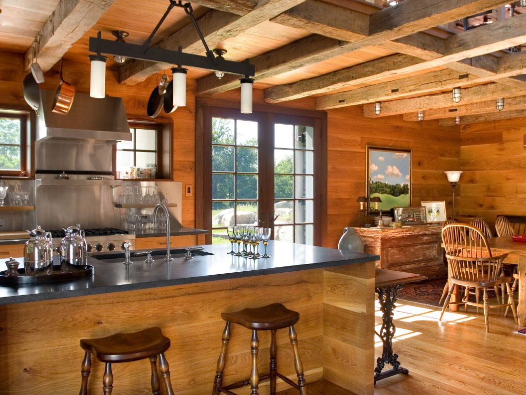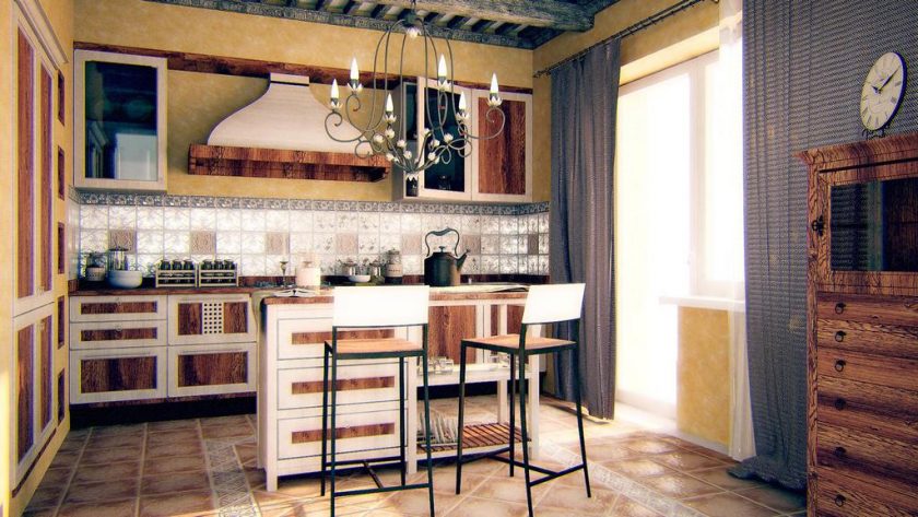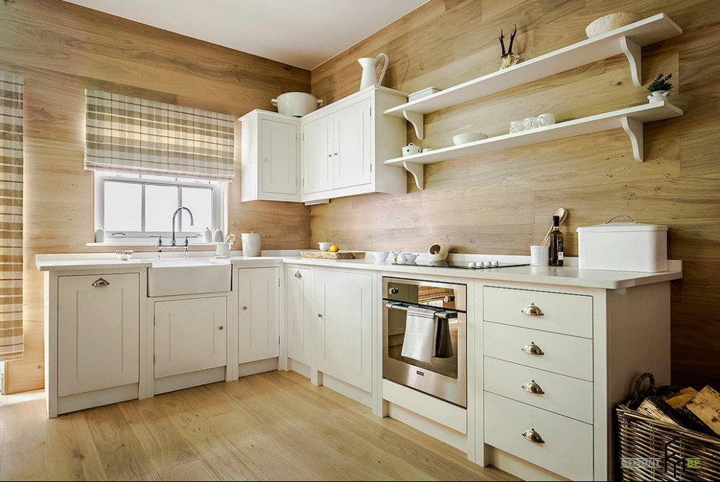 ในขณะเดียวกันองค์ประกอบไม้ไม่เพียง แต่ชุดครัวอุปกรณ์เสริม แต่ยังรวมถึงการตกแต่งผนังเพดานและพื้น พื้นส่วนใหญ่มักเป็นไม้ปาร์เก้หรือกระเบื้องที่มีการเลียนแบบไม้