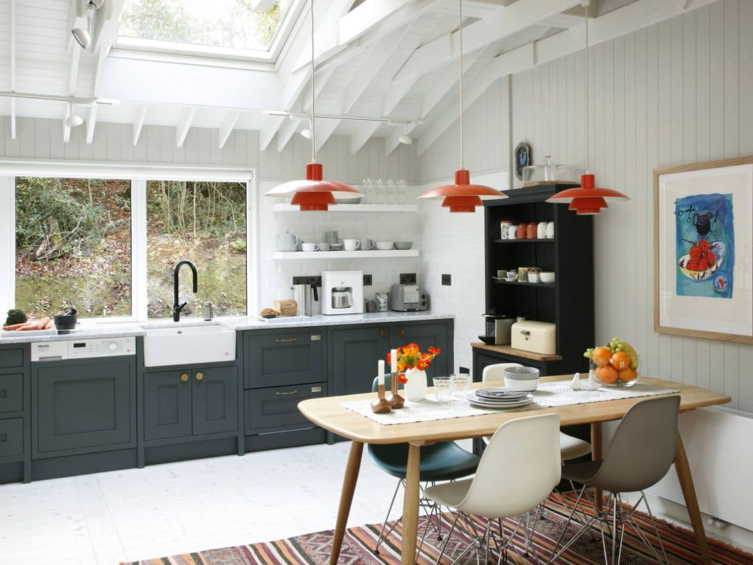สามารถใช้ในห้องครัวทุกขนาด จานจะต้องเลือกเบาเป็นพิเศษด้วยการเพิ่มเติมเล็กน้อย สีดำ หรือน้ำเงินเข้ม ในห้องที่ถูกครอบงำด้วยโทนสีขาวหรือสีอ่อนควรมีจุดสว่างจำนวนมาก บนผนังวางวอลล์เปเปอร์หรือ ปูนปลาสเตอร์เมื่อออกแบบเพดานคุณจะต้องใช้องค์ประกอบที่ทำจากไม้ เฟอร์นิเจอร์ทั้งหมดในครัวควรทำจากวัตถุดิบธรรมชาติหรือจากการเลียนแบบคุณภาพสูง แสงสว่างมากมายไม่มีผ้าม่านมีชีวิต พืช ในกระถางเป็นสัญญาณของสแกนดิเนเวีย