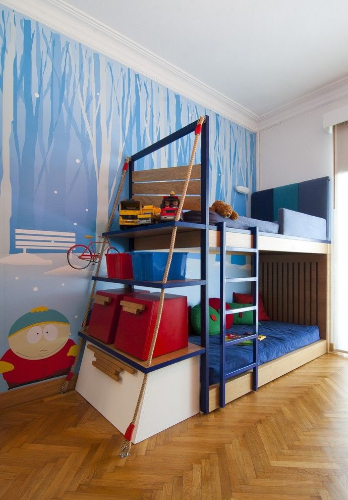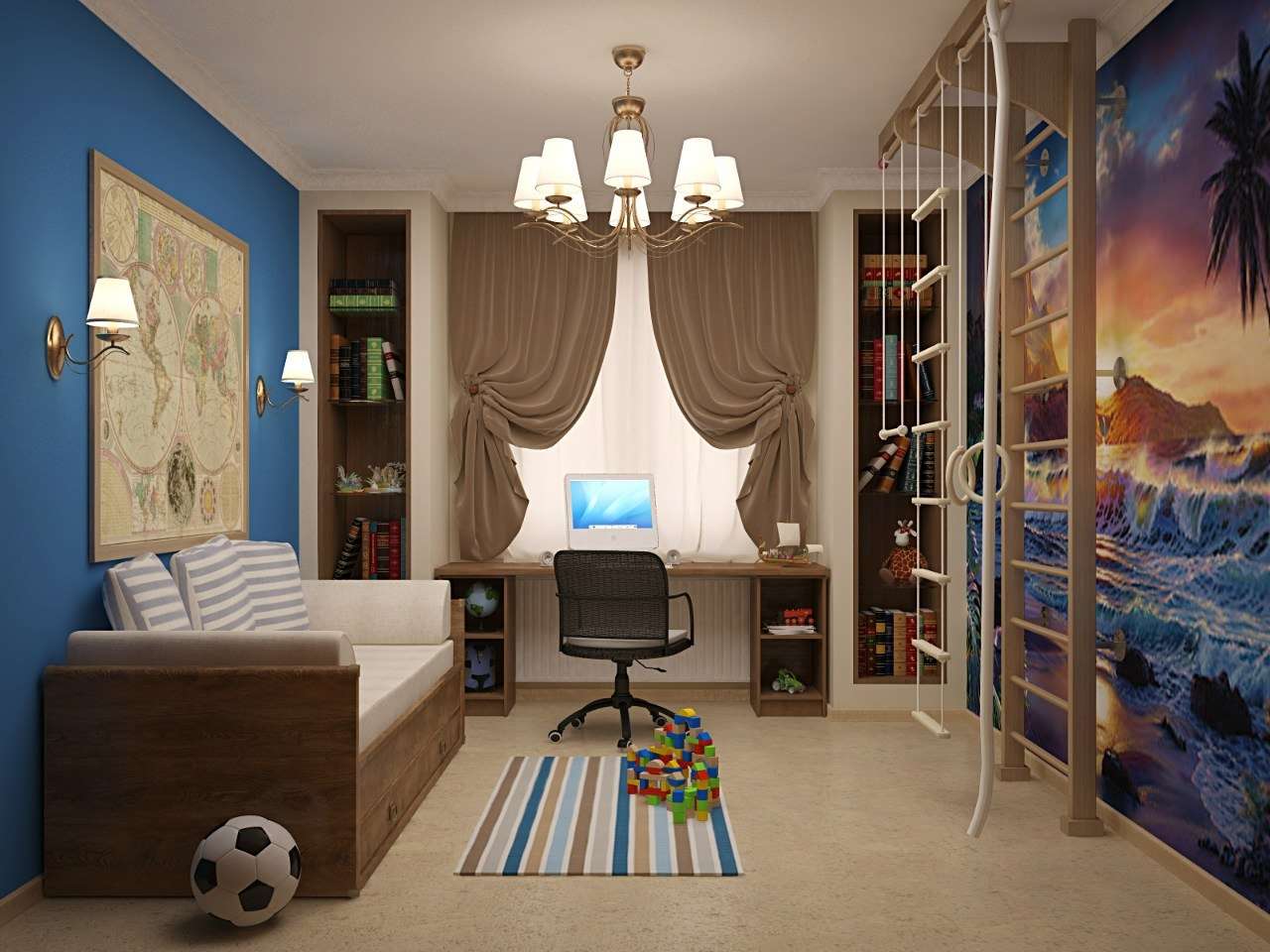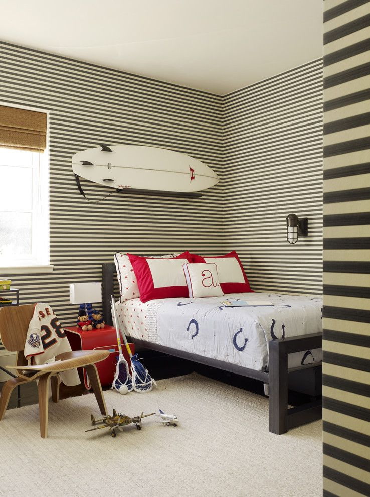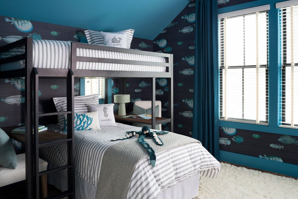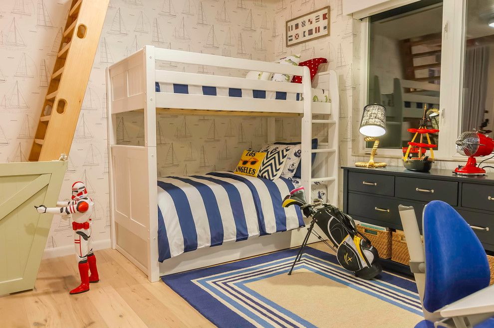 ด้วยเพดานสูงและสี่เหลี่ยมขนาดใหญ่คุณสามารถเติมเต็มห้องด้วยสีสดใสคุณลักษณะที่สนับสนุนรูปแบบของการออกแบบ ดังนั้นสำหรับธีมทางทะเลคุณสามารถใช้วอลล์เปเปอร์กับเรือใบที่สวยงามใช้หน้าอก "โจรสลัด" สำหรับเก็บของเล่นใช้เชือกและแบบจำลองเรือในการออกแบบ