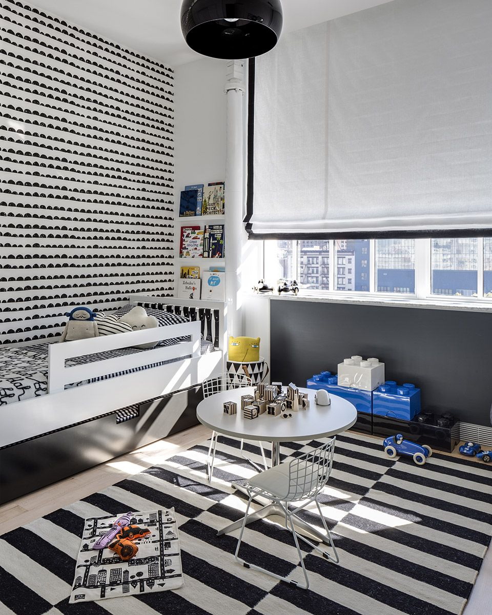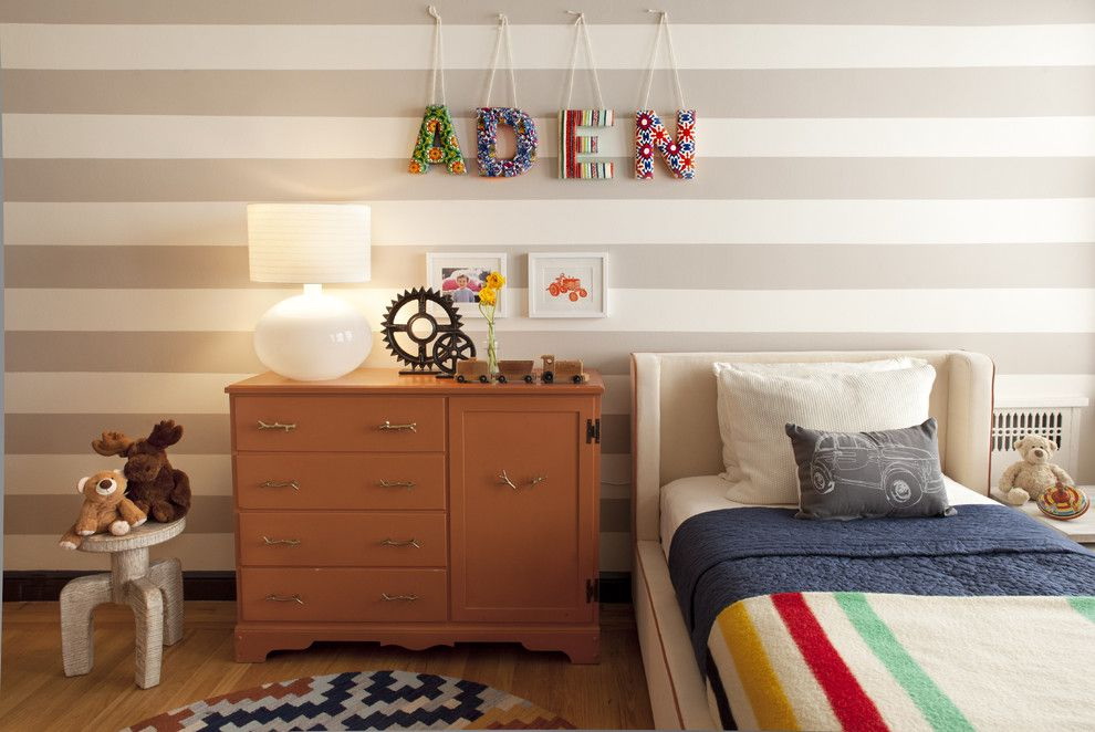 วอลล์เปเปอร์ลายไม่ได้เป็นเพียงวิธีการตกแต่งผนัง แต่ยังมีความสามารถในการปรับการรับรู้ของพารามิเตอร์ของเด็ก. ดังนั้นลายเส้นแนวตั้งทำให้ห้องดูสูงขึ้นห้องนอนแนวนอนจะขยายพื้นที่