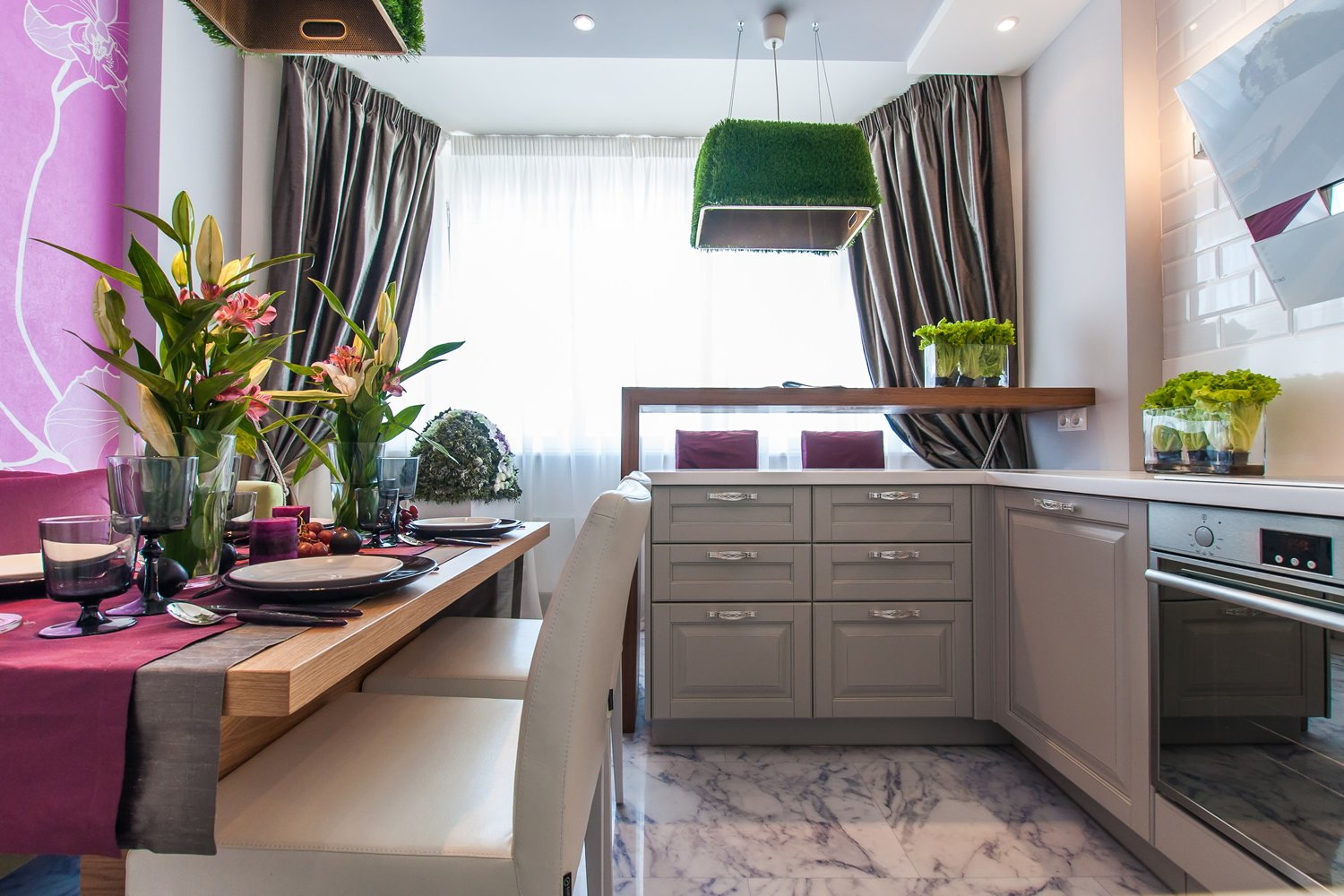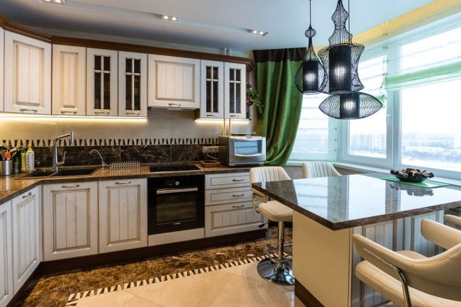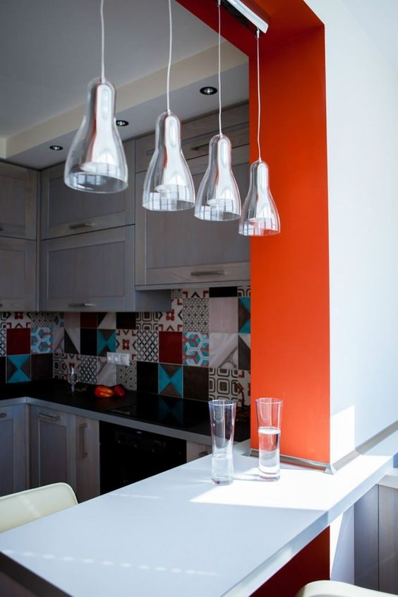 การตกแต่งภายในนี้ทำให้การออกแบบห้องครัวของคุณแตกต่างอย่างไม่คาดคิดและทำให้ทันสมัยยิ่งขึ้น ทางออกใหม่สำหรับปัญหาอาหารกลางวันคือเคาน์เตอร์บาร์