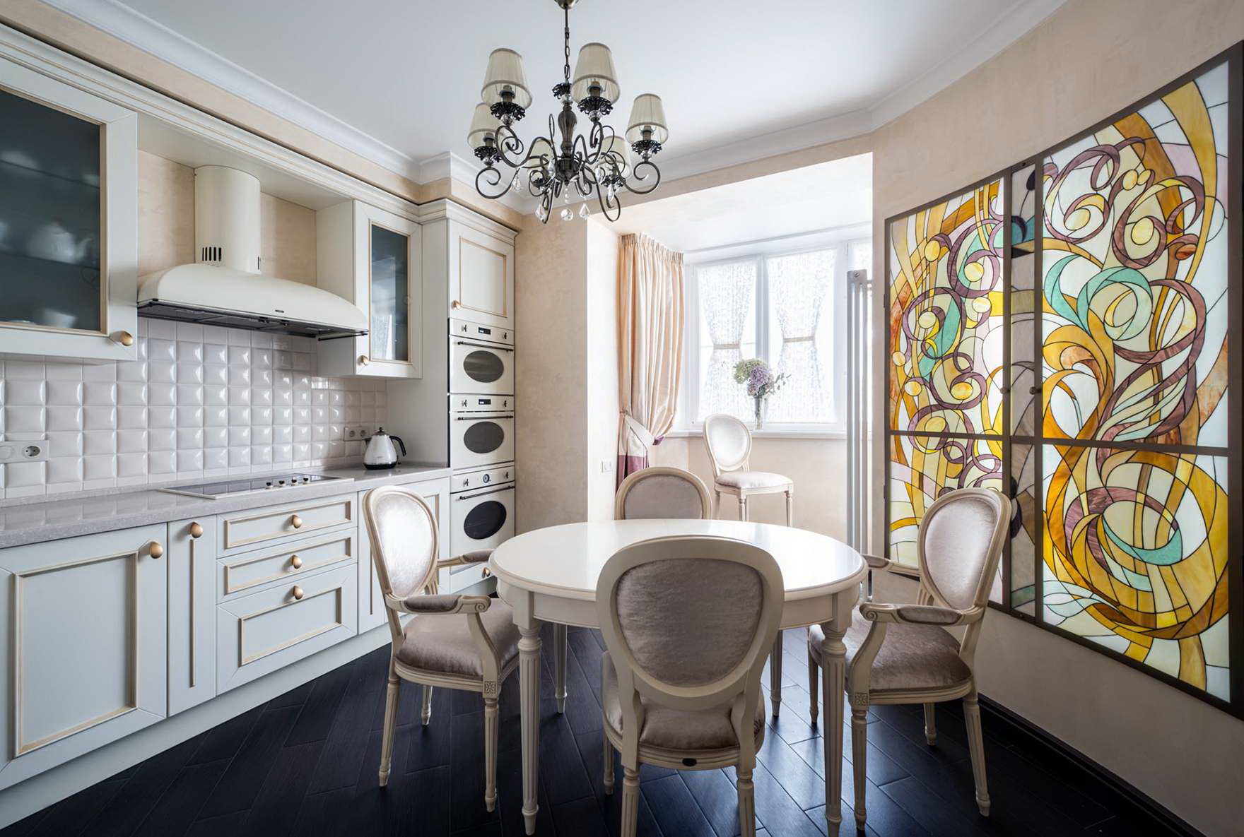 คุณสามารถแทนที่ประตูกระจกหรือ "หน้าต่างฝรั่งเศส" บนช่องเปิดโค้งได้ อย่าปล่อยให้รูปทรงเรขาคณิตน่าเบื่อคุณสามารถปล่อยให้จินตนาการของคุณบินโดยเฉพาะอย่างยิ่งถ้าการออกแบบโดยรวมของห้องครัวที่ตรงกับสไตล์ที่ทันสมัย