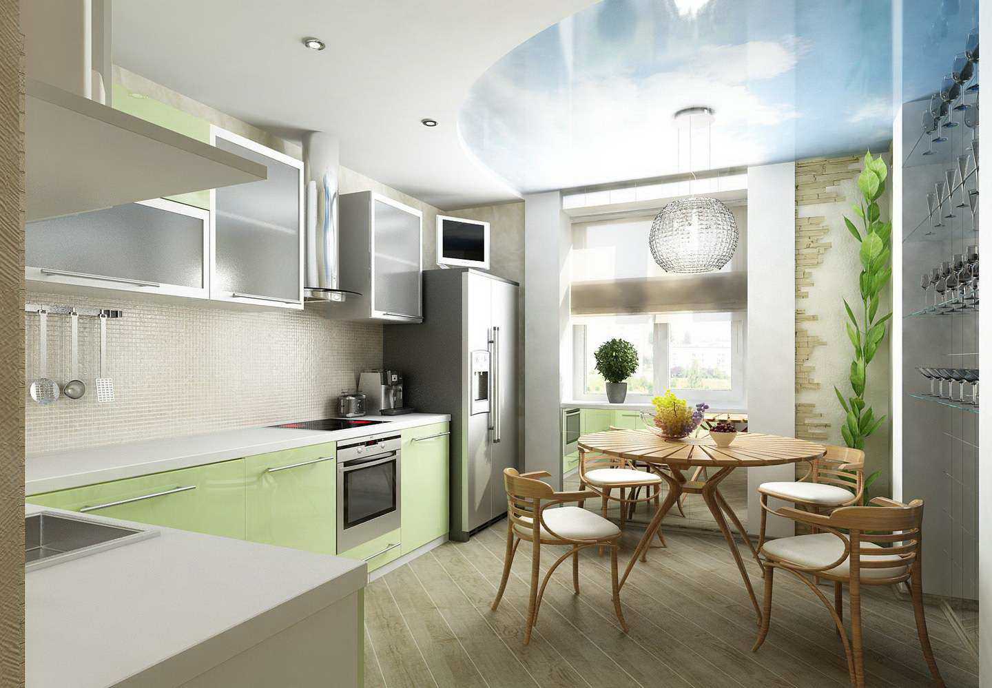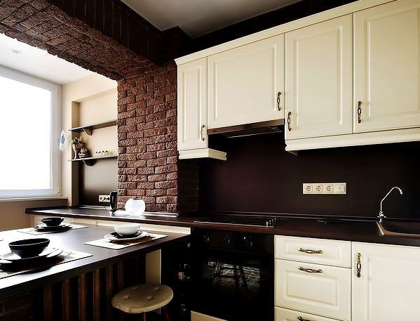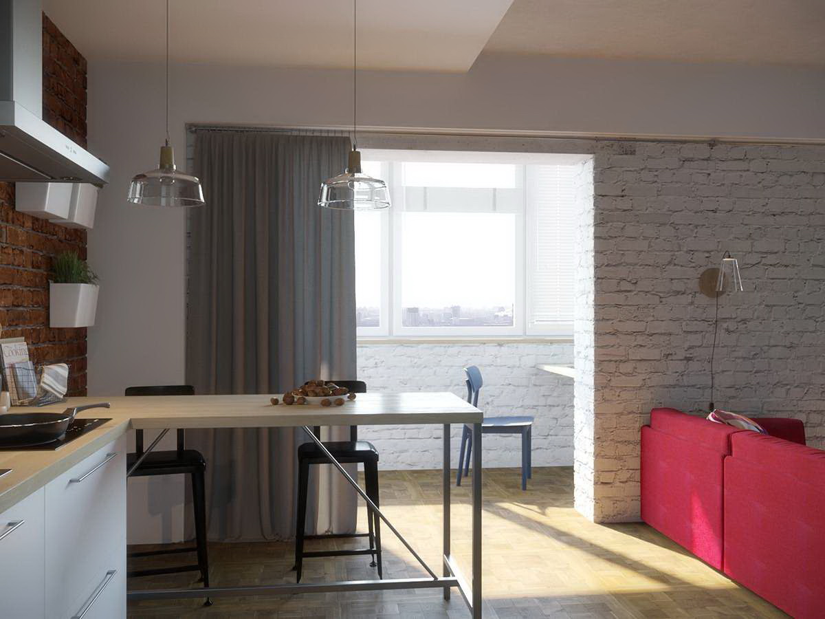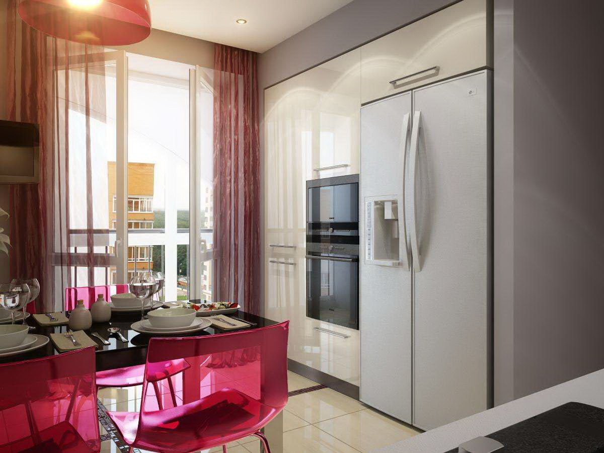การสื่อสารทั้งหมดอ่างล้างจานและเตาสามารถโอนไปยังระเบียงที่มองเห็นจะเพิ่มพื้นที่ของห้องครัว นอกจากนี้ที่นี่คุณสามารถวางตู้เย็นเพื่อเพิ่มพื้นที่ทำงานจากเครื่องใช้ในครัวเรือน