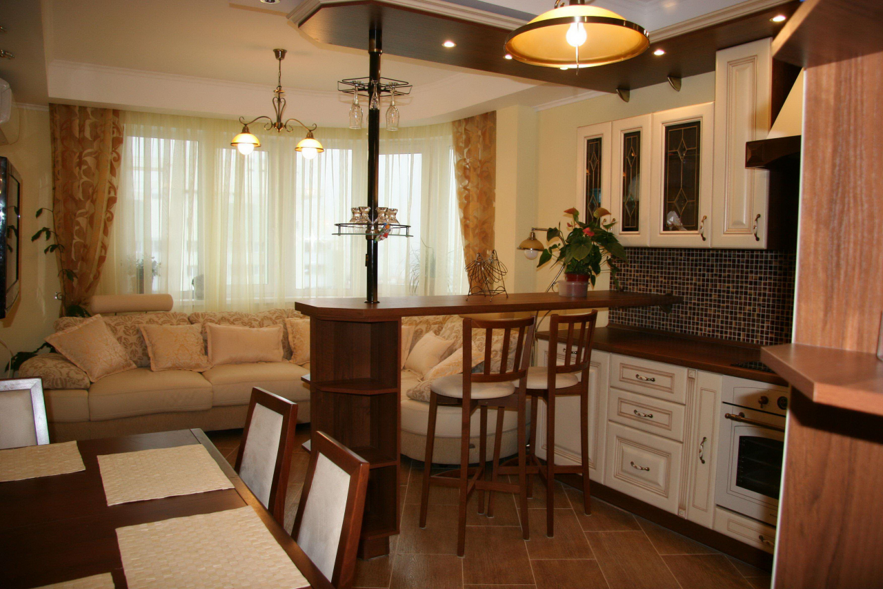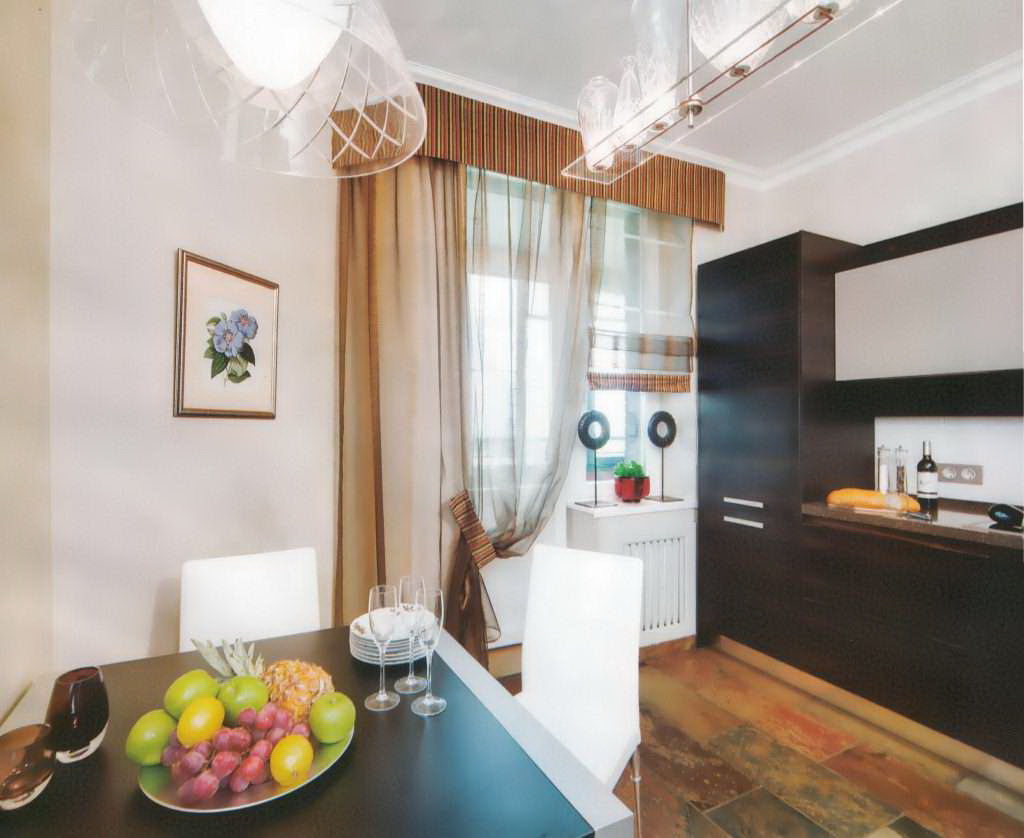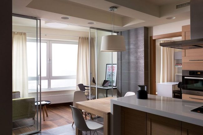 โดยการลบกรอบหน้าต่างและประตูเราออกจากพาร์ติชันที่สามารถแยกสองช่องว่างการทำงาน - พื้นที่ทำอาหารและพื้นที่รับประทานอาหาร