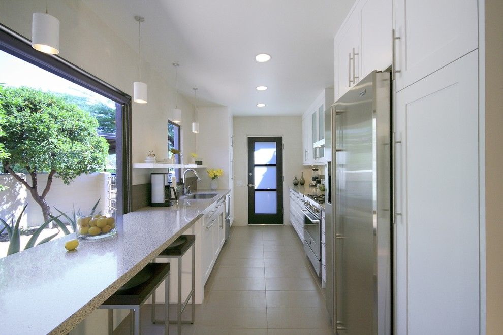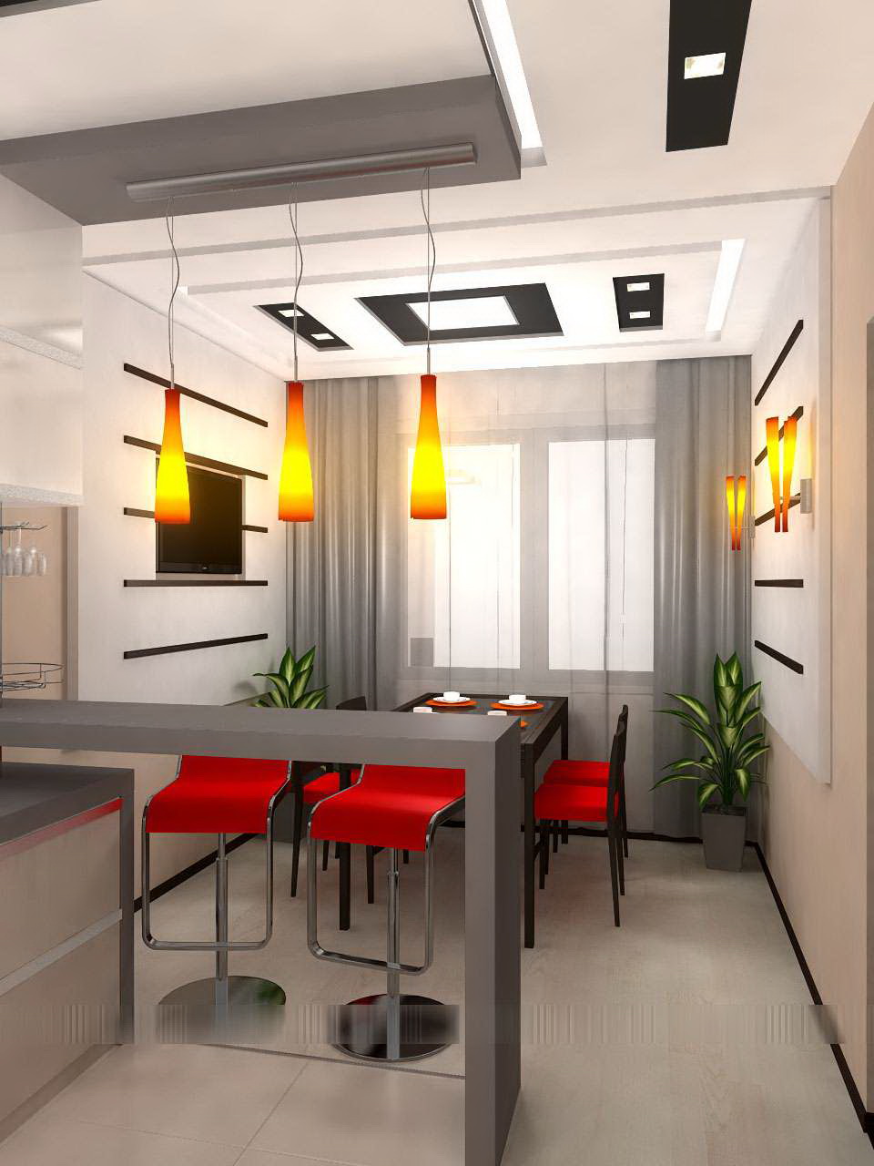 รูปทรงสี่เหลี่ยมผืนผ้าของพื้นที่ห้องมักจะค่อนข้างแคบ ในห้องครัวเพื่อวางโต๊ะอาจเป็นเรื่องยาก เฟอร์นิเจอร์ในกรณีนี้มันเป็นที่พึงปรารถนาในการจัดเรียงตามผนังขนาน ที่นี่คุณสามารถวางเคาน์เตอร์บาร์ได้