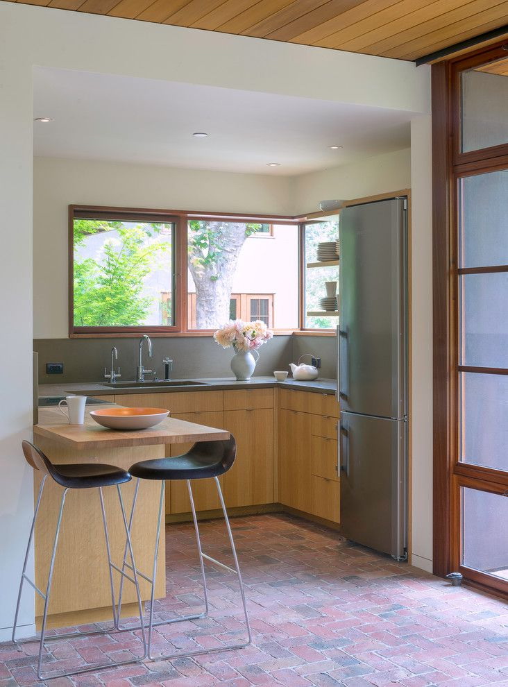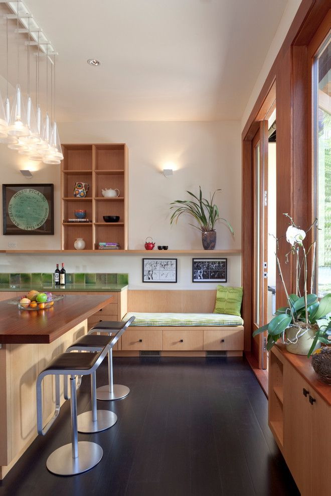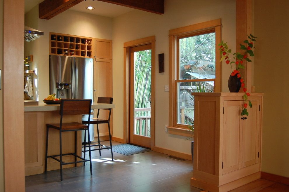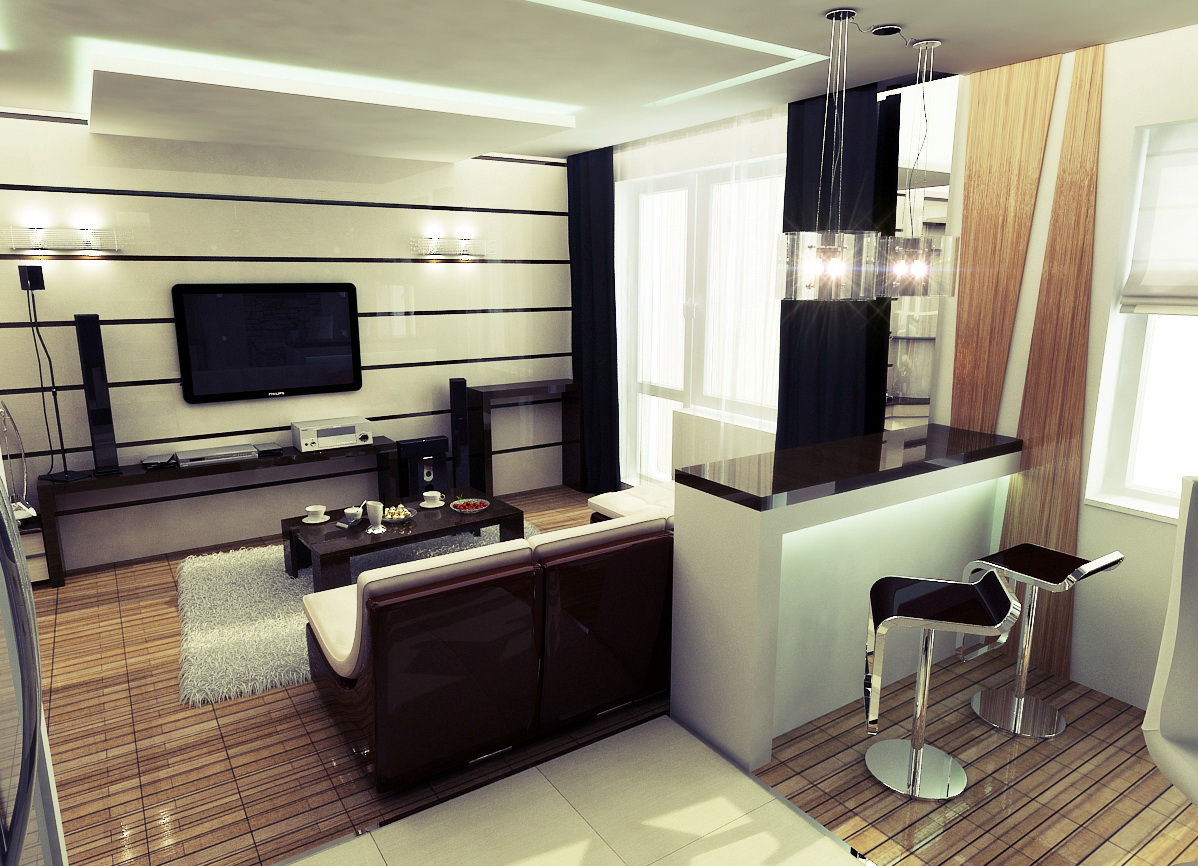 ในเวลาเดียวกันมีการติดตั้งเคาน์เตอร์บาร์เพื่อไม่ให้สังเกตเห็นสถานที่ประกอบอาหารหรือซักผ้าจากทางเข้าซึ่งปกคลุมด้วยแถบสูง ในเวลาเดียวกันควรมีที่ว่างเพียงพอสำหรับการเข้าใกล้ฟรีและการจัดวางเก้าอี้ที่สะดวกสบาย