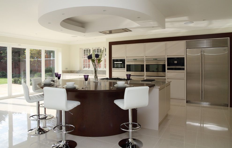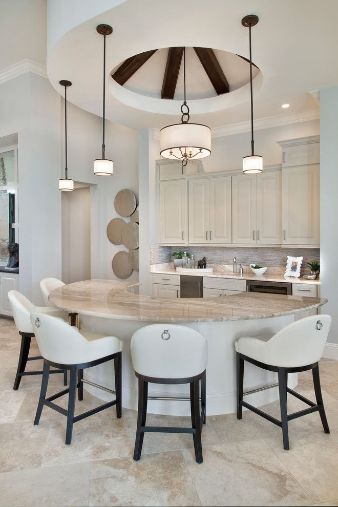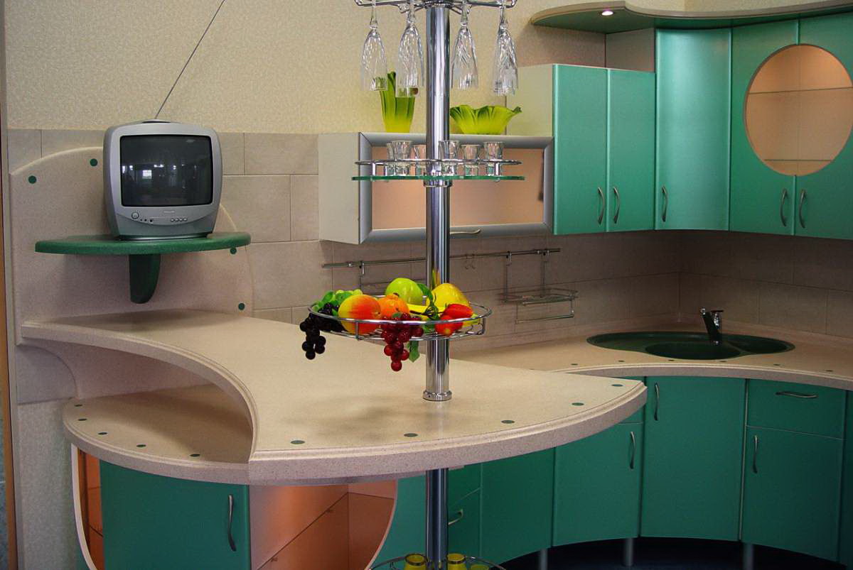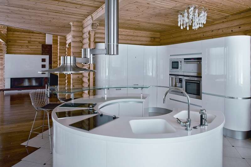 รูปร่างโค้งมนของชั้นวางเป็นตัวเลือกที่ใช้ได้เฉพาะกับห้องที่มีพื้นที่กว้างและมีพื้นที่ว่างเพียงพอและมีเฟอร์นิเจอร์ว่าง ข้อได้เปรียบที่สำคัญที่สุดคือความคิดริเริ่มซึ่งจะเน้นการตกแต่งภายในของห้องครัวในหมู่คนที่คล้ายกัน นอกจากนี้รูปแบบที่ผิดปกติจะช่วยให้คุณเพิ่มที่นั่งอื่น