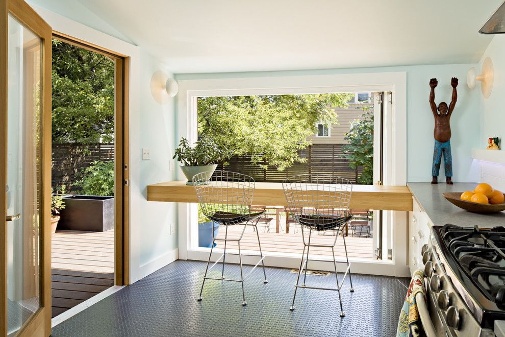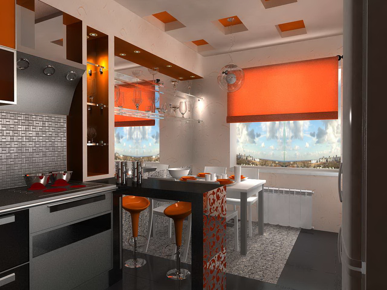 หากมีระเบียงติดกับห้องครัวพื้นที่จะเพิ่มขึ้นอย่างมาก ในกรณีนี้เคาน์เตอร์บาร์จะพอดีกับขอบของห้องครัวและส่วนระเบียงอดีต เมื่อคุณบันทึกหน้าต่างธรณีประตูเป็นพาร์ติชันมักจะทำใหม่ภายใต้เคาน์เตอร์บาร์