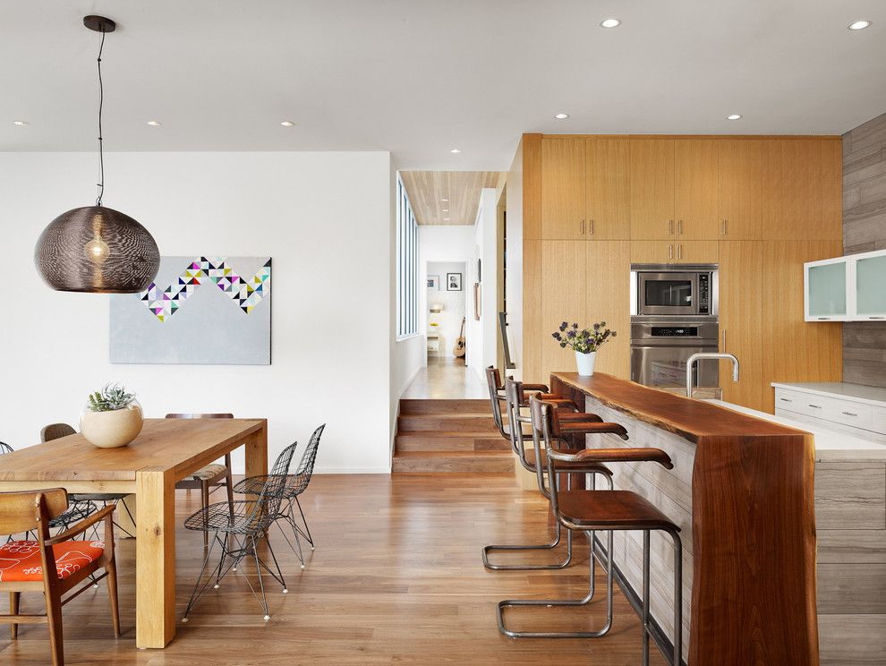 การรวมโต๊ะรับประทานอาหารกับเคาน์เตอร์บาร์เป็นหนึ่งในโซลูชั่นที่น่าสนใจที่สามารถเอาชนะได้อย่างสวยงามในการออกแบบห้องครัว องค์ประกอบที่รวมกันของการตกแต่งภายในมีโต๊ะสองระดับ