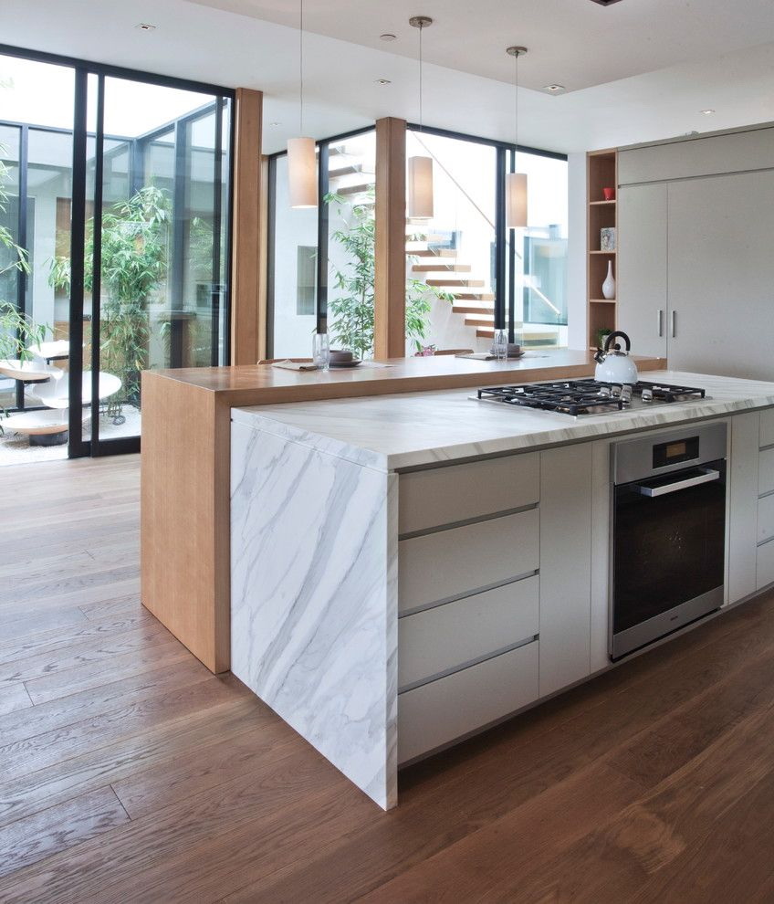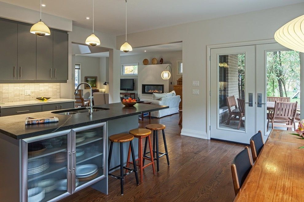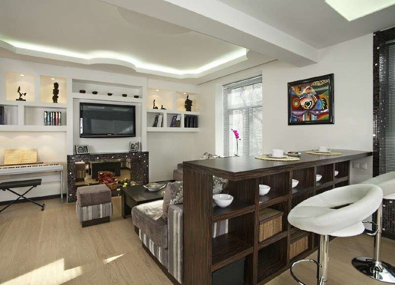 วิธีการคล้ายกับการแบ่งเขตพื้นที่ช่วยให้คุณสามารถแยกห้องนั่งเล่นออกจากห้องครัวได้อย่างชัดเจน แต่ในเวลาเดียวกันจะมีความรู้สึกโล่ง