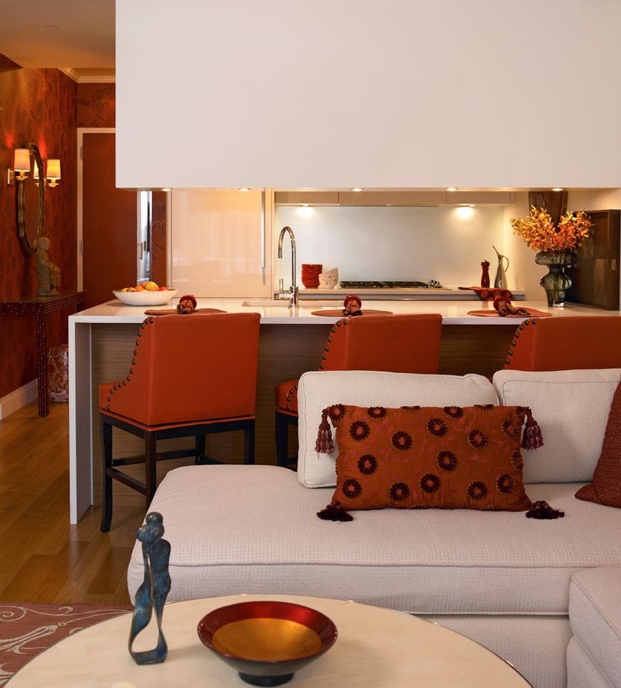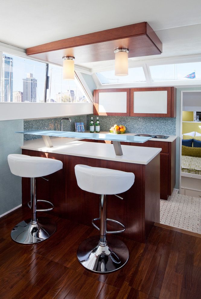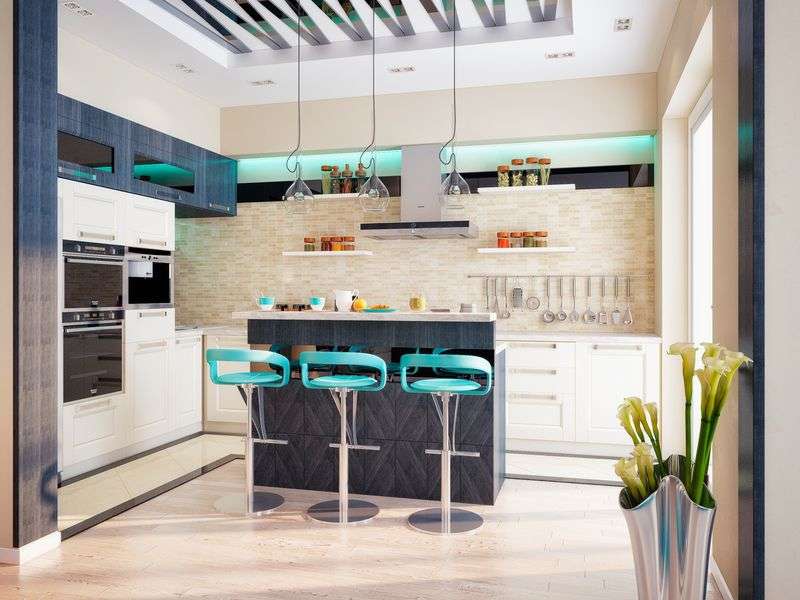 การออกแบบห้องครัวพร้อมบาร์เป็นไฮไลท์ที่สดใสของการออกแบบและในขณะเดียวกันองค์ประกอบการทำงานของการตกแต่งภายใน