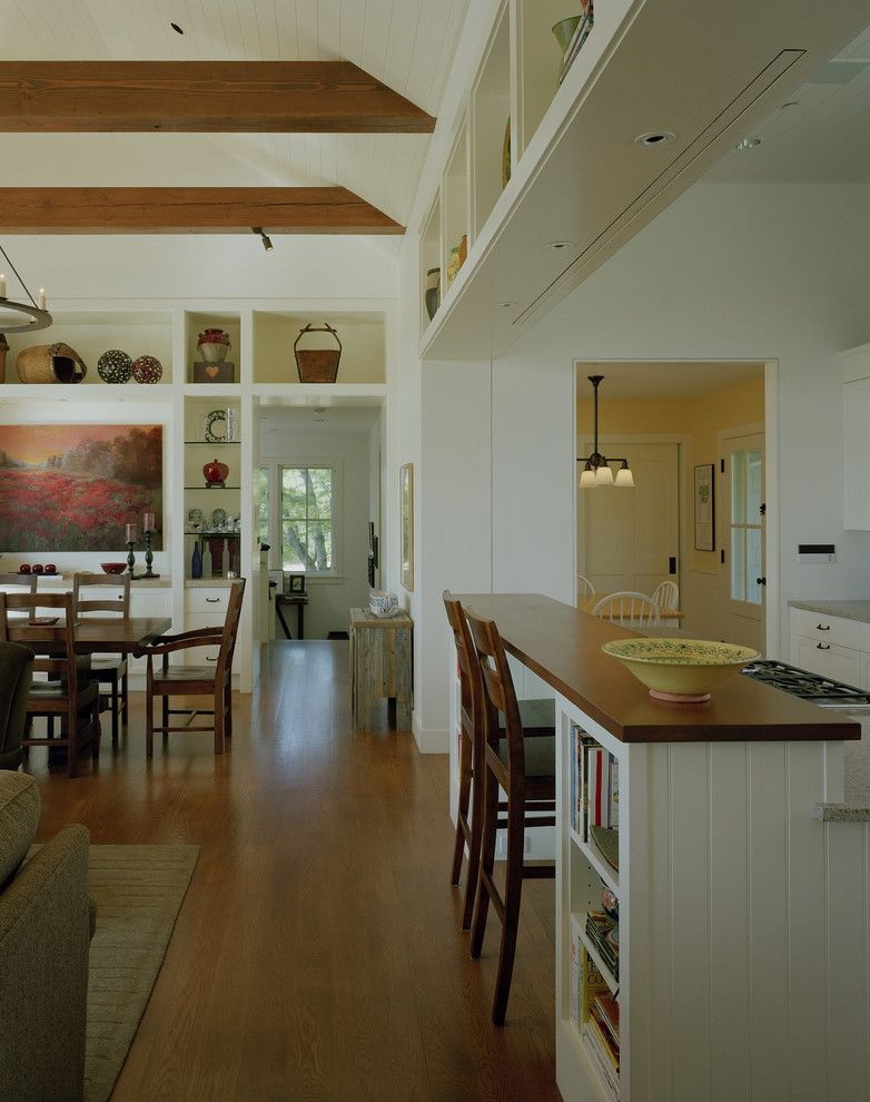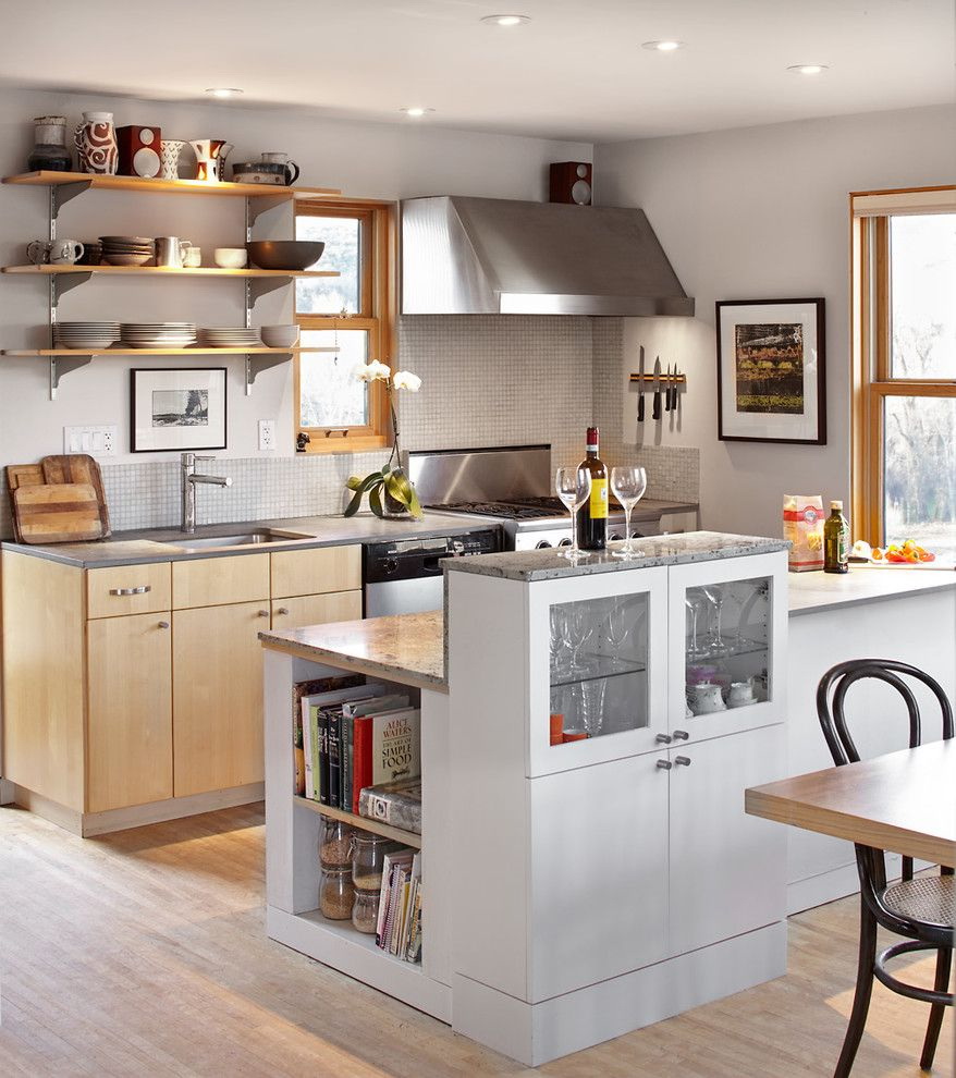 ในห้องครัว - สตูดิโอขอบเขตของโซนจะถูกลบไปในทางปฏิบัติ ในกรณีนี้การติดตั้งชั้นวางจะแยกพื้นที่ห้องครัวเป็นสัญลักษณ์ วิธีนี้มักเป็นที่ชื่นชอบของแม่บ้านที่ทำอาหาร แต่ในเวลาเดียวกันสามารถสื่อสารกับผู้ที่อยู่ในพื้นที่สันทนาการ