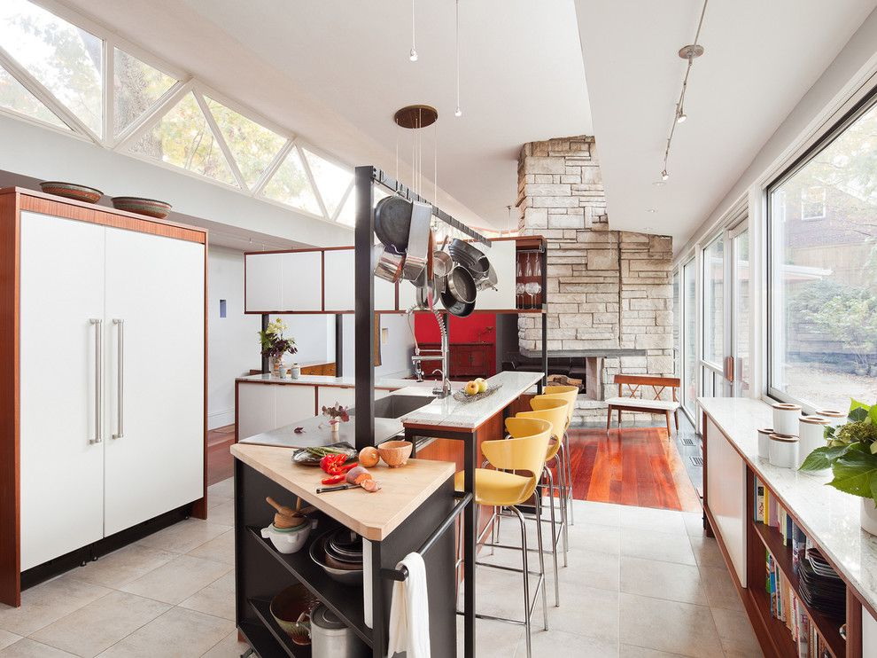 ในกรณีนี้เคาน์เตอร์บาร์เพิ่มเติมช่วยให้คุณสามารถ "ส่ง" เฟอร์นิเจอร์ที่หายไปเพื่อสร้างสมดุลภายในและสร้างบรรยากาศอบอุ่น ตัวเลือกที่ดีที่สุดในกรณีนี้คือขาตั้งคลาสสิคที่รองรับ