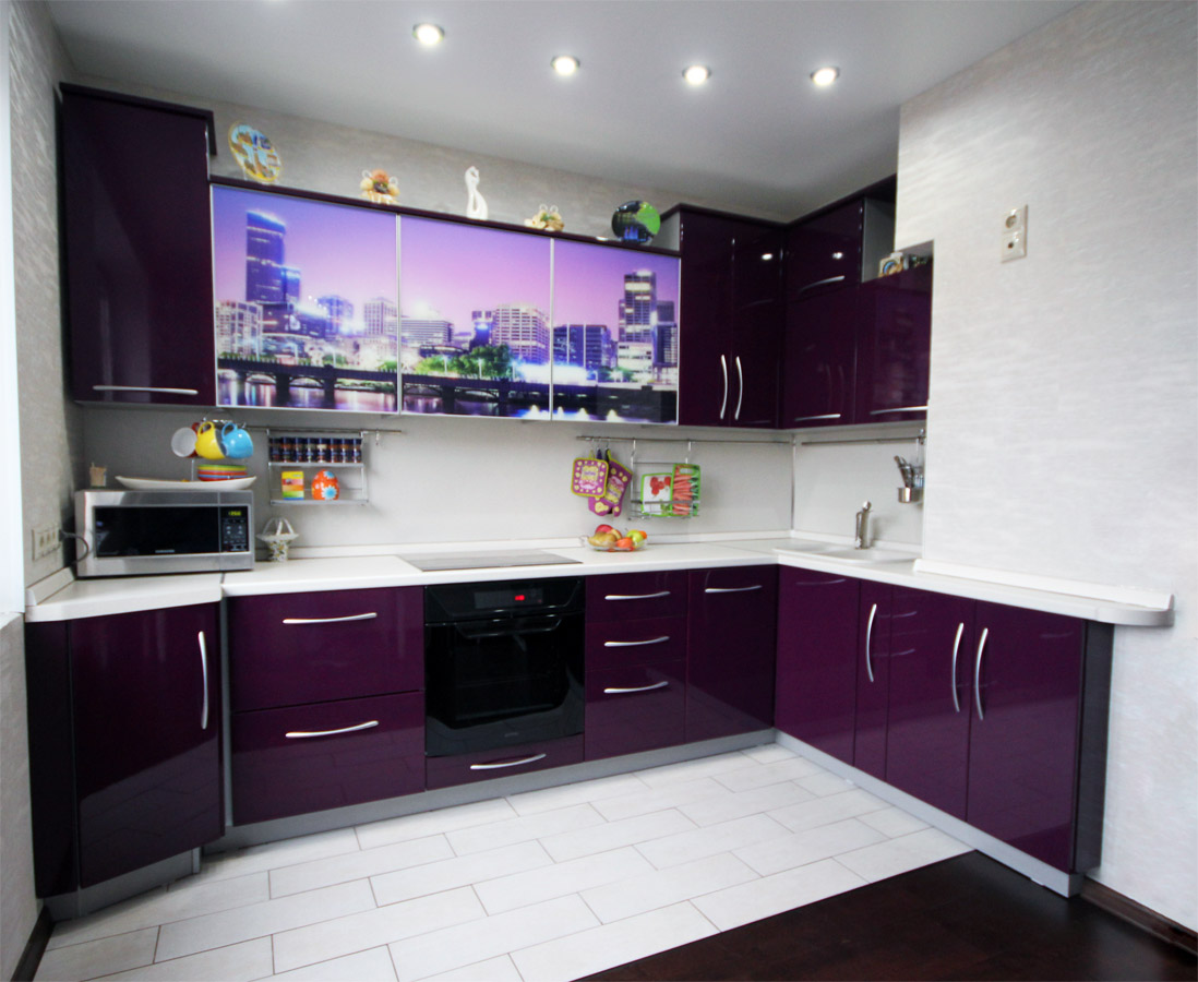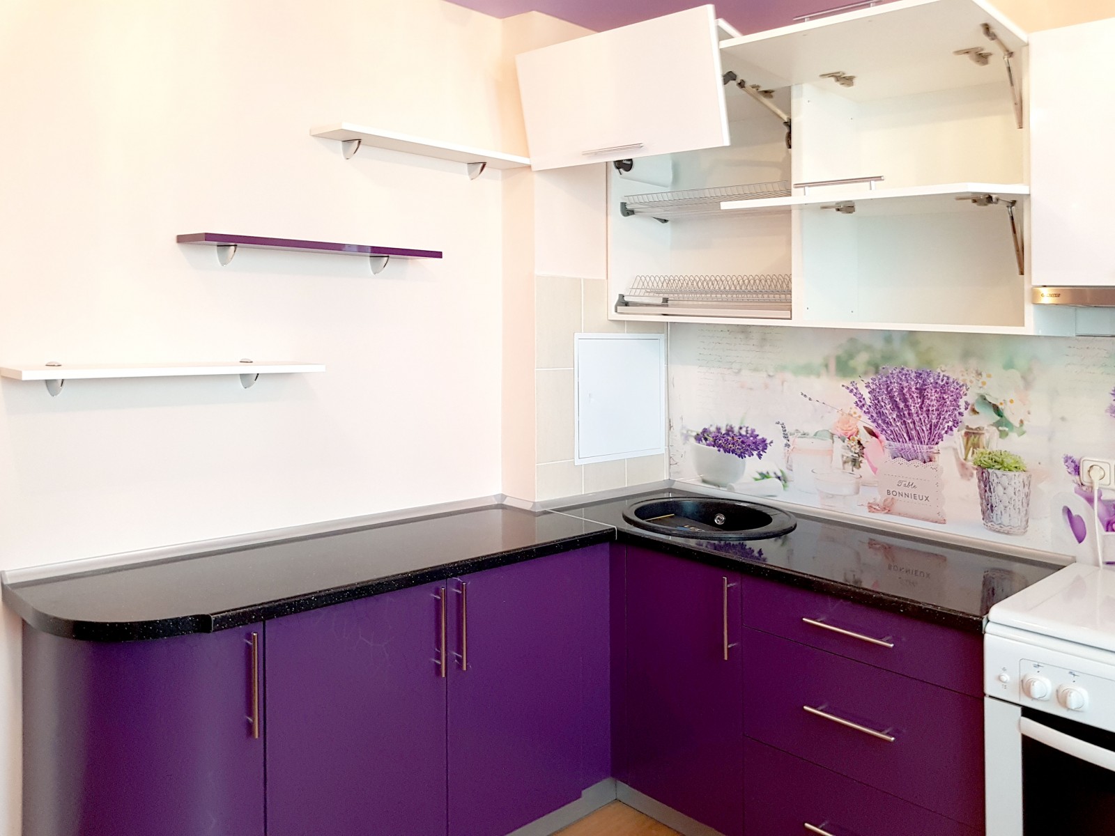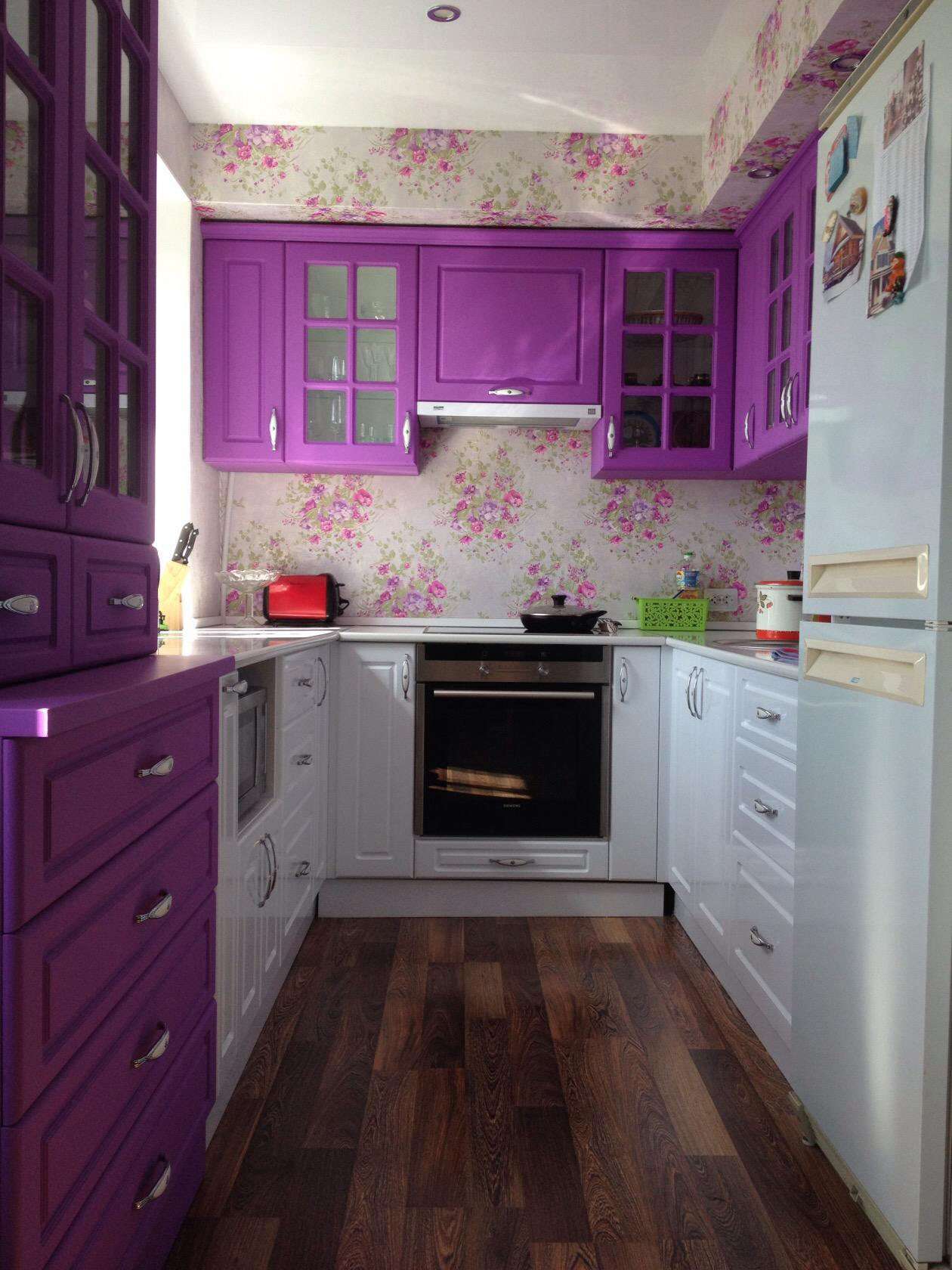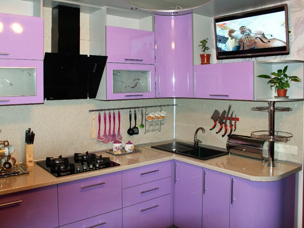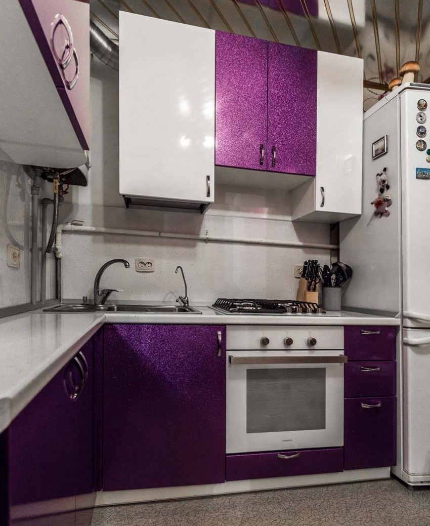 การเลือกครัวมุมที่มีสีม่วงคุณต้องระวังด้วยสายตา "ไม่หลงทาง" เฉดสีเข้มของพื้นหลังหลักสามารถปรับลดได้ดังนี้: