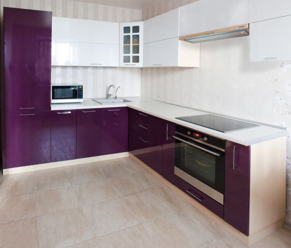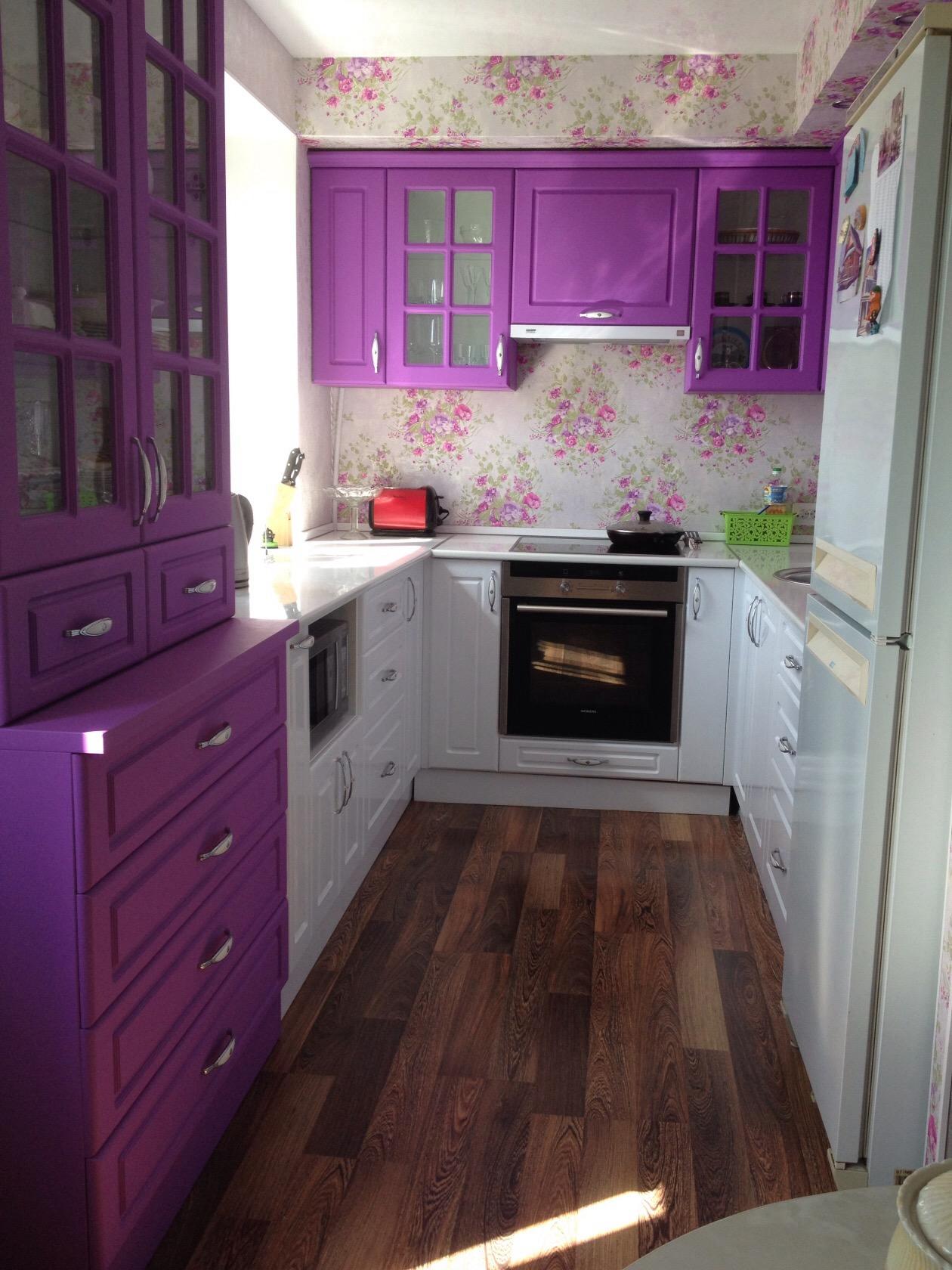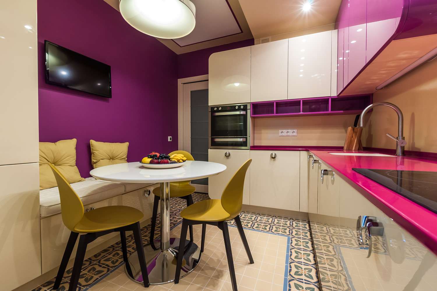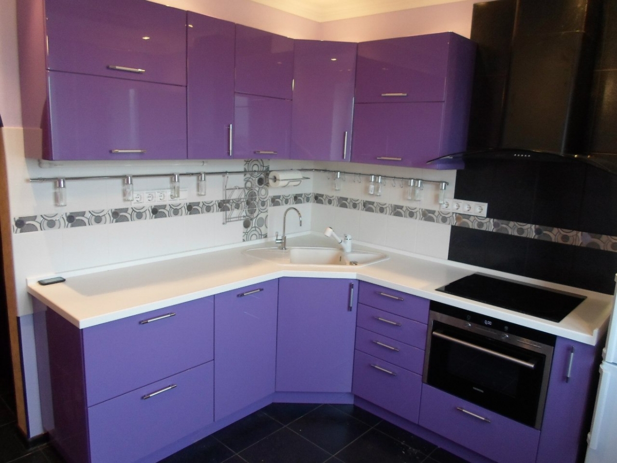 การเลือกครัวมุมที่มีสีม่วงคุณต้องระวังด้วยสายตา "ไม่หลงทาง" เฉดสีเข้มของพื้นหลังหลักสามารถปรับลดได้ดังนี้: