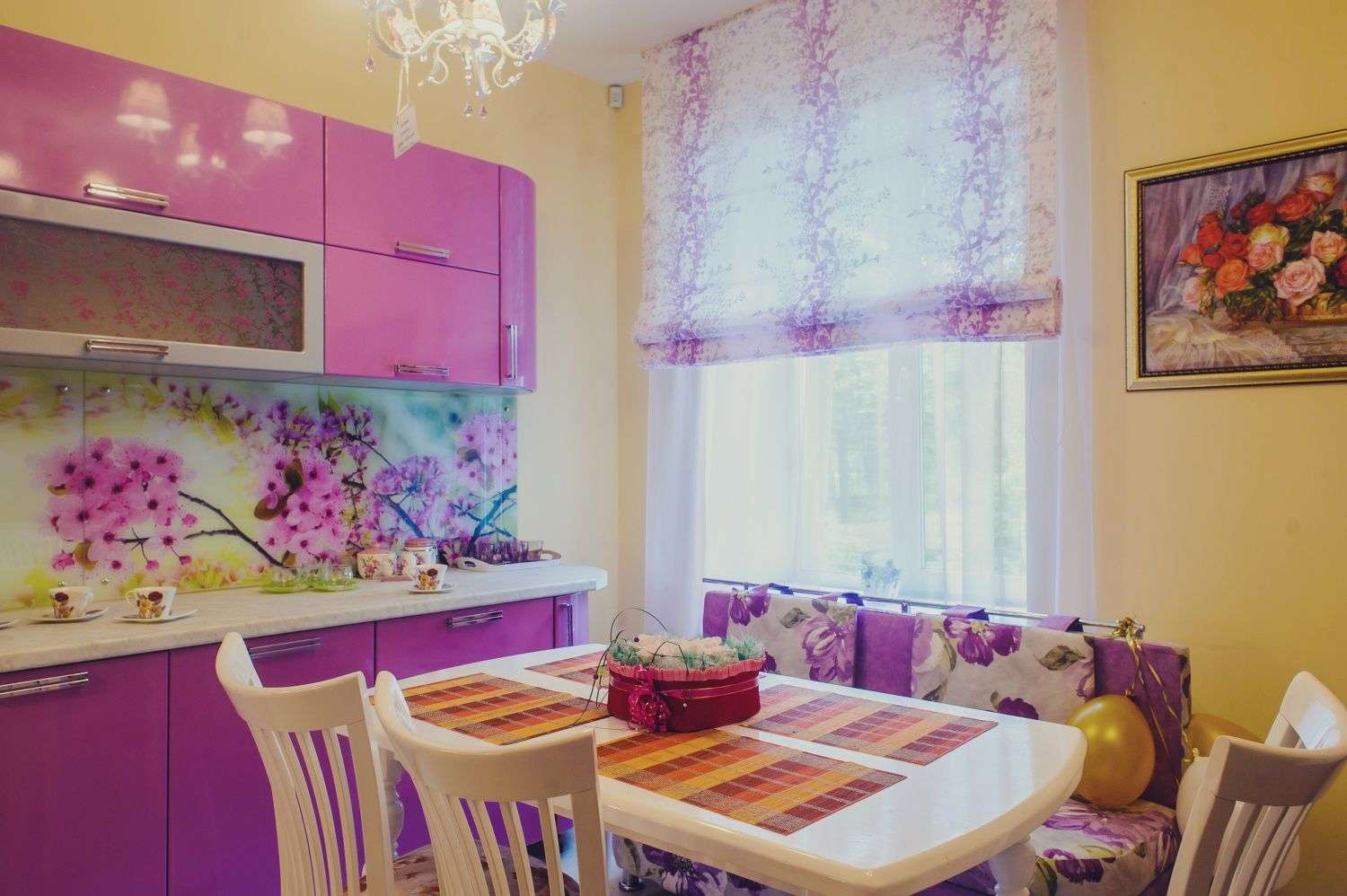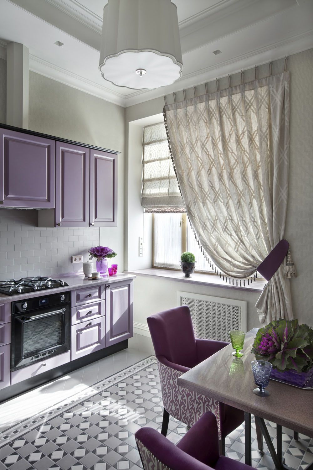 อาจใช้ swagsที่รวมสีม่วงสองเฉดขึ้นไป สำหรับส่วนที่ง่ายพอดีกับผ้า organza, ผ้าชีฟอง, ผ้าม่าน ส่วนที่สองสามารถทำจากผ้าตาข่ายหรือผ้าไหมอัด ความยาวของ pelmets ยังไม่ได้มาตรฐาน. ขึ้นอยู่กับความสูงของห้องเป็นหลัก ห้องครัวที่ไม่สูงมากไม่แนะนำให้เสริมผ้าม่านเข้ากับพื้น
