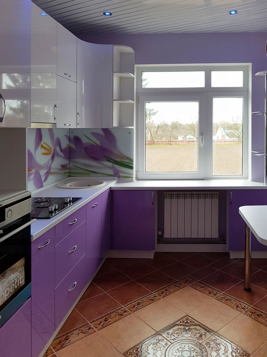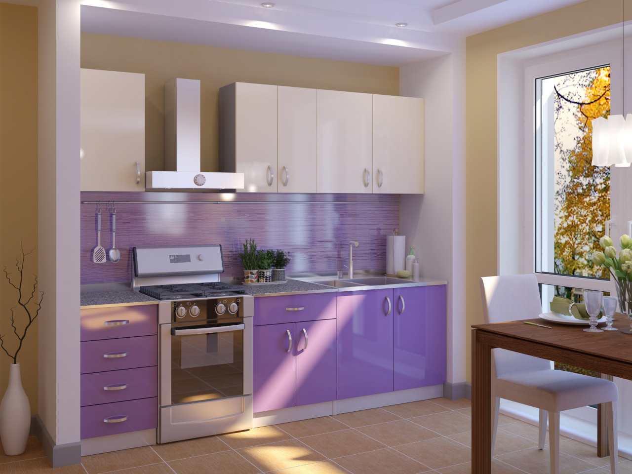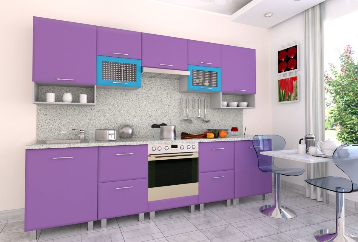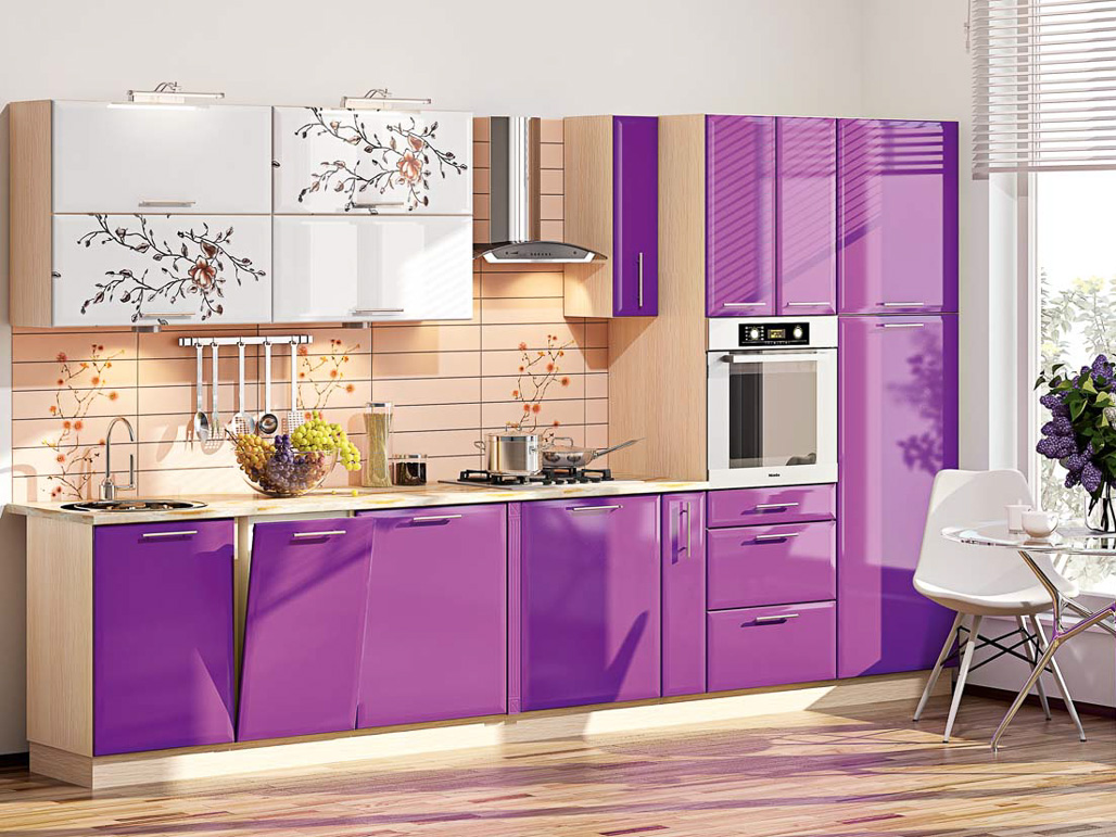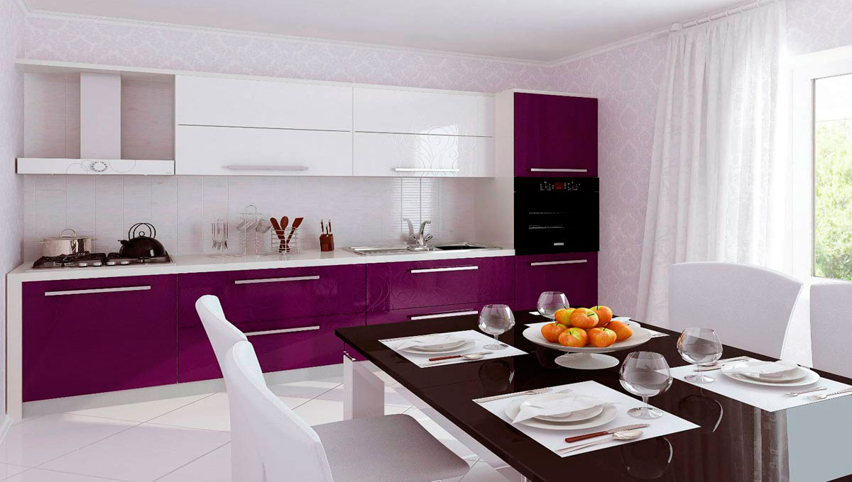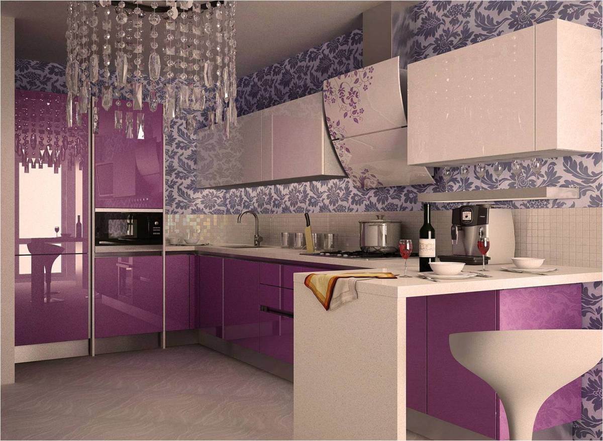 เจือจางของเฉดสีม่วงเข้มด้วยสีที่เบาและเบาที่สุด - ขาว - ผลกำไรทั้งสองด้าน สีขาวสิ้นสุดที่จะปลอดเชื้อและ "ว่าง" และการผสมของสีน้ำเงินและสีแดงจะกลายเป็นแสงและสว่าง ชุดเฟอร์นิเจอร์ที่รวมสองสีนี้เข้าด้วยกันจะไม่มีใครสังเกตเห็น. พวกเขาคือความสำคัญหลักของห้องครัว