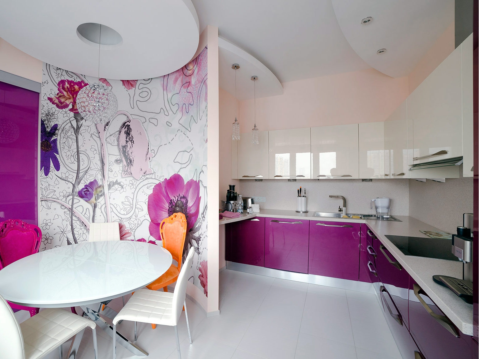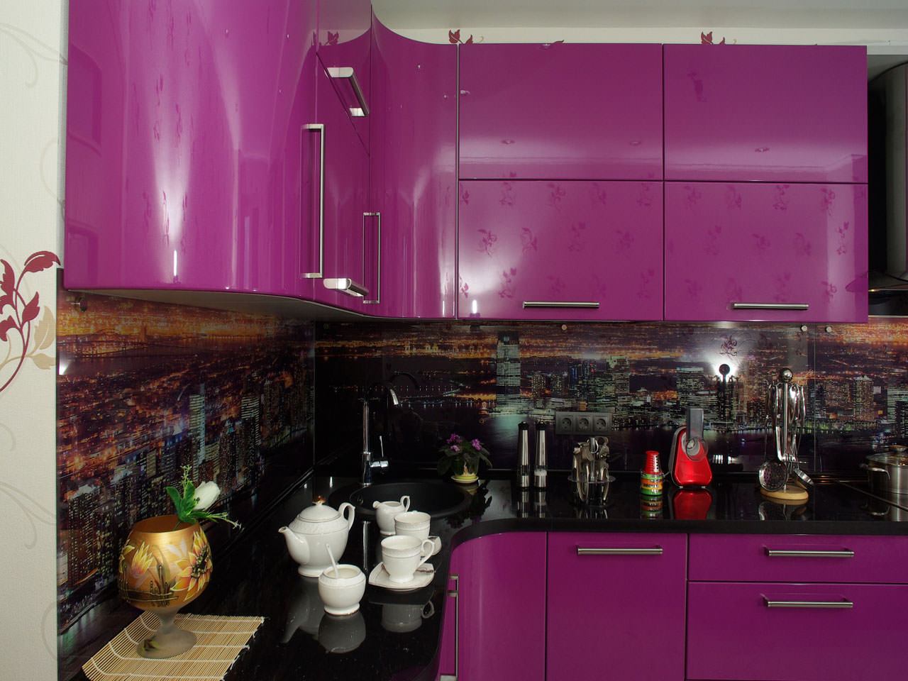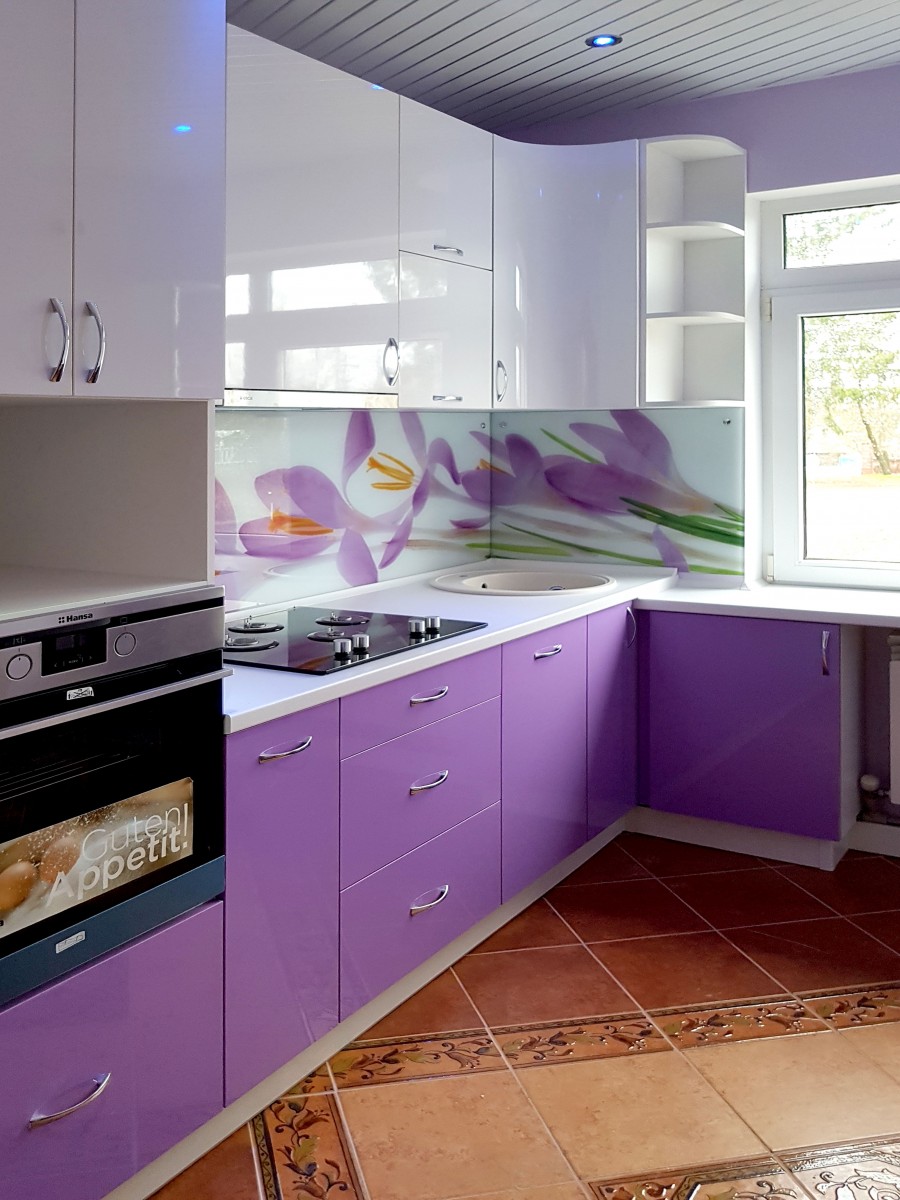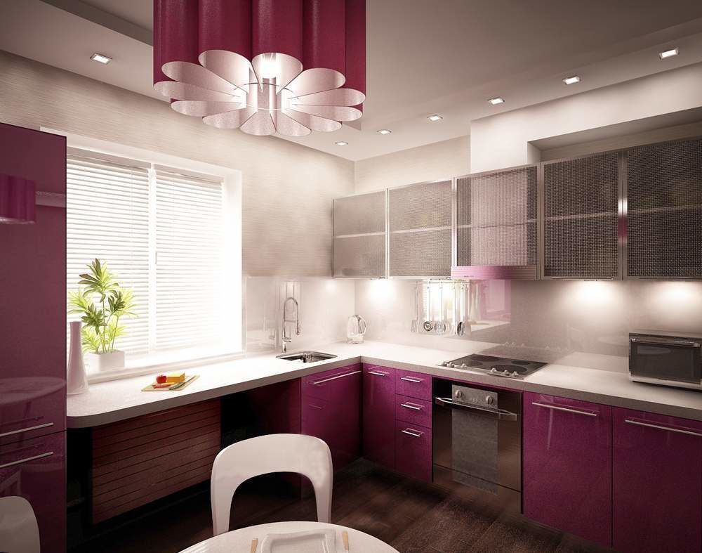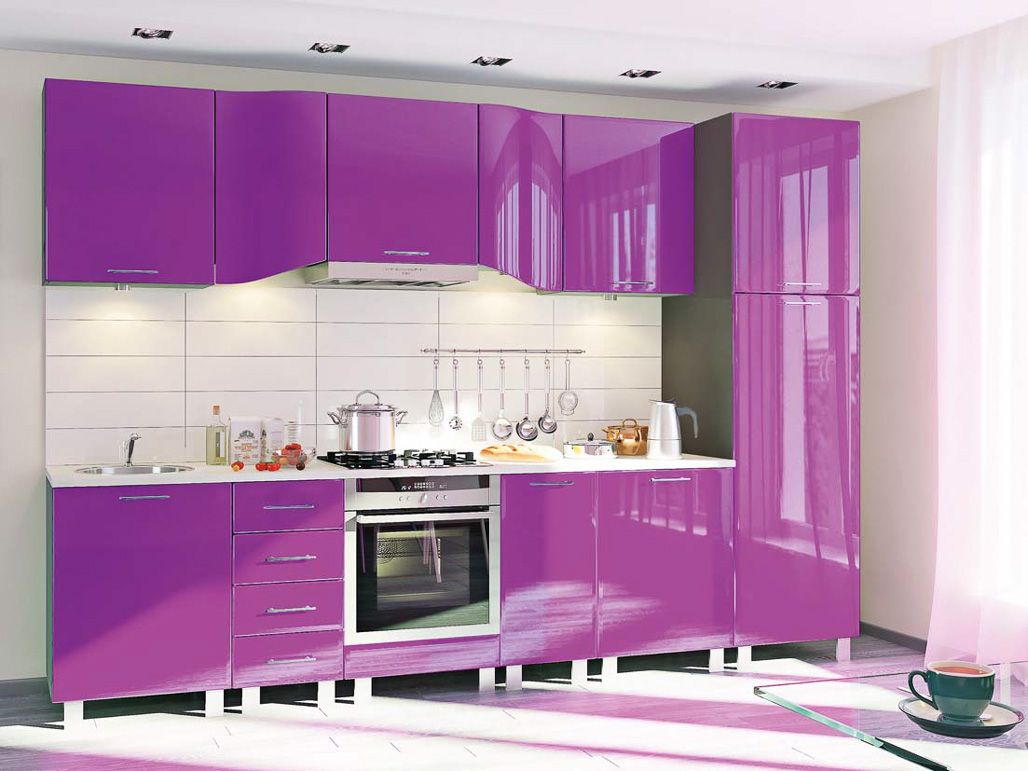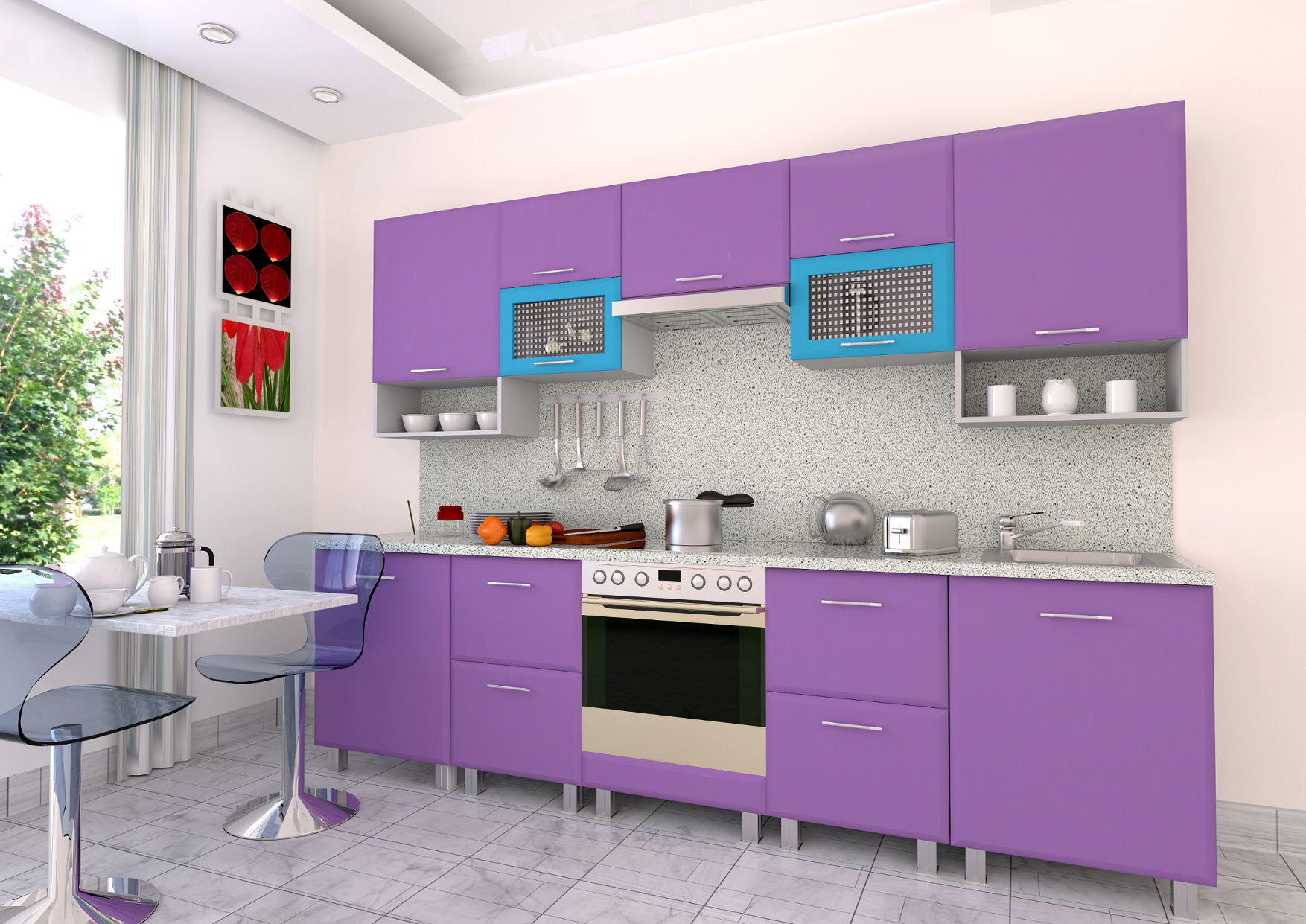 เจือจางของเฉดสีม่วงเข้มด้วยสีที่เบาและเบาที่สุด - ขาว - ผลกำไรทั้งสองด้าน สีขาวสิ้นสุดที่จะปลอดเชื้อและ "ว่าง" และการผสมของสีน้ำเงินและสีแดงจะกลายเป็นแสงและสว่าง ชุดเฟอร์นิเจอร์ที่รวมสองสีนี้เข้าด้วยกันจะไม่มีใครสังเกตเห็น. พวกเขาคือความสำคัญหลักของห้องครัว