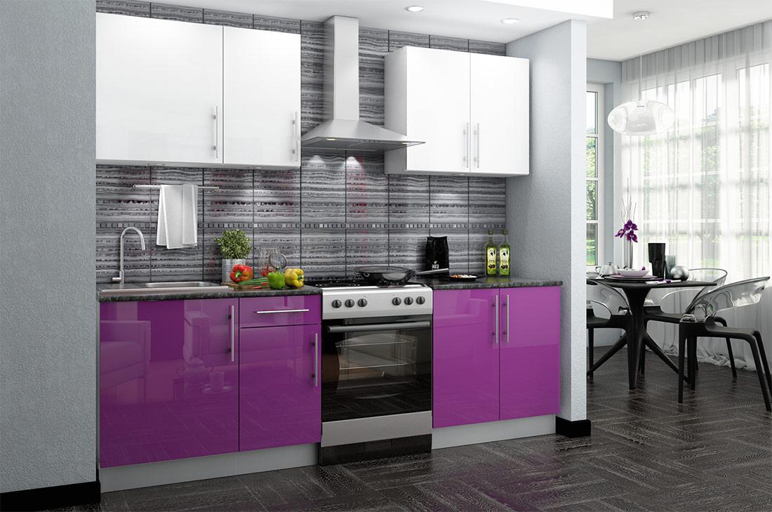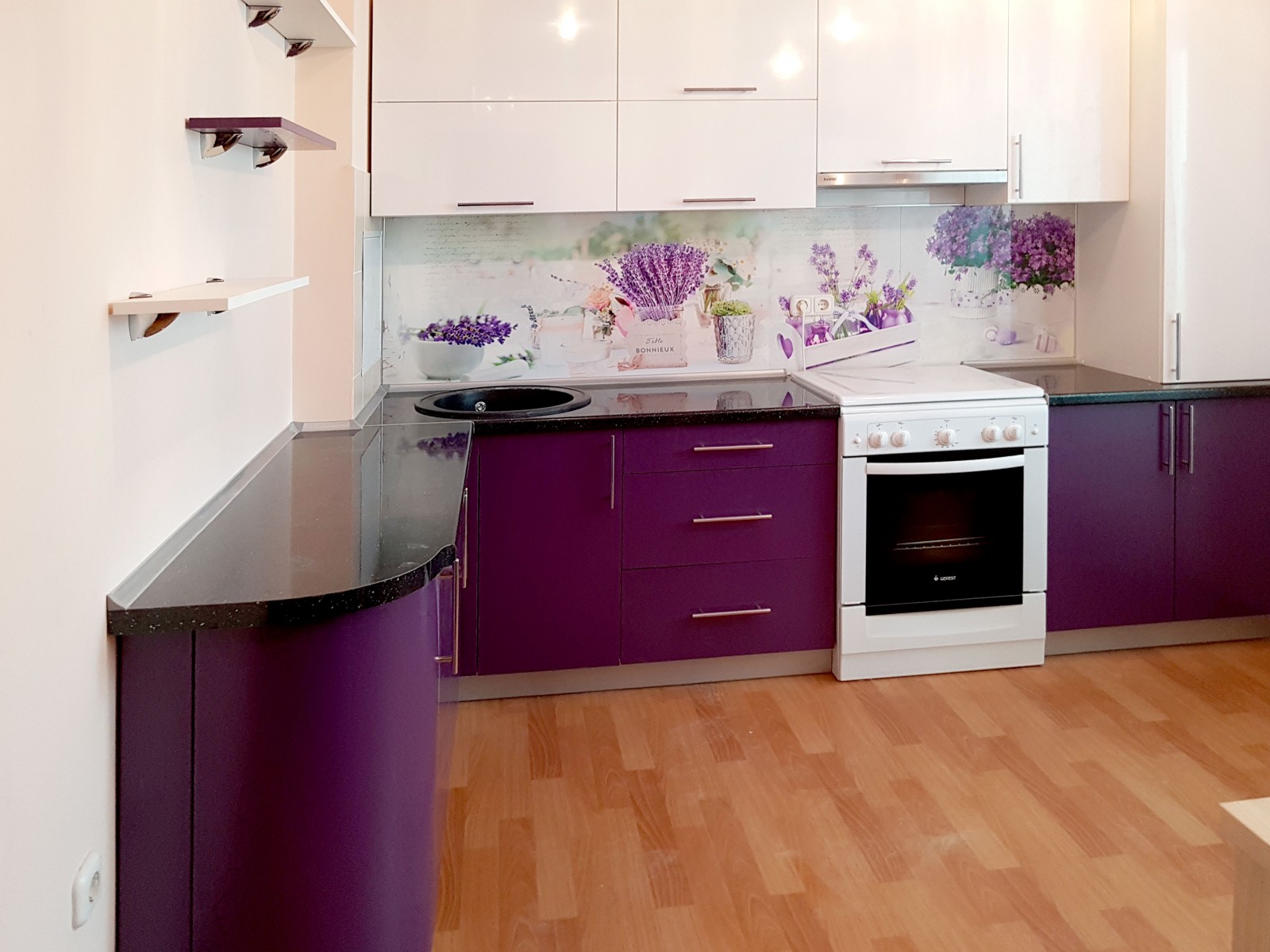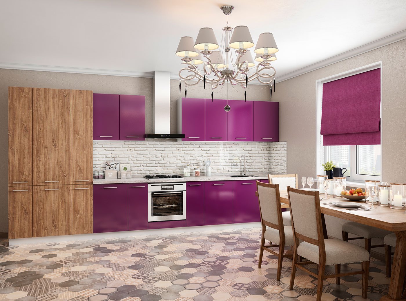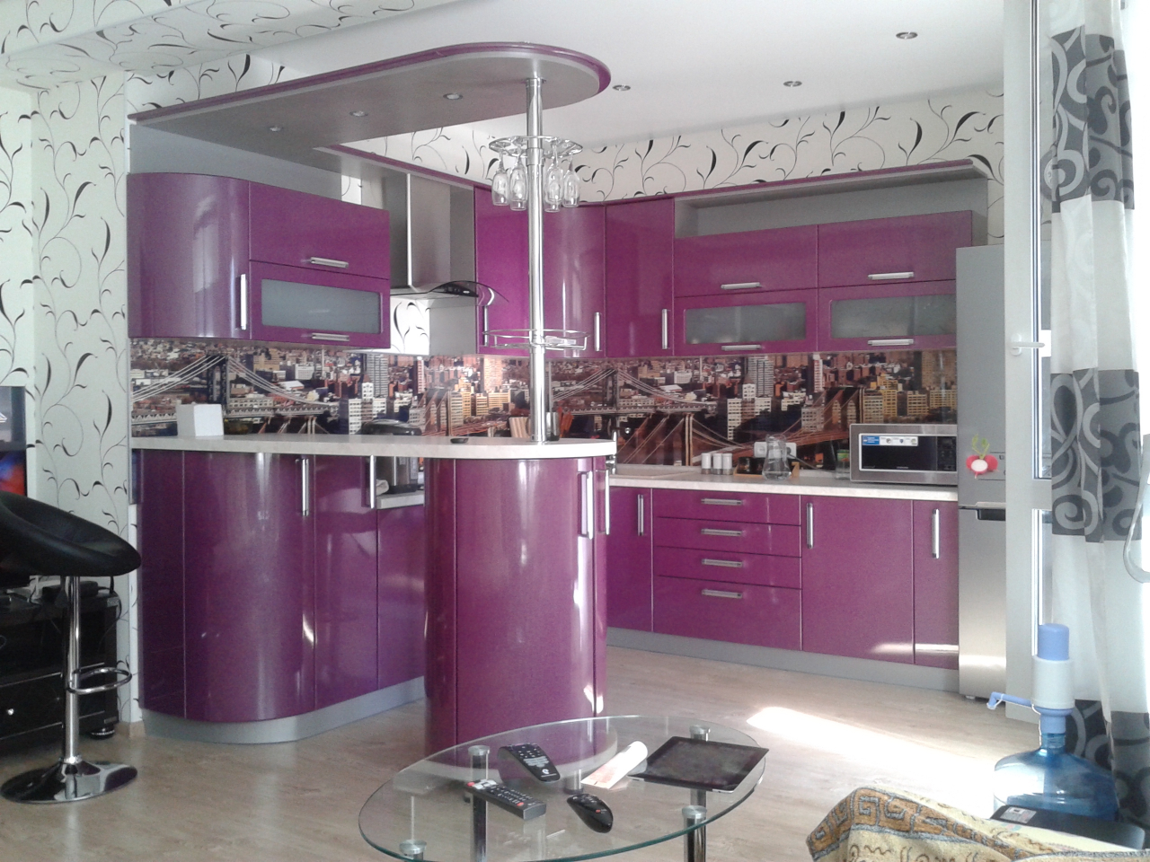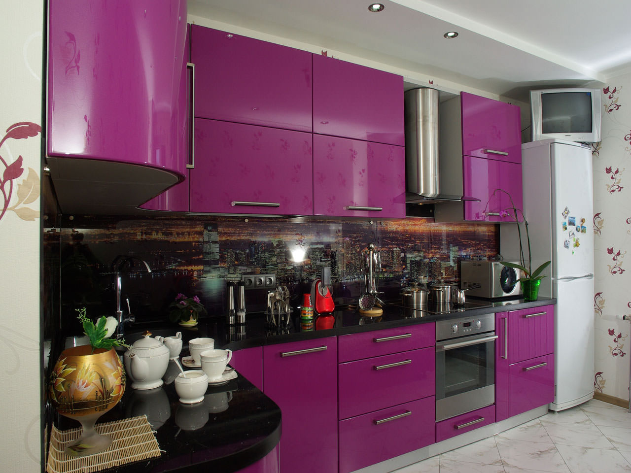 เจือจางของเฉดสีม่วงเข้มด้วยสีที่เบาและเบาที่สุด - ขาว - ผลกำไรทั้งสองด้าน สีขาวสิ้นสุดที่จะปลอดเชื้อและ "ว่าง" และการผสมของสีน้ำเงินและสีแดงจะกลายเป็นแสงและสว่าง ชุดเฟอร์นิเจอร์ที่รวมสองสีนี้เข้าด้วยกันจะไม่มีใครสังเกตเห็น. พวกเขาคือความสำคัญหลักของห้องครัว