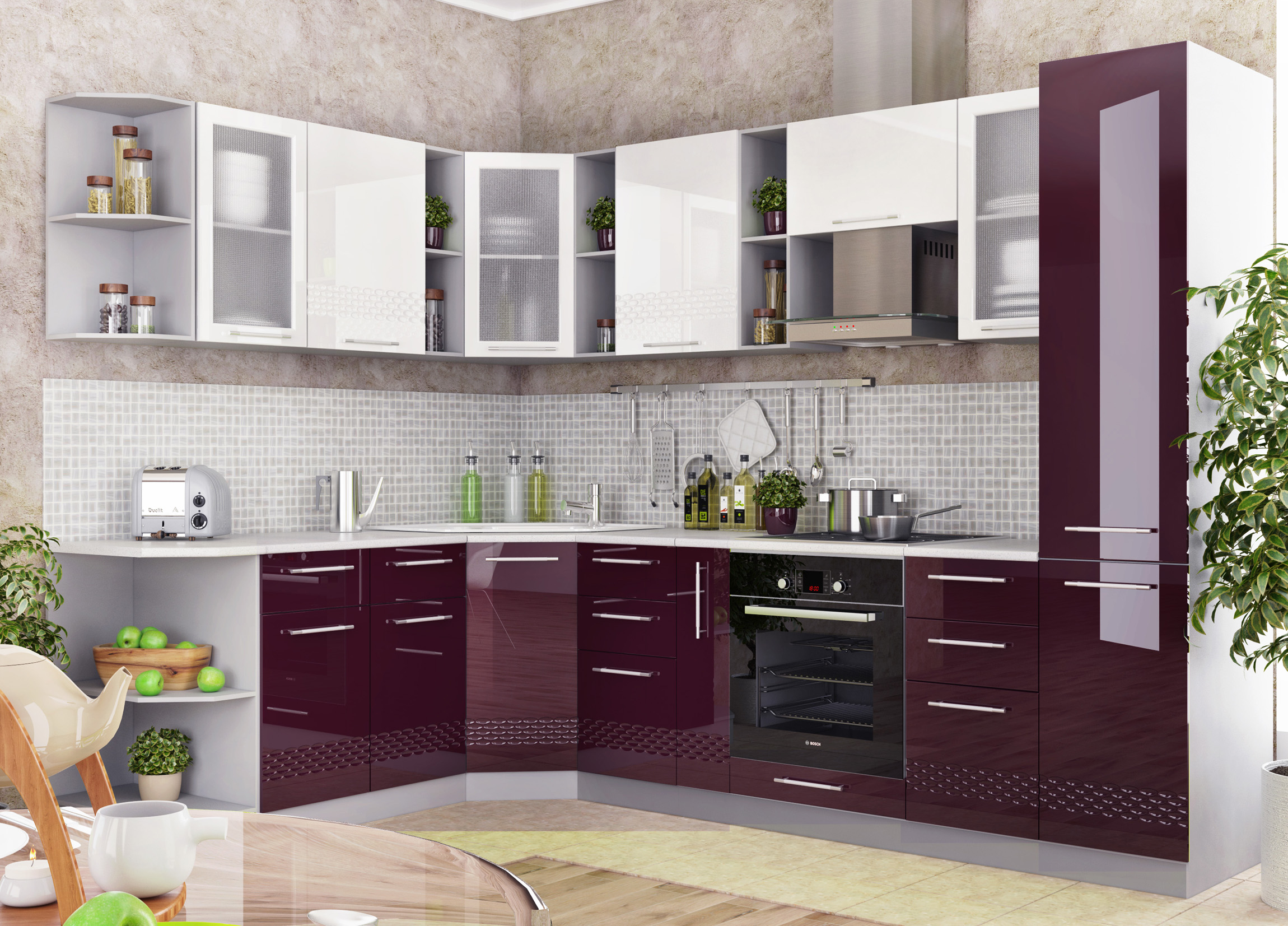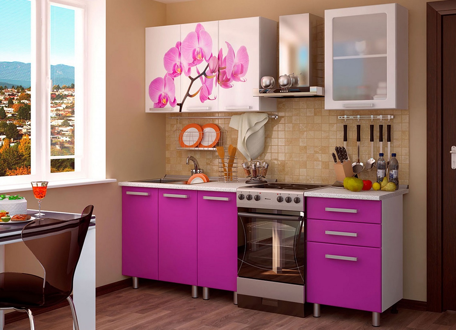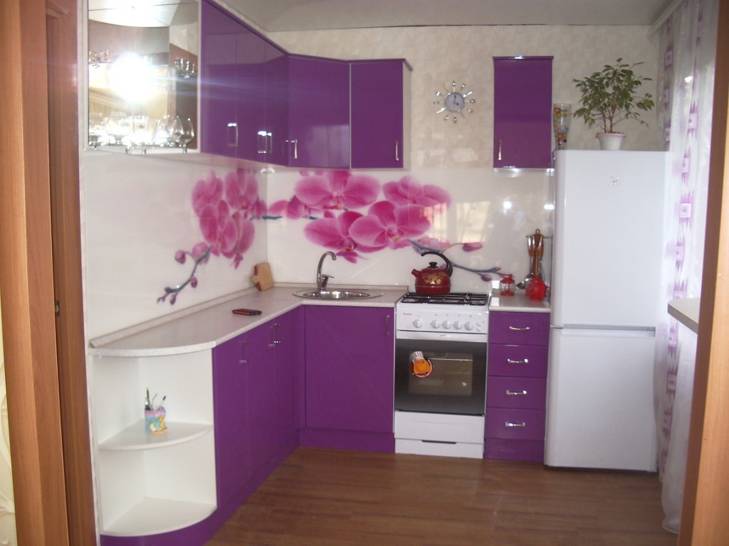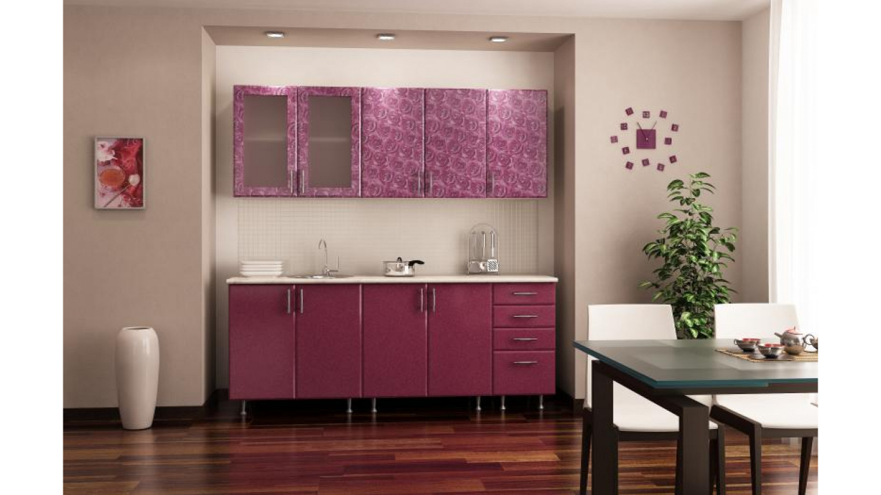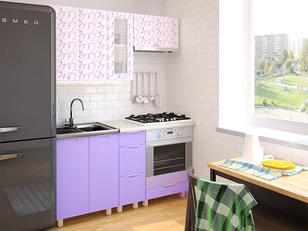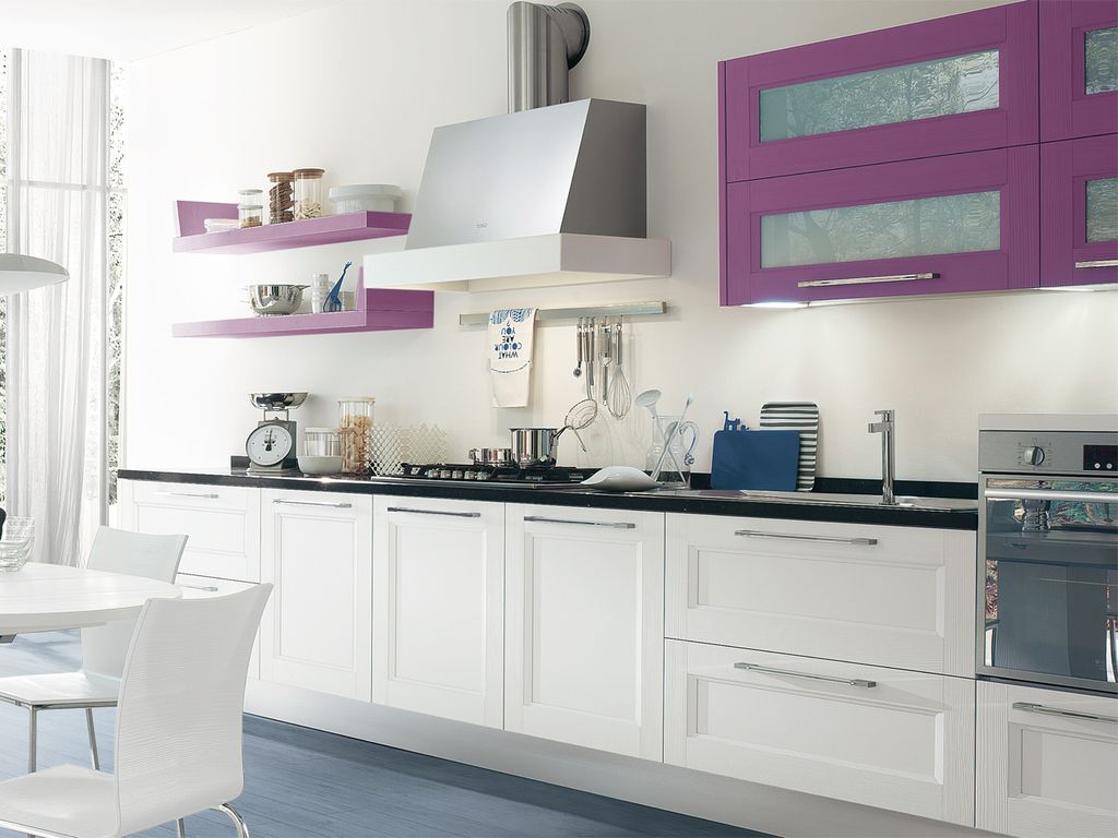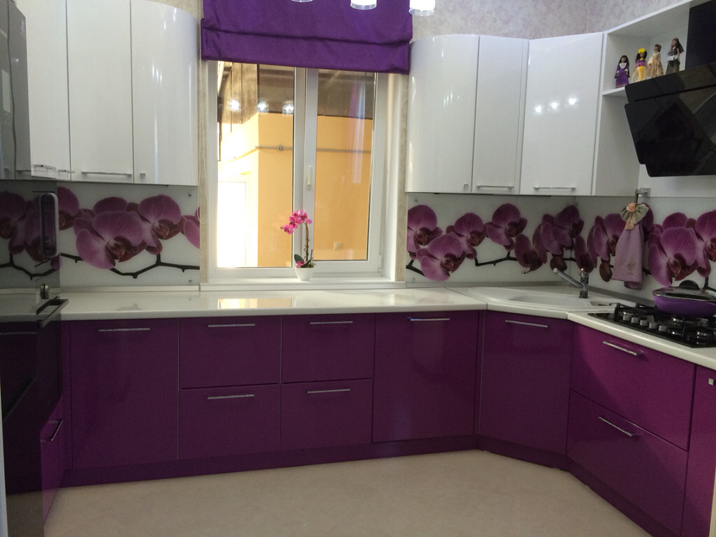 เจือจางของเฉดสีม่วงเข้มด้วยสีที่เบาและเบาที่สุด - ขาว - ผลกำไรทั้งสองด้าน สีขาวสิ้นสุดที่จะปลอดเชื้อและ "ว่าง" และการผสมของสีน้ำเงินและสีแดงจะกลายเป็นแสงและสว่าง ชุดเฟอร์นิเจอร์ที่รวมสองสีนี้เข้าด้วยกันจะไม่มีใครสังเกตเห็น. พวกเขาคือความสำคัญหลักของห้องครัว