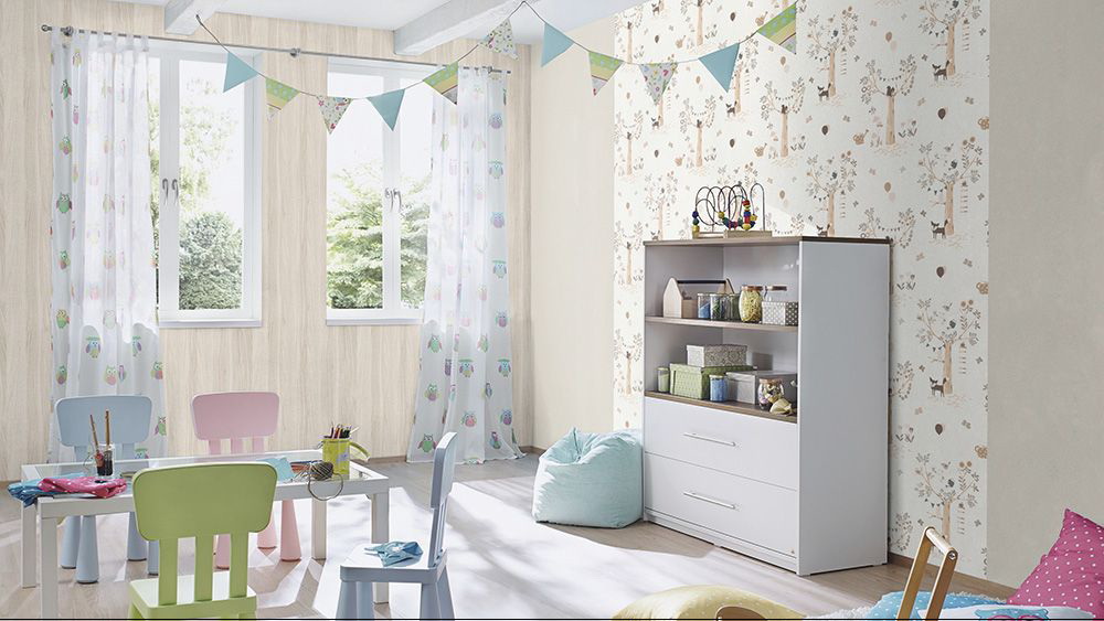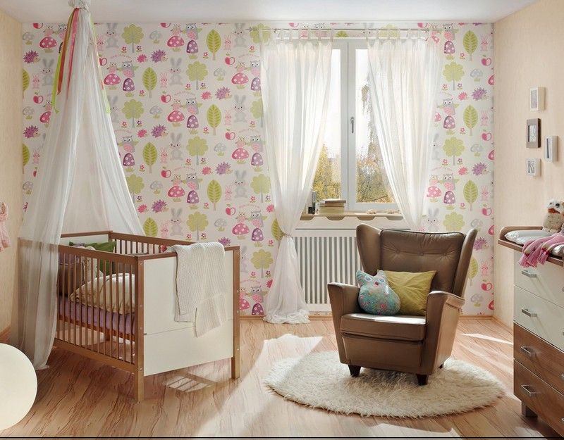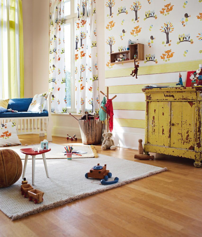 ความหลากหลายของพื้นผิว, ภาพวาด, เครื่องประดับใจความและดอกไม้, กราฟฟิตีจะทำให้พื้นที่มีอารมณ์ที่เงียบสงบที่จำเป็นสำหรับสุขภาพของจิตใจของเด็ก การเคลือบสีที่มีความสว่างและอุดมสมบูรณ์ส่วนใหญ่นั้นเหมาะสำหรับห้องเด็ก เด็กที่มีความเห็นชอบยอมรับการออกแบบการเย็บปะติดปะต่อกันด้วยดอกไม้, ดาว, ภาพของตัวการ์ตูน, ตัวละครในเทพนิยาย ผนังตกแต่งด้วยวอลล์เปเปอร์ภาพดูดี