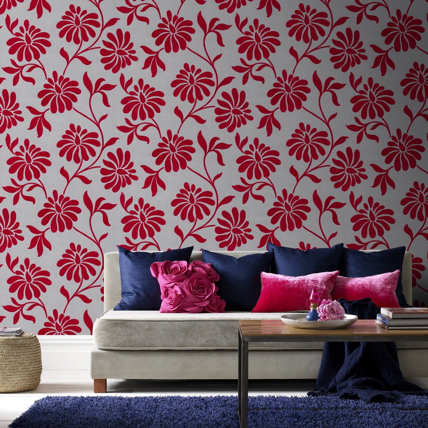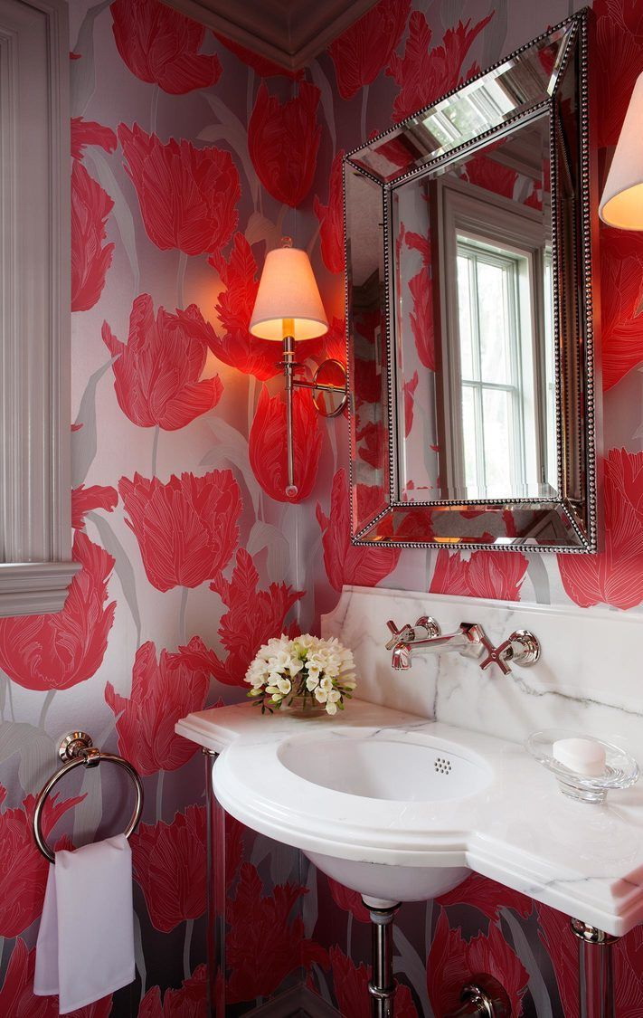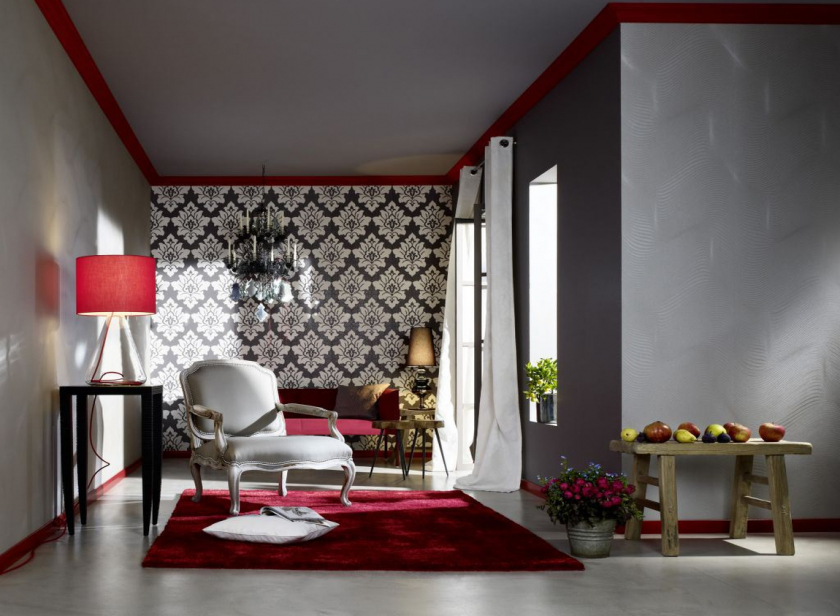 วอลล์เปเปอร์บรรจุอย่างสมบูรณ์แบบในสีแดงด้วย สีน้ำตาลม่วงและชมพู สำหรับความคมชัดนั้นถูกรวมเข้ากับภาพวาดขาวดำ ภาพวาดที่มีพื้นหลังสีแดงเบอร์กันดีครบครันด้วยสีชมพูฟักทอง สีดำ เฉดสี