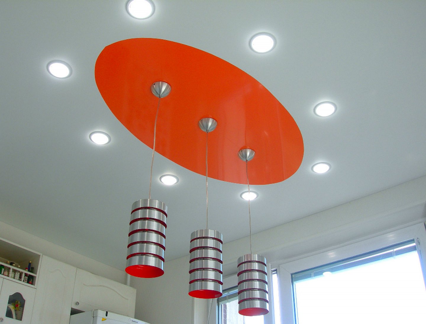 - สปอตไลท์ในตัว ตัวเลือกนี้เหมาะสำหรับบ้านที่มีเพดานต่ำ โดยที่หลังจากการติดตั้งเพดานสูงที่ถูกระงับอื่นยังคงค่อนข้างเล็ก ร้านค้ามีสปอตไลท์ให้เลือกมากมาย พวกเขาอาจมีรูปร่างและสีต่างกัน