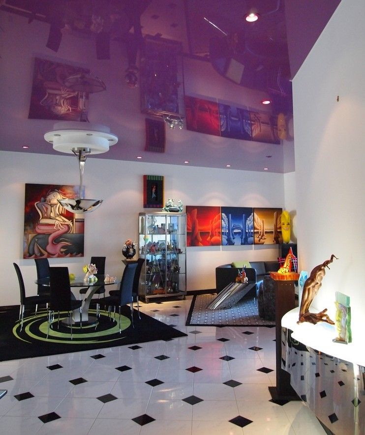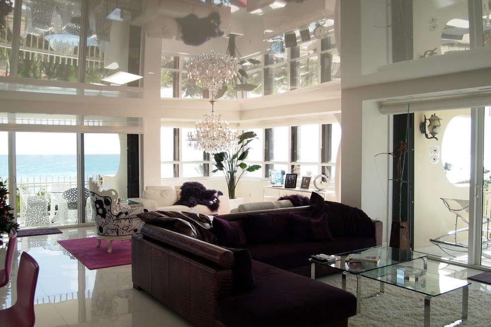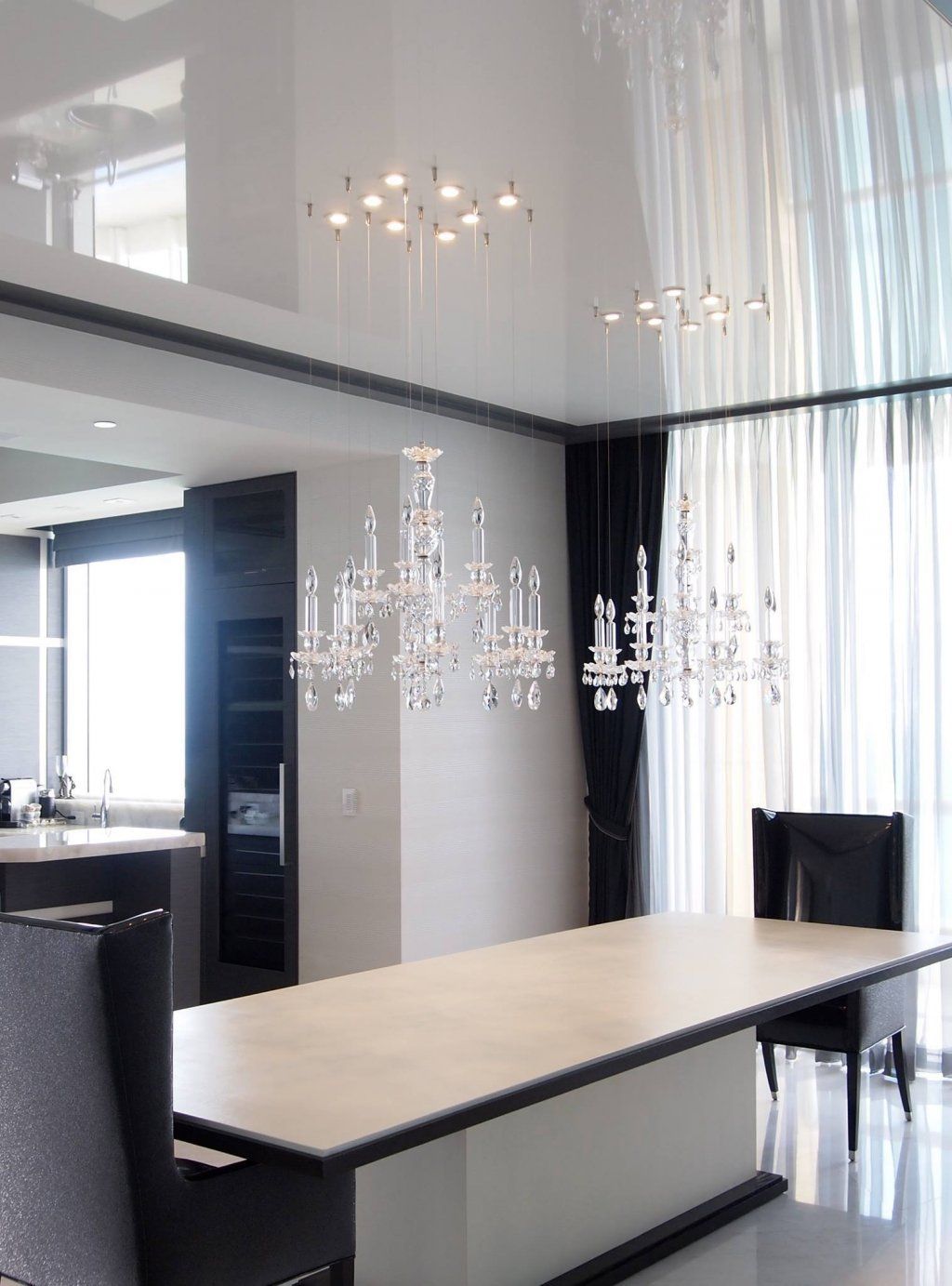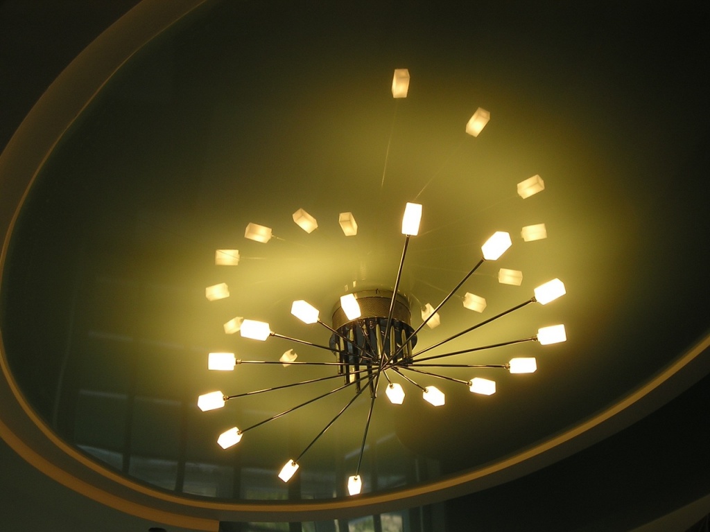 โคมระย้านี้จะดูดีบนพื้นหลังของเพดานยืดด้าน หากคุณเลือกแสงสำหรับพื้นผิวมันวาวของผ้าใบมันจะเป็นการดีกว่าถ้าคุณเลือกใช้อุปกรณ์ส่องสว่างในรูปทรงของซีกโลกเนื่องจากมันสะท้อนอย่างสวยงามในผ้าใบมัน ตัวเลือกที่เป็นสากลสำหรับเพดานเคลือบและมันวาว - ผลิตภัณฑ์ rozhkov แนวนอนจำนวนมาก