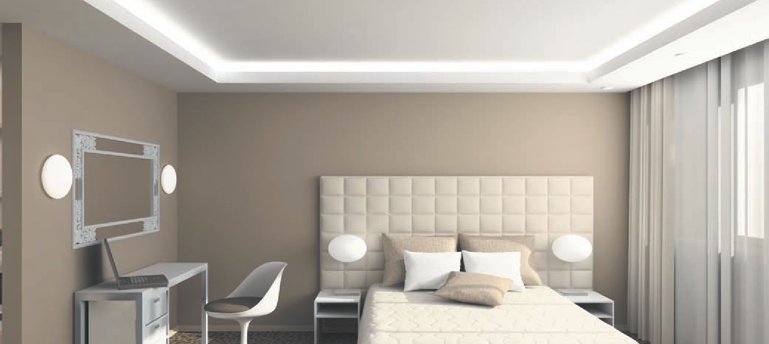 - แสงรอบนอก แสงดังกล่าวถูกติดตั้งรอบปริมณฑลของห้องทั้งห้อง และทำให้เพดานดูสูงขึ้น แสงดังกล่าวไม่สว่างมาก แต่สร้างบรรยากาศสบาย ๆ ในห้องนอนเพื่อการพักผ่อนดูทีวีหรือทำงานกับคอมพิวเตอร์