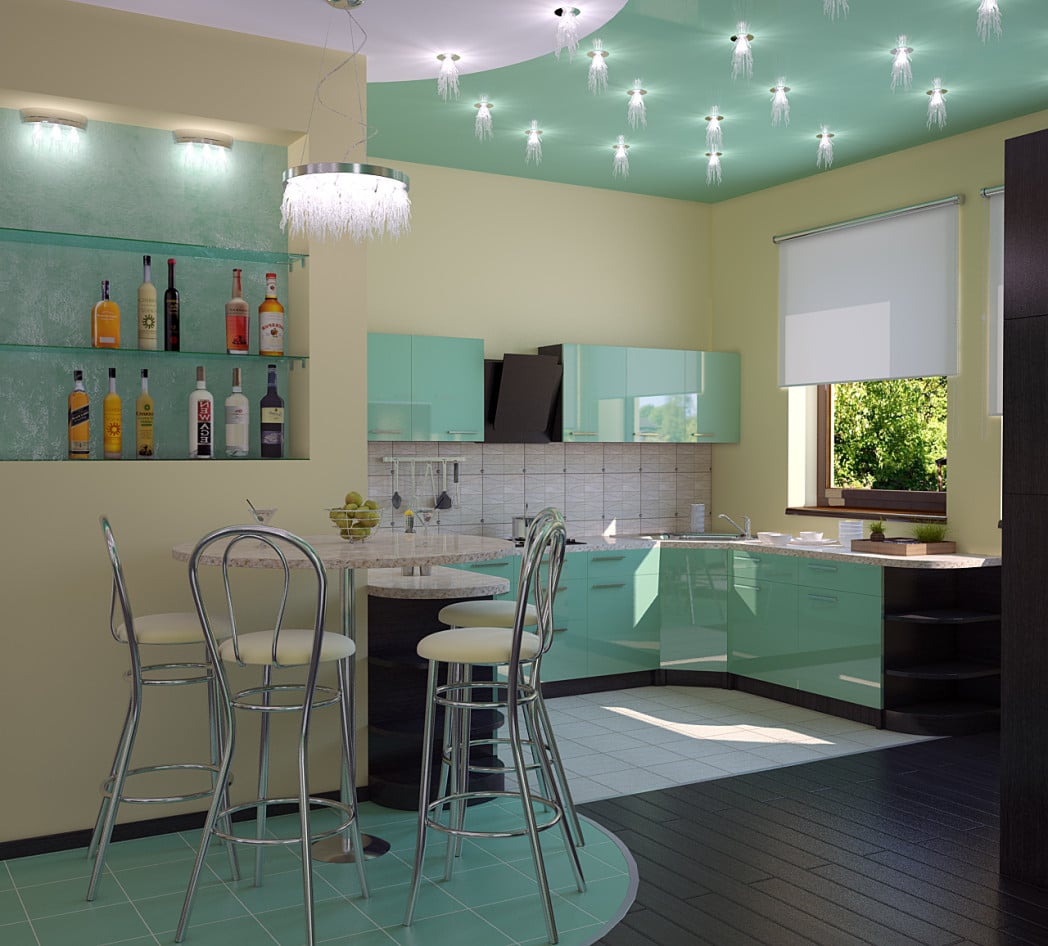 ตัวเลือกที่ดีสำหรับห้องครัวขนาดเล็กพร้อมเพดานต่ำและพื้นที่ขนาดเล็ก คุณสามารถเลือกผลิตภัณฑ์ที่เหมาะสมในรูปแบบและการออกแบบสี