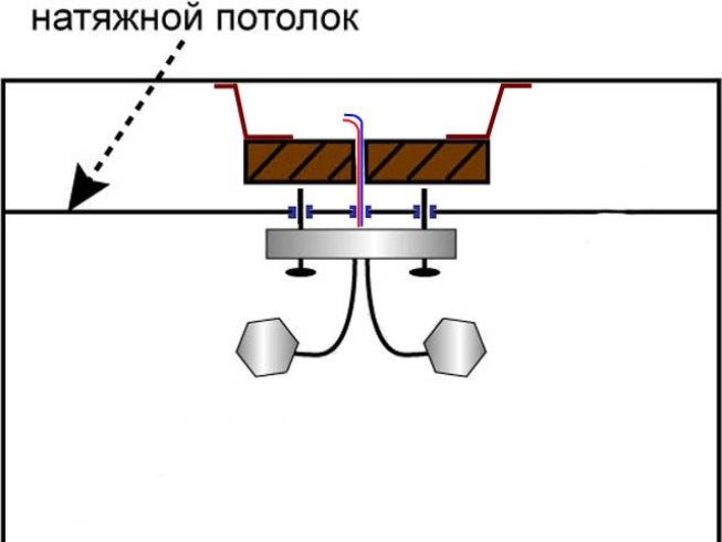 - โคมระย้าจะต้องได้รับการแก้ไขโดยตรงกับกระแสหลักเพื่อให้โคมไฟติดอยู่กับที่อย่างปลอดภัย ในการทำเช่นนี้มีระบบติดตั้งพิเศษที่ช่วยให้คุณติดตั้งโคมระย้าสำหรับเพดานยืดได้ติดตั้งบนหลัก