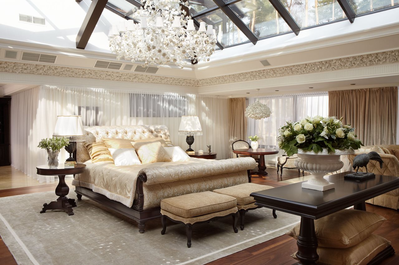 เพดานดีกว่าที่จะทำให้ยืดคริสตัลโคมระย้าจะเพิ่มความมั่งคั่งร่วมกับไฟสปอร์ตไลท์ คุณสามารถใช้ปูนปั้นลวดลายเรียบ ทั้งหมดนี้จะเน้นสไตล์ที่ทันสมัย