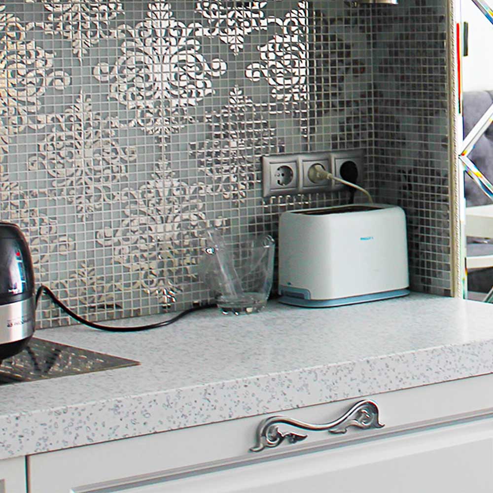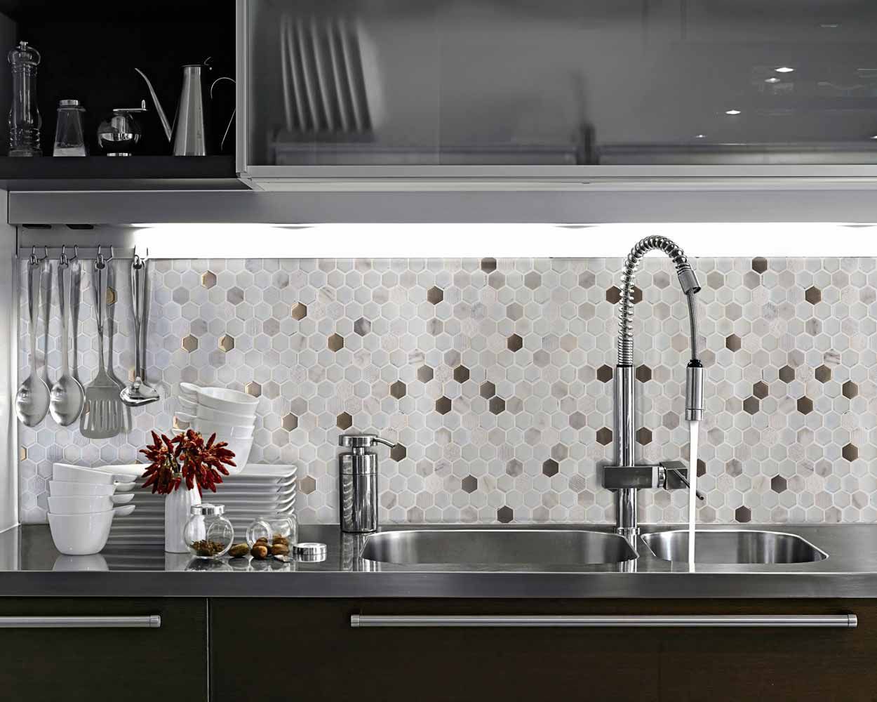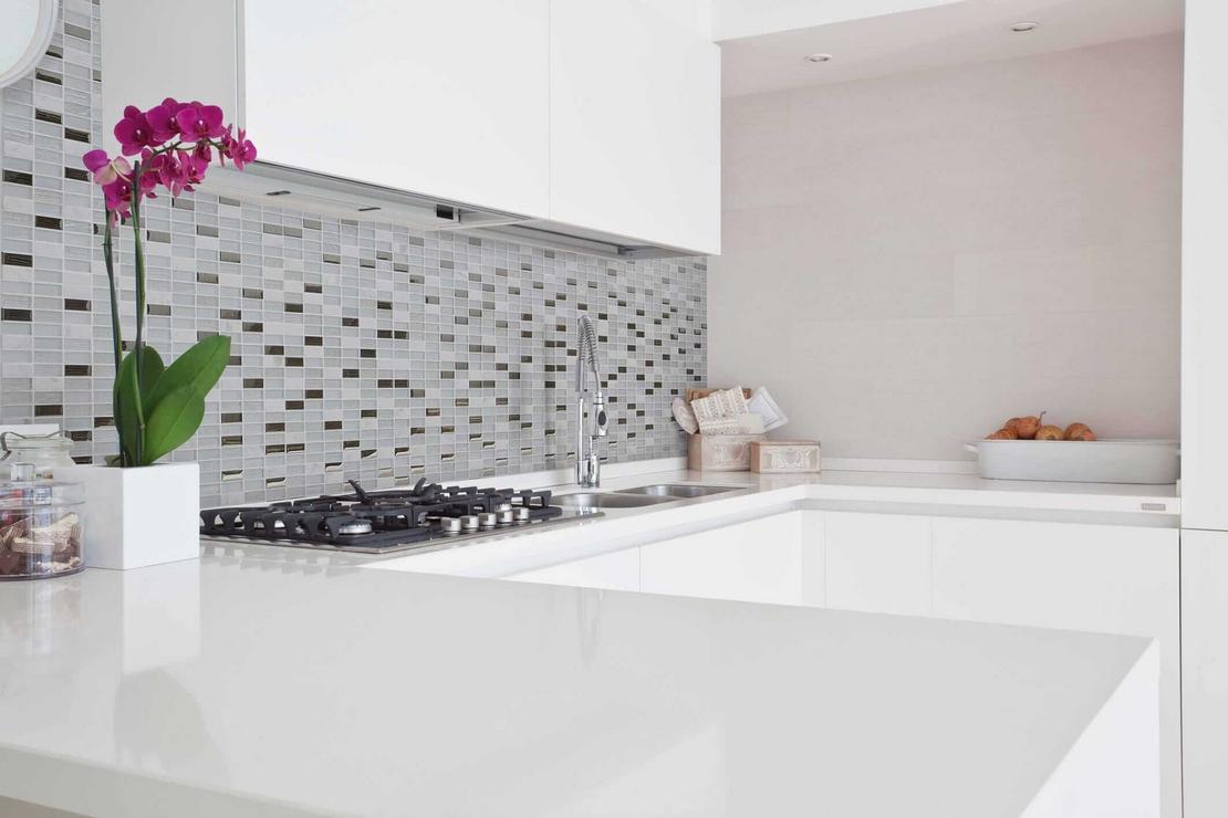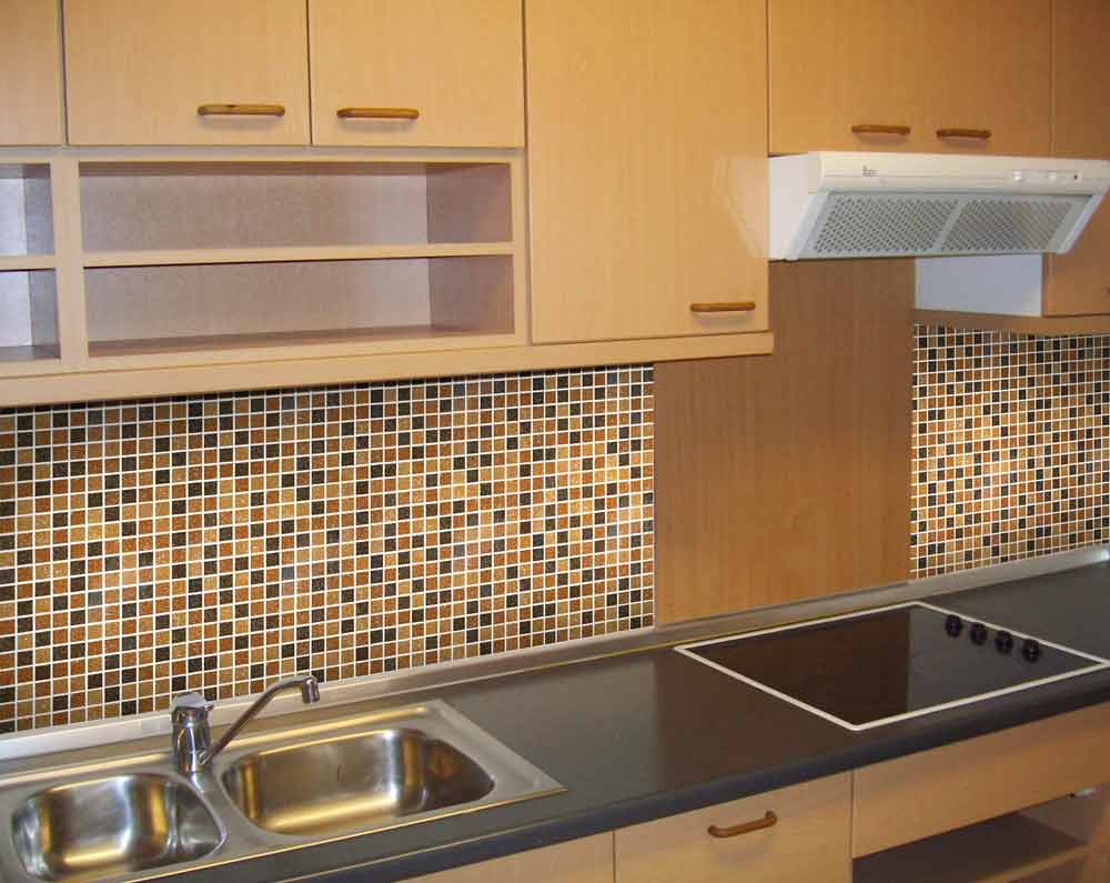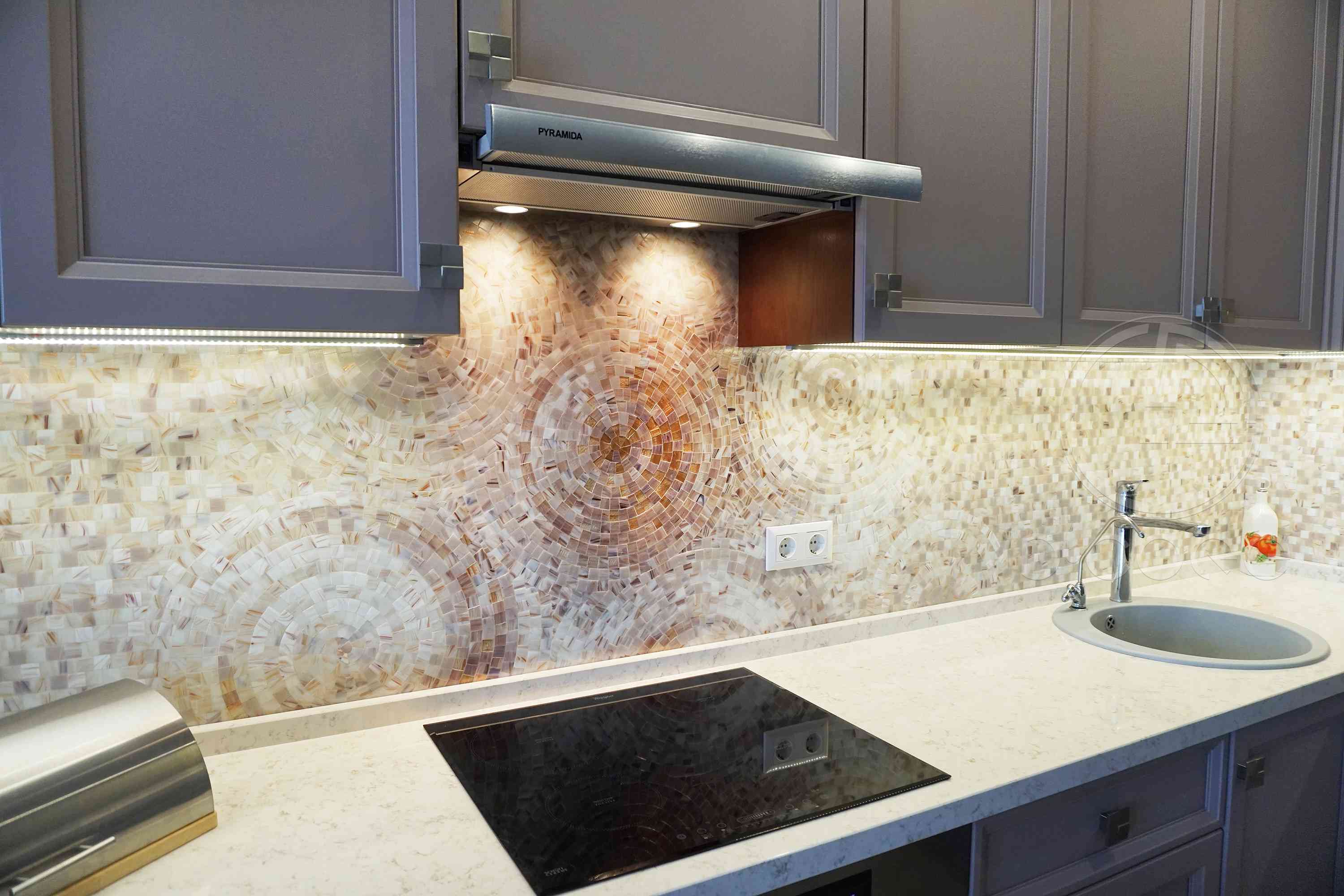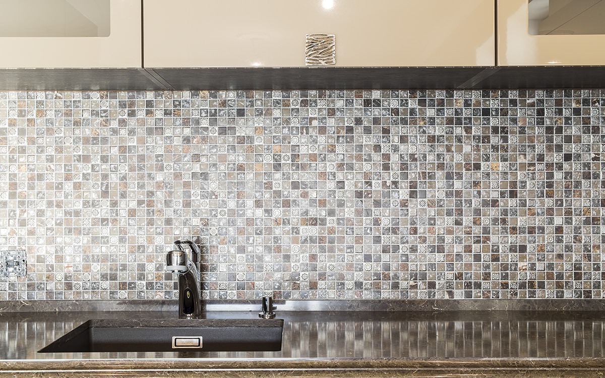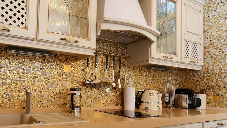 กำแพงการทำงาน ในห้องครัว เรียกว่าผ้ากันเปื้อน บริเวณนี้มีน้ำจาระบีดังนั้นจึงแนะนำให้วางกระเบื้องโมเสคผ้ากันเปื้อนออกซึ่งเป็นกระเบื้องขนาดเล็กปกติ