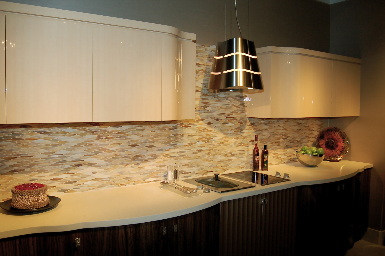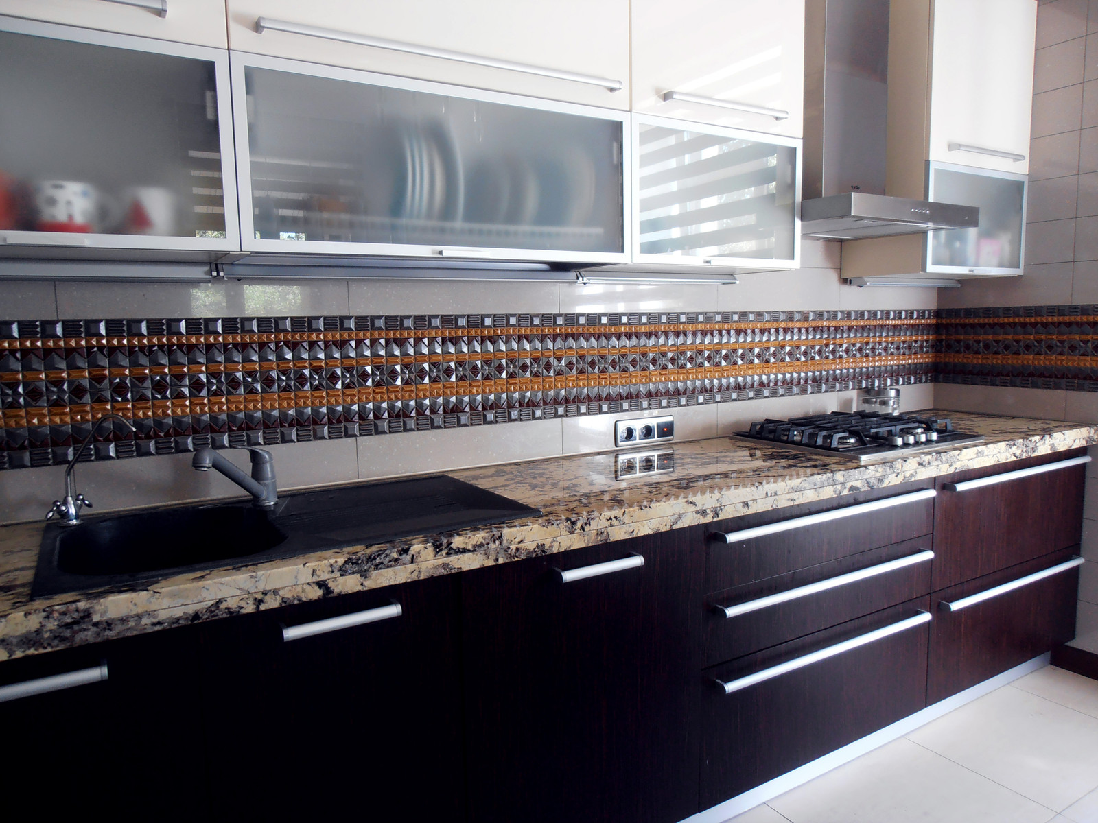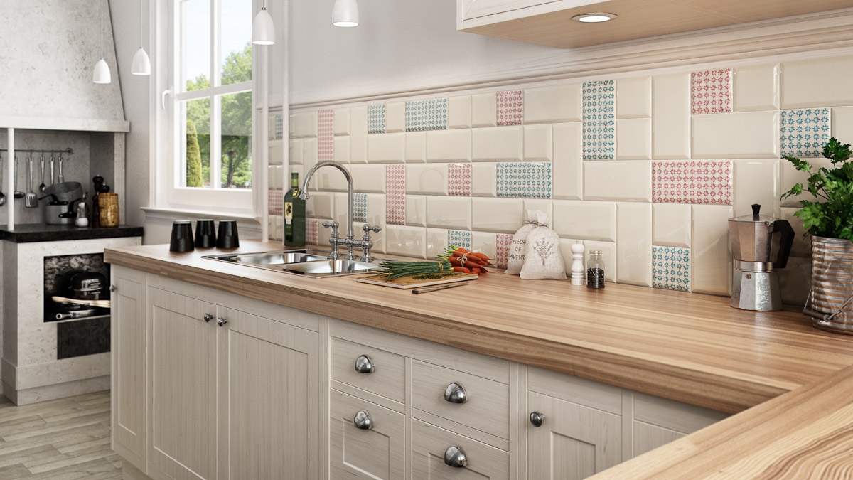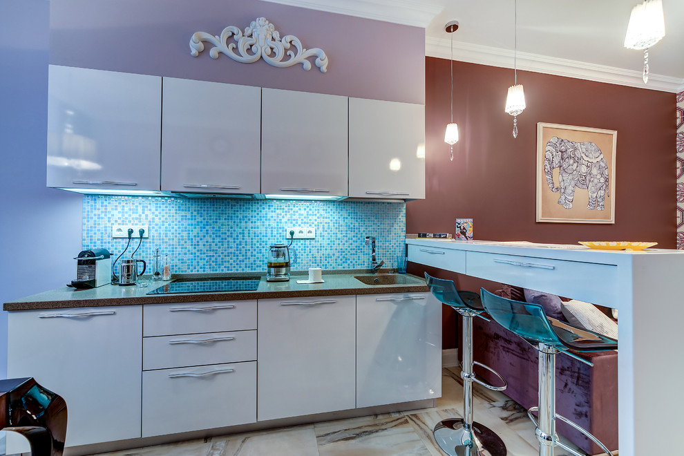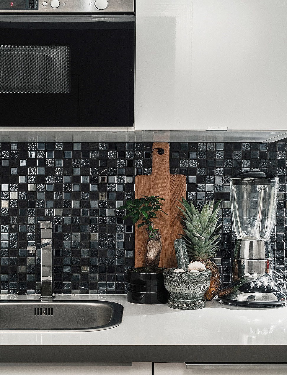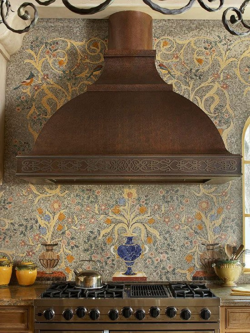 กำแพงการทำงาน ในห้องครัว เรียกว่าผ้ากันเปื้อน บริเวณนี้มีน้ำจาระบีดังนั้นจึงแนะนำให้วางกระเบื้องโมเสคผ้ากันเปื้อนออกซึ่งเป็นกระเบื้องขนาดเล็กปกติ