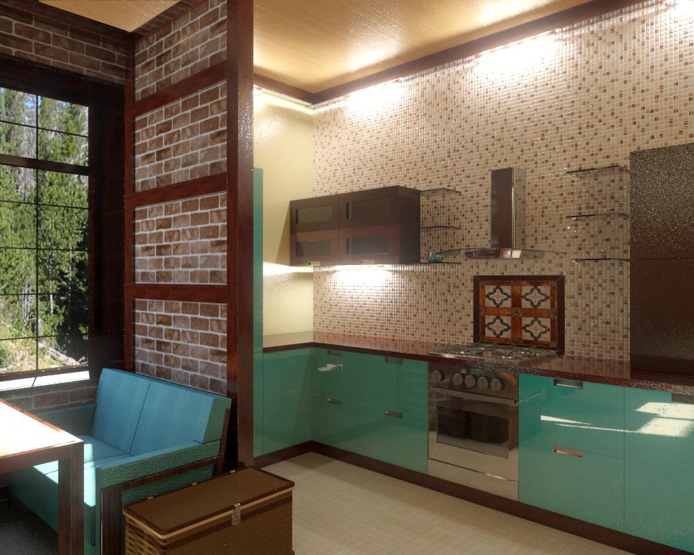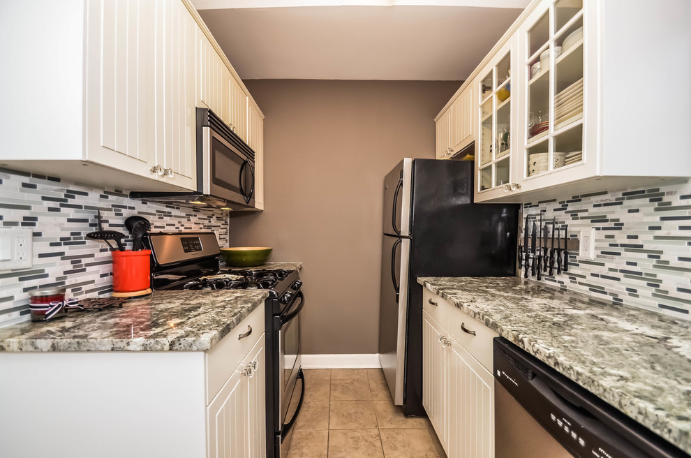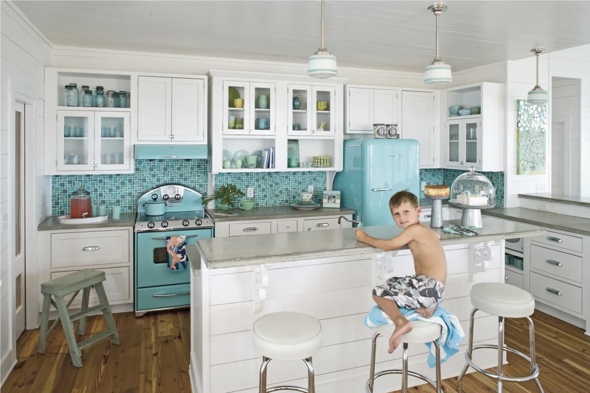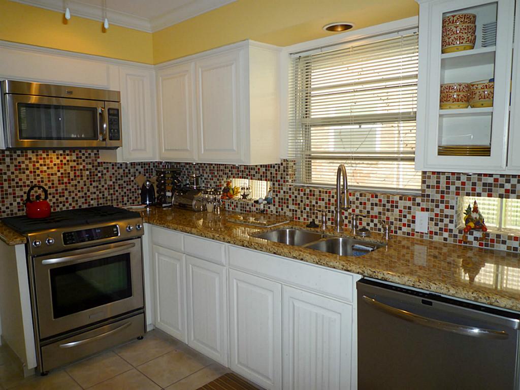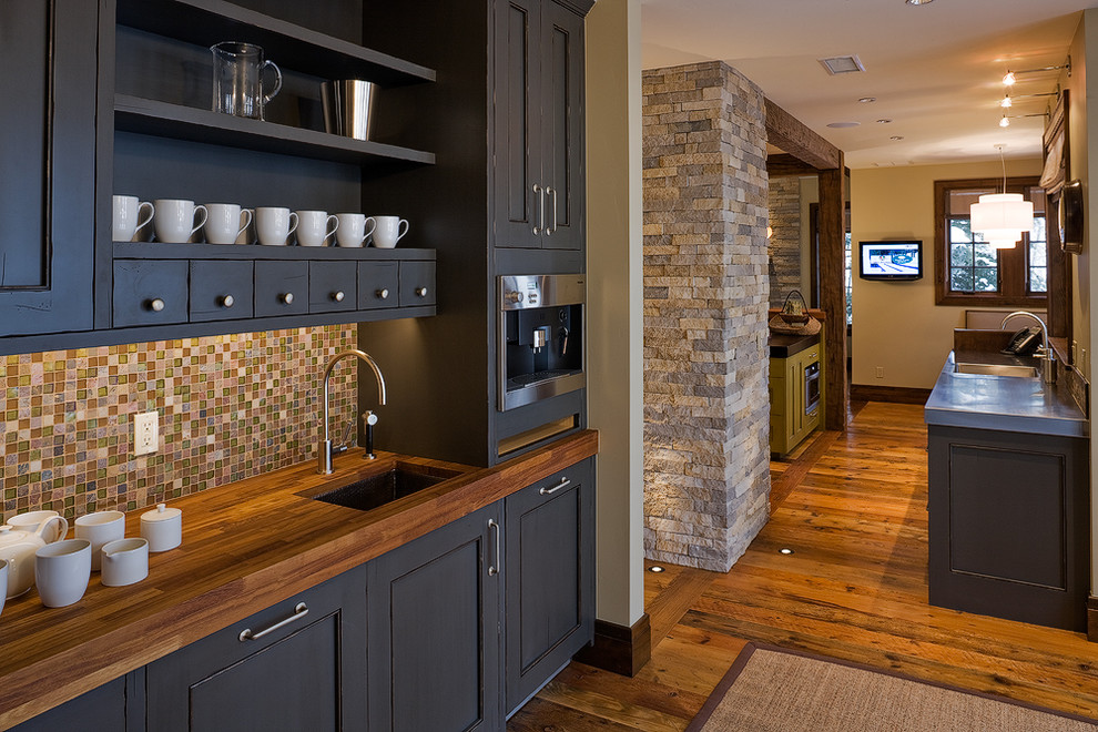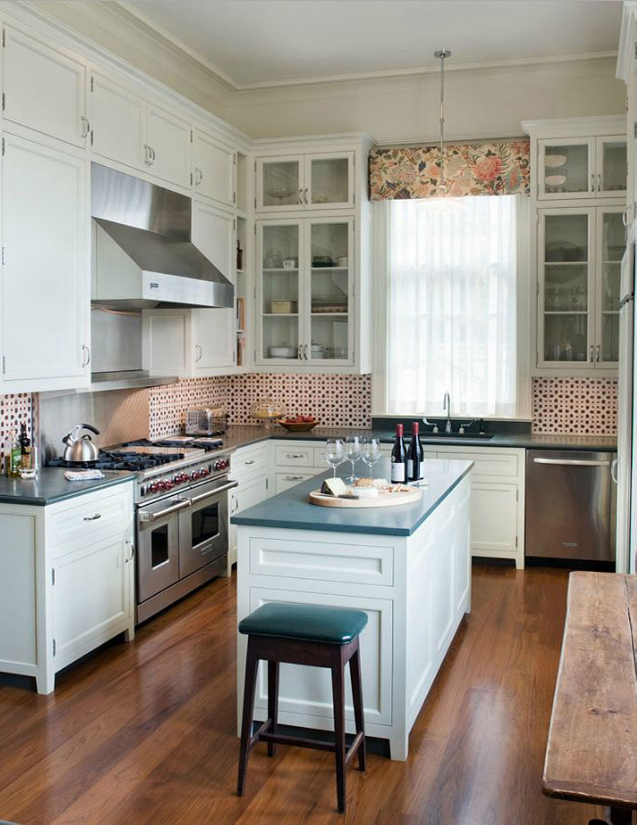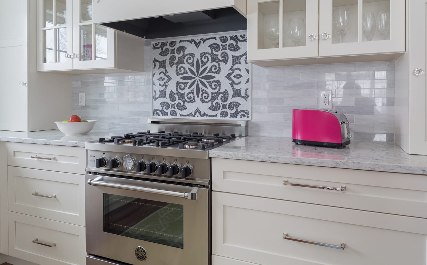 กำแพงการทำงาน ในห้องครัว เรียกว่าผ้ากันเปื้อน บริเวณนี้มีน้ำจาระบีดังนั้นจึงแนะนำให้วางกระเบื้องโมเสคผ้ากันเปื้อนออกซึ่งเป็นกระเบื้องขนาดเล็กปกติ