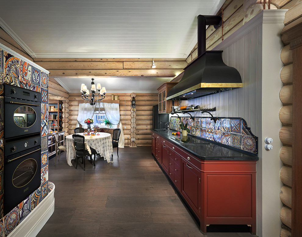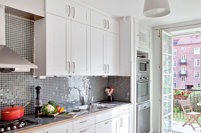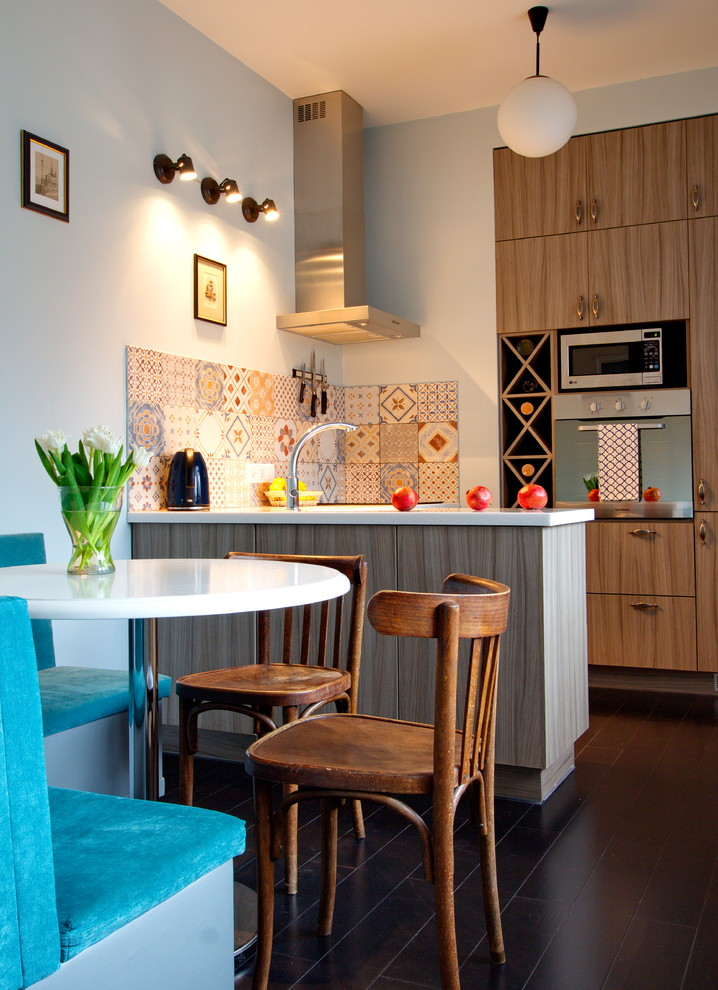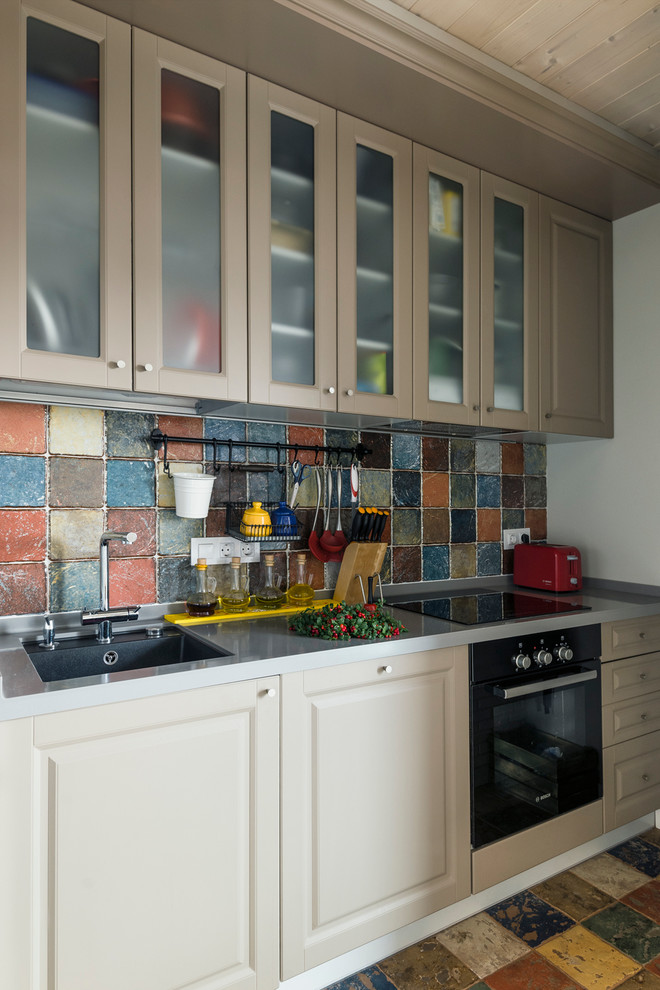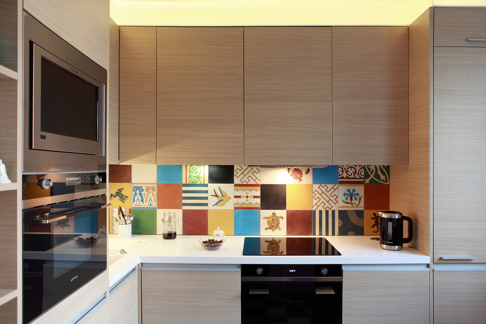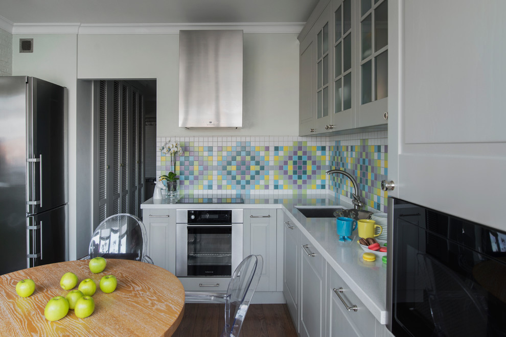 - ขนาดของกระเบื้องโมเสคเช่นเดียวกับการวาดภาพใด ๆ สามารถเปลี่ยนขนาดของห้องครัวได้ - องค์ประกอบขนาดใหญ่จะลดพื้นที่ในขณะที่ขนาดเล็กจะเพิ่มขึ้น