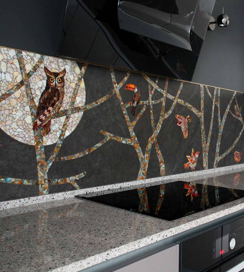 ที่นี่คุณจะได้เรียนรู้เกี่ยวกับโมเสกบนผ้ากันเปื้อนในครัวคุณสมบัติทั่วไปและจานสี และยังเกี่ยวกับการผสมผสานและวัสดุที่เป็นไปได้สำหรับการผลิต